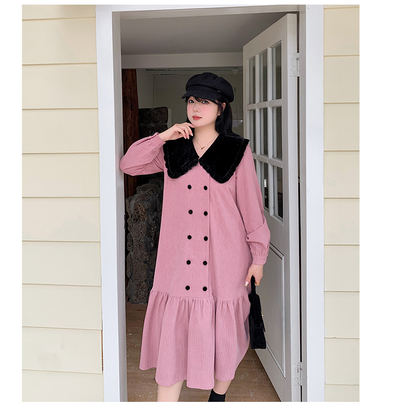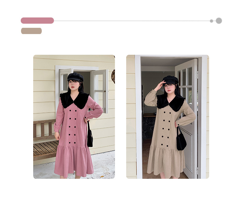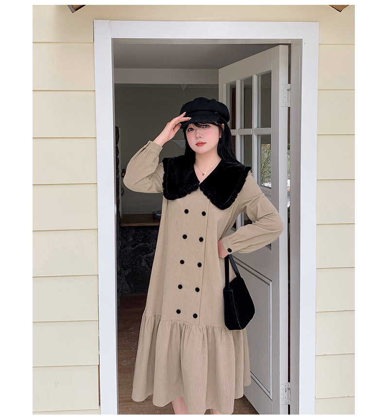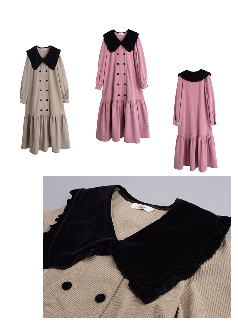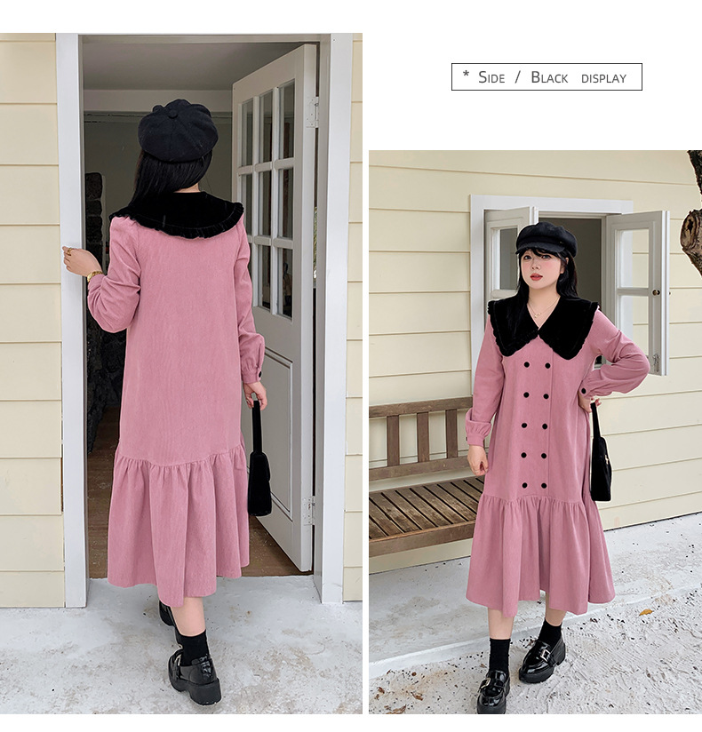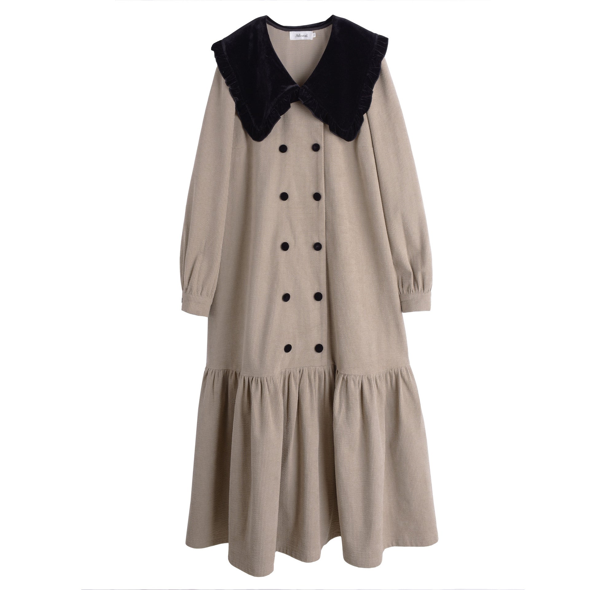 大きなラペルのコーデュロイワンピースは、柔らかくて厚手の伸縮性のある縦縞のニットコーデュロイ生地で作られています。襟はフリル付きの大きな黒いラペルで、裾のフリルと合わせた上品なデザインです。ダブルブレスト仕様で、フロントボタンは開けられません。とても人気のあるゆったりとしたHラインで、年齢を問わず体型をカバーします。大人かわいいワンピースを是非お試しください。