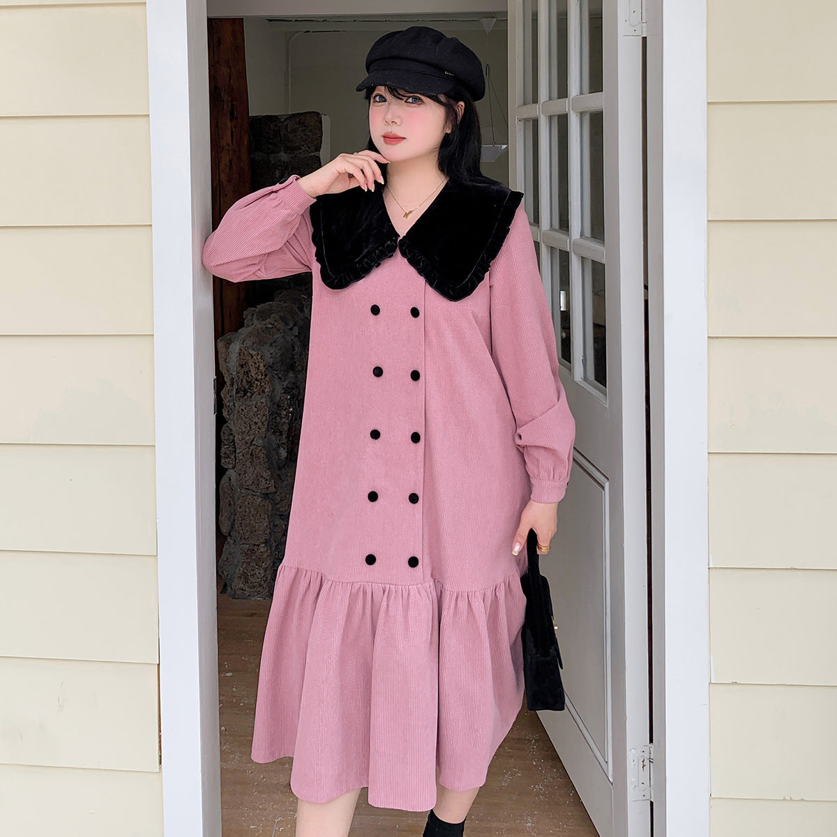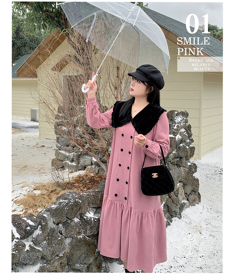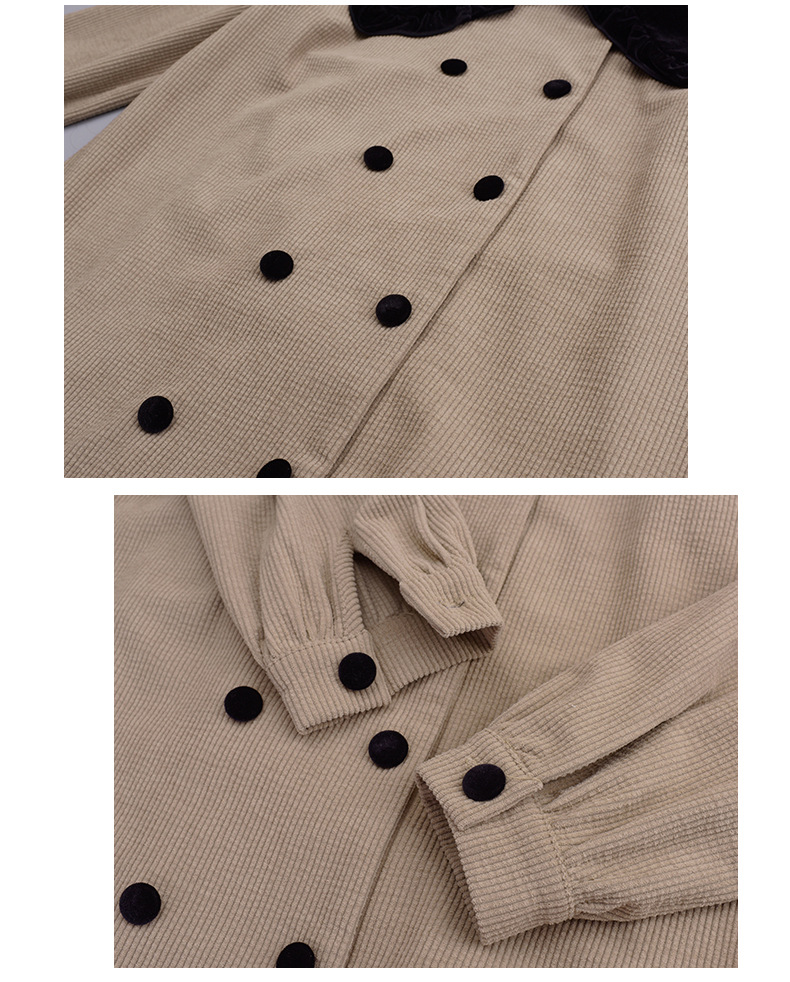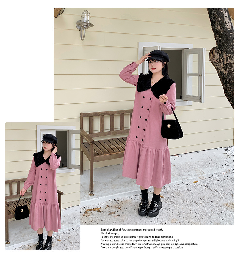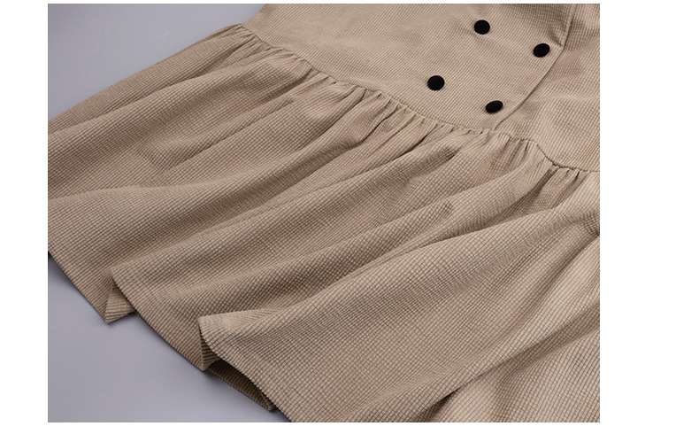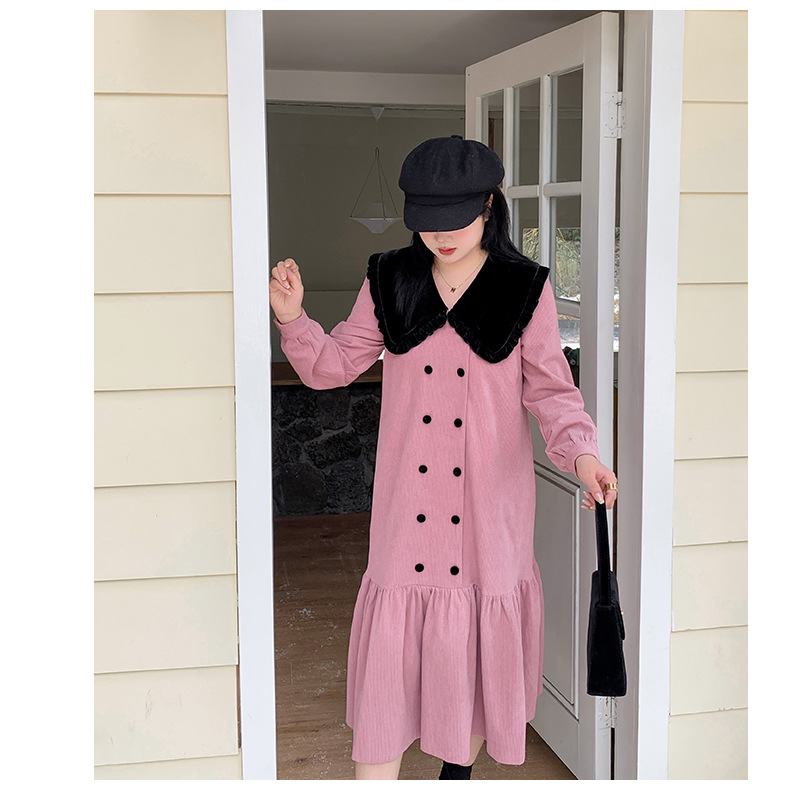 大きなラペルのコーデュロイワンピースは、柔らかくて厚手の伸縮性のある縦縞のニットコーデュロイ生地で作られています。襟はフリル付きの大きな黒いラペルで、裾のフリルと合わせた上品なデザインです。ダブルブレスト仕様で、フロントボタンは開けられません。とても人気のあるゆったりとしたHラインで、年齢を問わず体型をカバーします。大人かわいいワンピースを是非お試しください。