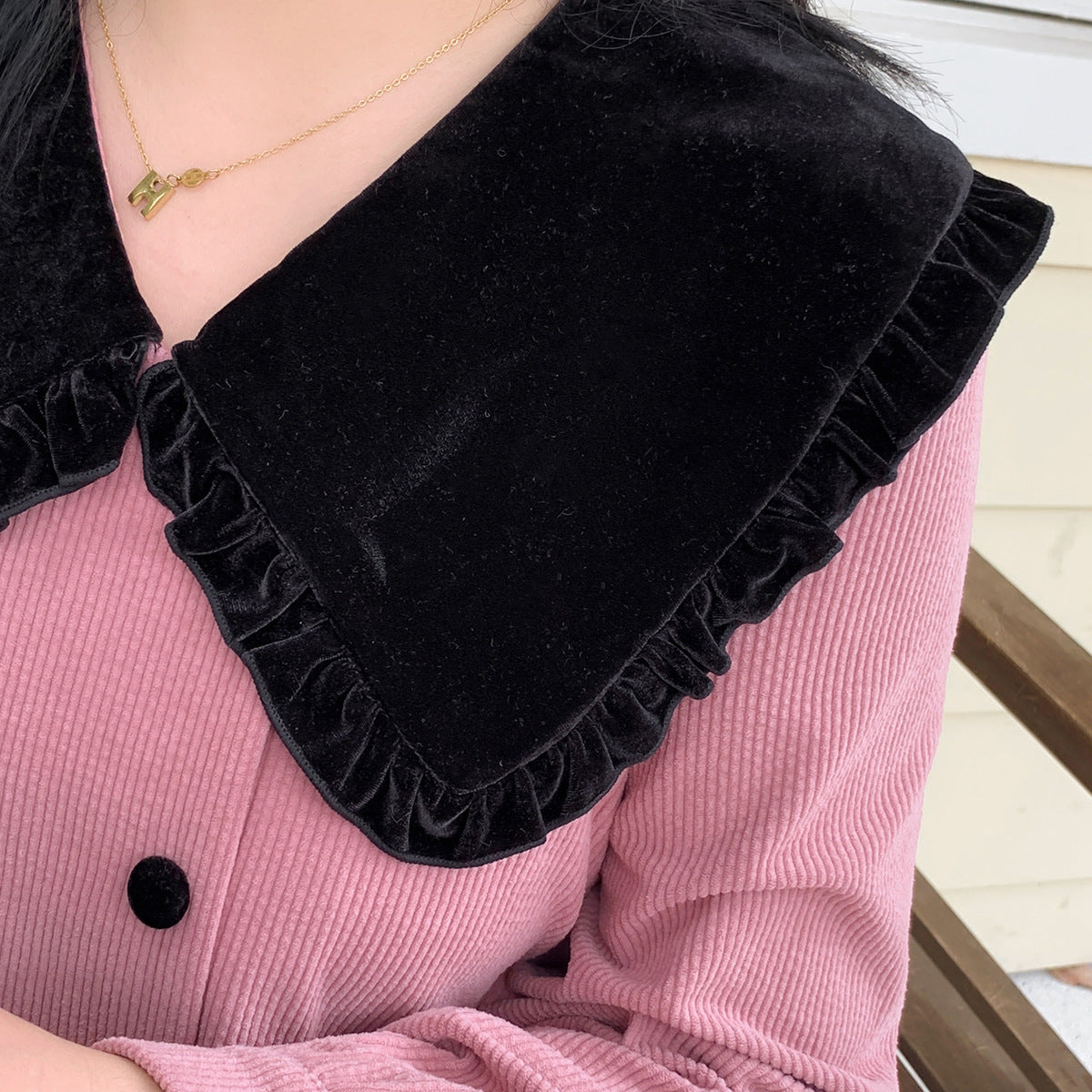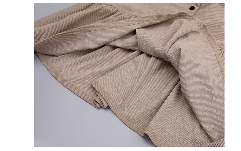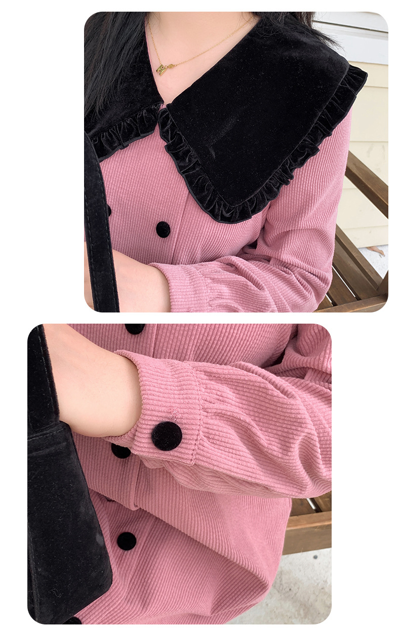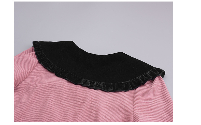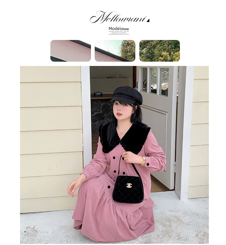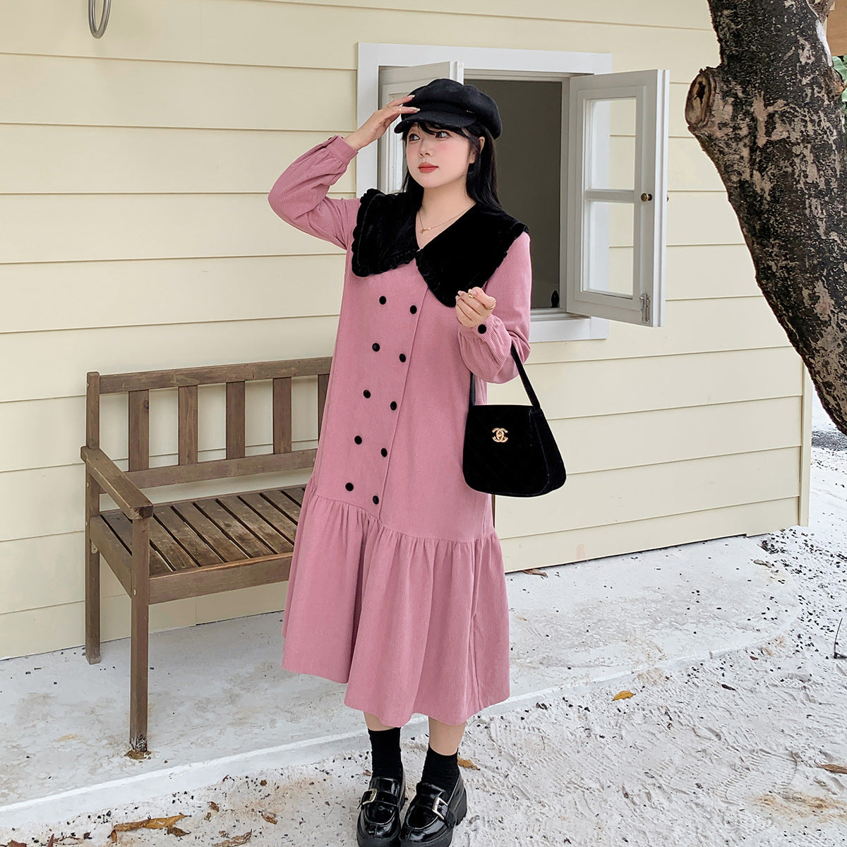 大きなラペルのコーデュロイワンピースは、柔らかくて厚手の伸縮性のある縦縞のニットコーデュロイ生地で作られています。襟はフリル付きの大きな黒いラペルで、裾のフリルと合わせた上品なデザインです。ダブルブレスト仕様で、フロントボタンは開けられません。とても人気のあるゆったりとしたHラインで、年齢を問わず体型をカバーします。大人かわいいワンピースを是非お試しください。