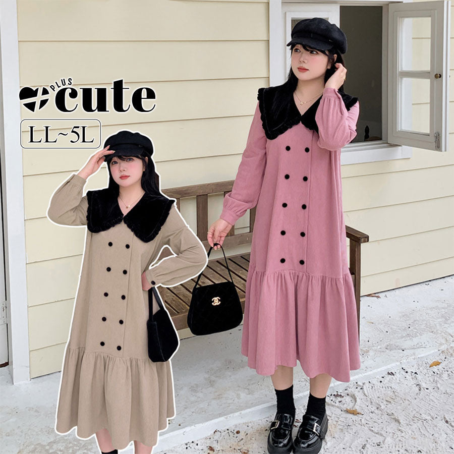 大きいサイズ レディース ビックラペルフリルコーデュロイワンピース LL 3L 4L 5L