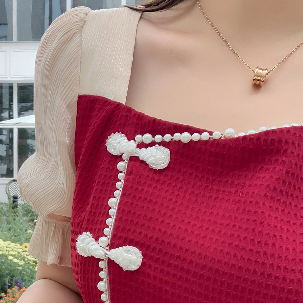 スクエアネック&アシンメトリーなデザインで、ネックラインにはパールが施されており、より華やかさを演出☆