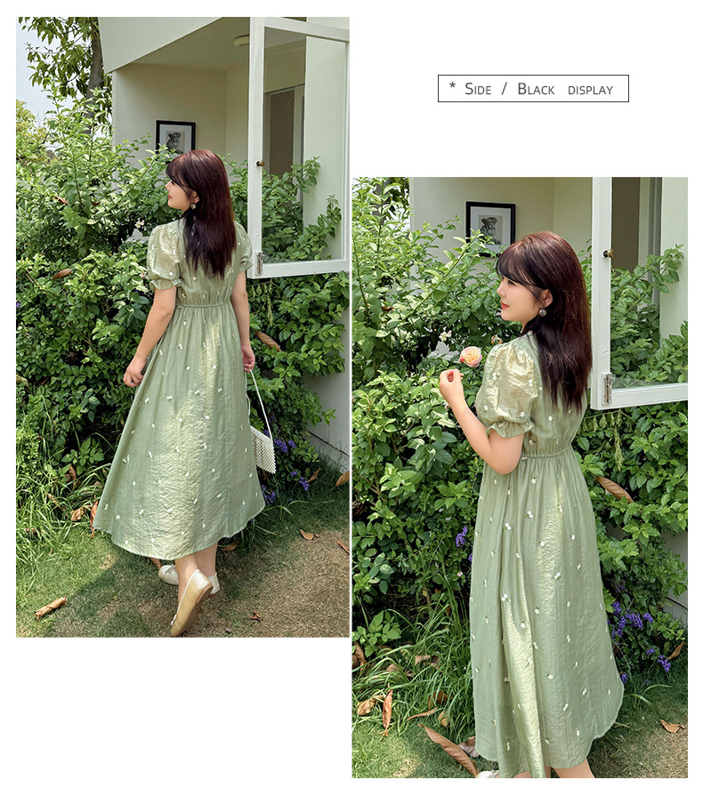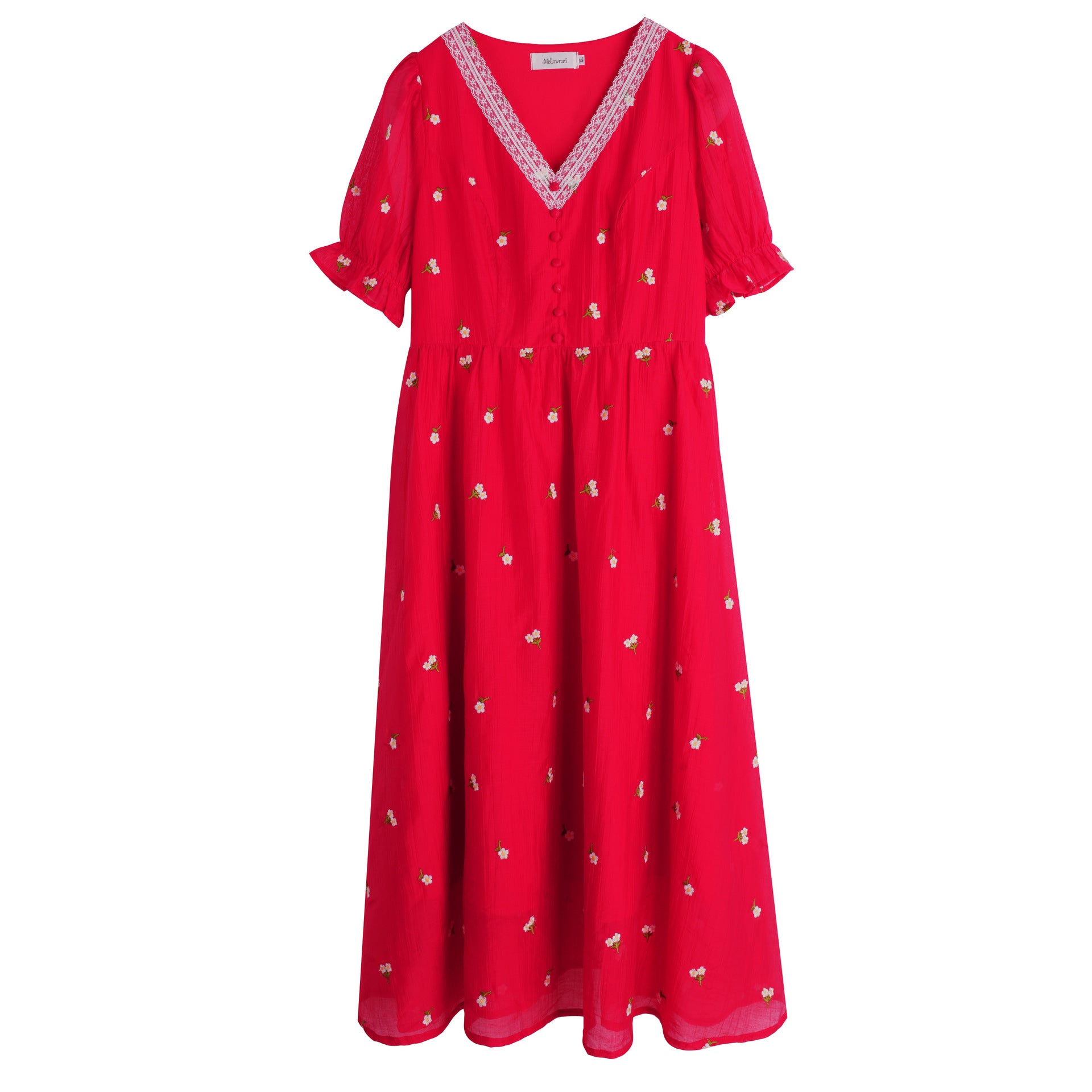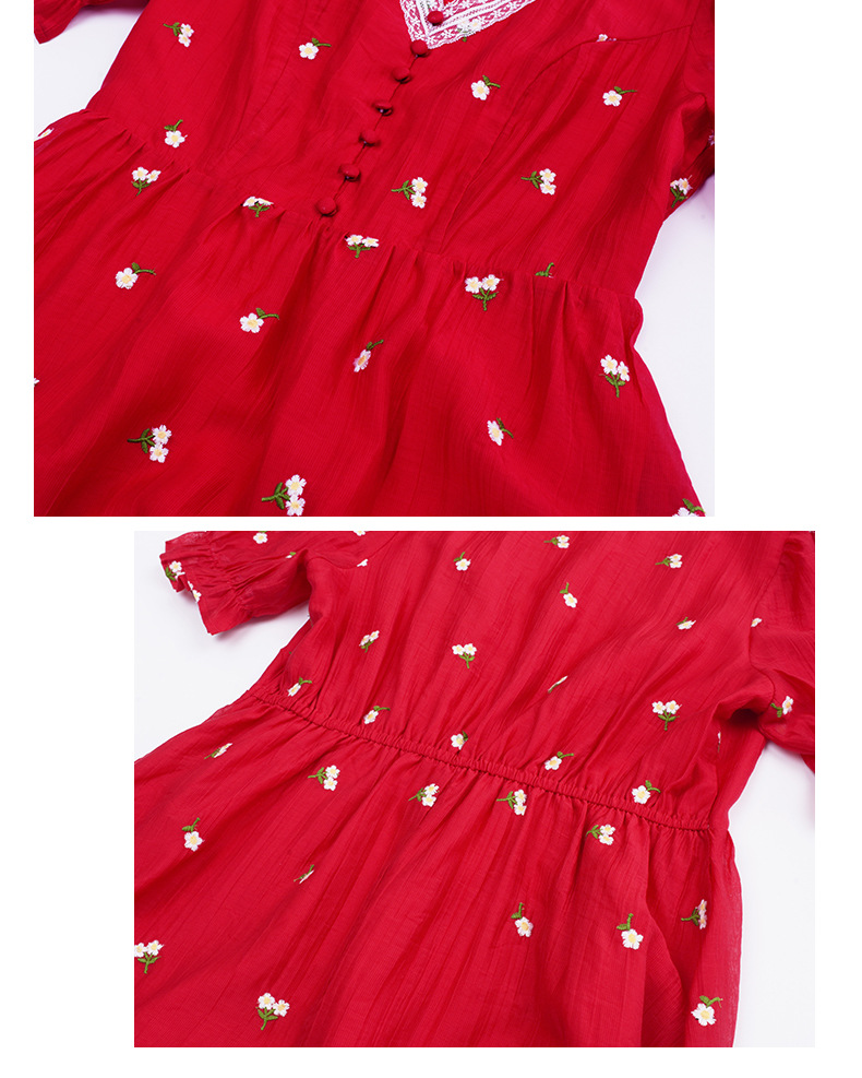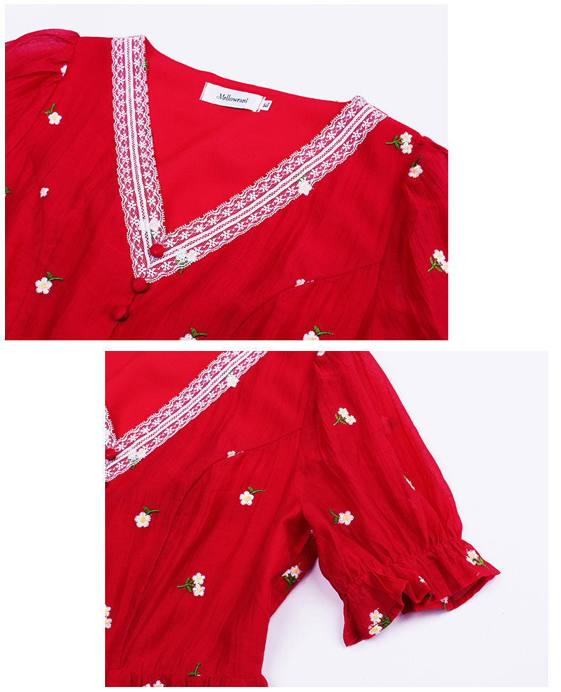 Vネックの刺繍ワンピースは、軽くて流れるようなテンセルクレープ生地で作られており、縦方向のクレープ感があり、柔らかい肌触りです。表面には、かわいらしい刺繍の花が散りばめられており、繊細な刺繍が印象的です。Vネックのデザインは、ネックラインを長く見せるだけでなく、よりエレガントでスリムな体型を演出します。またネックラインには繊細な模様と柔らかな質感の美しいレースが施されています。フロントにボタン、パフスリーブ、袖口はゴム仕様です。バックウエストは伸縮性があり、様々な体型や動きに対応し、ウエストラインを強調するデザインです。ドレスの裾がゆったりと流れ、エレガントな雰囲気です。