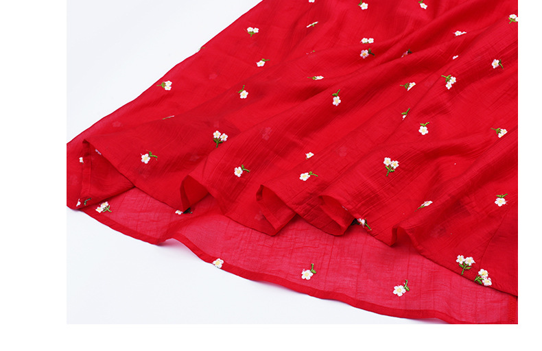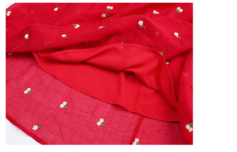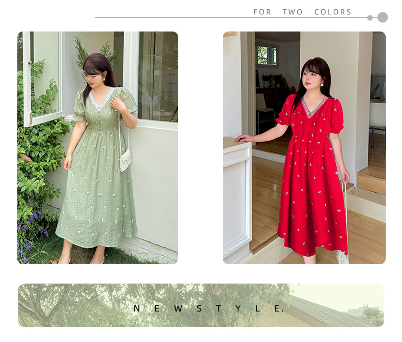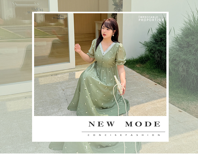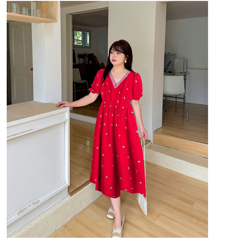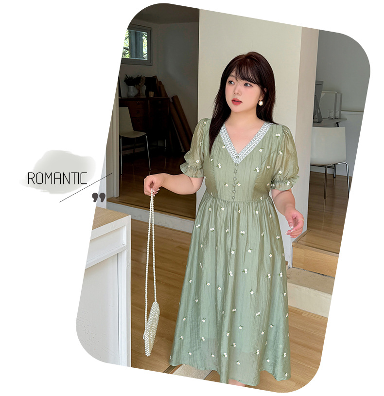 Vネックの刺繍ワンピースは、軽くて流れるようなテンセルクレープ生地で作られており、縦方向のクレープ感があり、柔らかい肌触りです。表面には、かわいらしい刺繍の花が散りばめられており、繊細な刺繍が印象的です。Vネックのデザインは、ネックラインを長く見せるだけでなく、よりエレガントでスリムな体型を演出します。またネックラインには繊細な模様と柔らかな質感の美しいレースが施されています。フロントにボタン、パフスリーブ、袖口はゴム仕様です。バックウエストは伸縮性があり、様々な体型や動きに対応し、ウエストラインを強調するデザインです。ドレスの裾がゆったりと流れ、エレガントな雰囲気です。