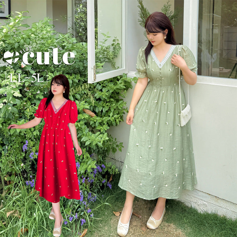 大きいサイズ レディース レースVネックフラワー刺繍ワンピース LL 3L 4L 5L