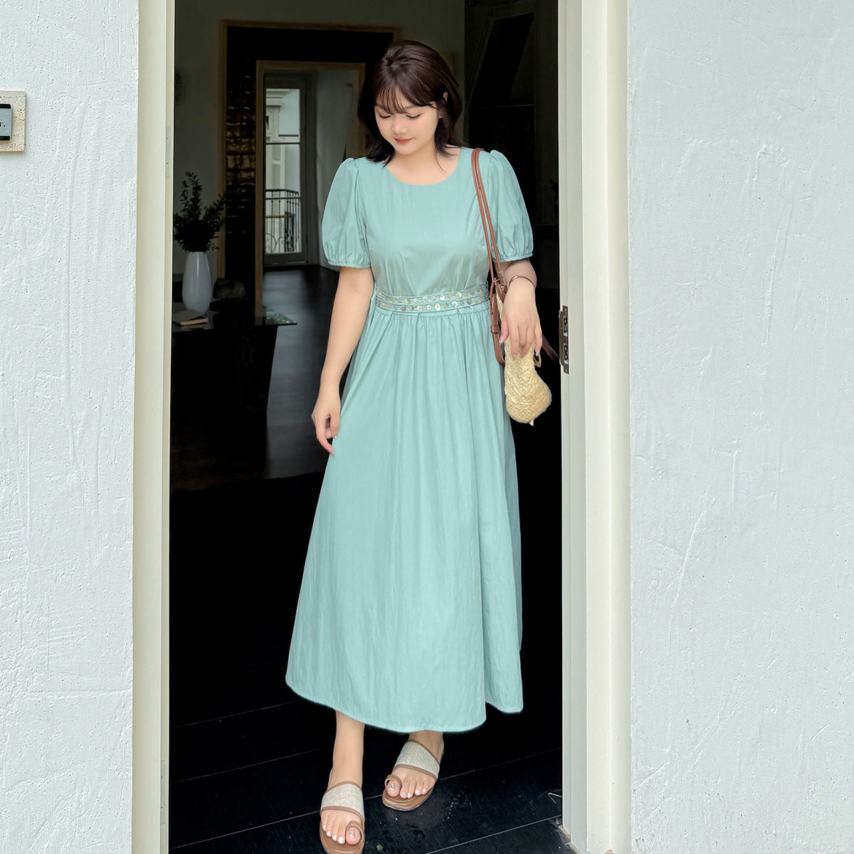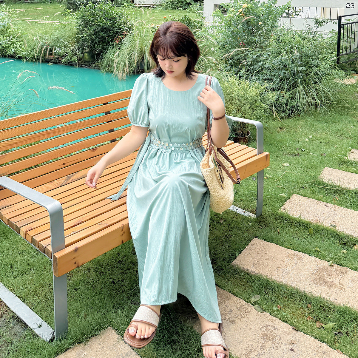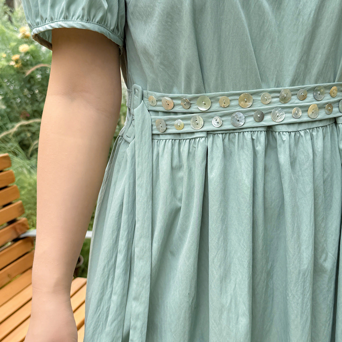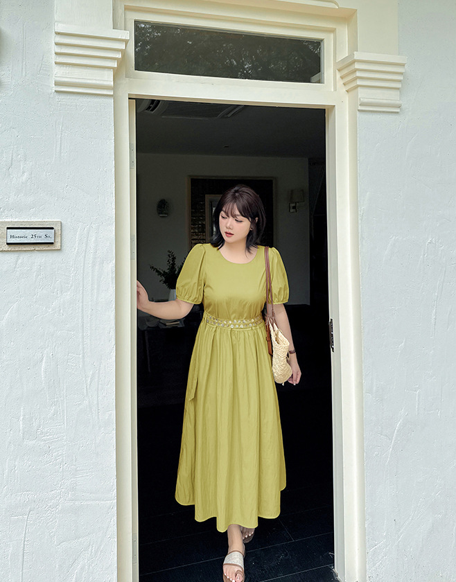 ゆったりとしたラウンドネックのカジュアルワンピースのハイライトは、ウエストのダブルベルトデザインです。貝殻風の装飾バックルで飾られ、光沢感があり、それぞれの異なる質感がおしゃれです。レリクレープ生地の表面はわずかにしわがあり、パリッとしていて、爽やかで通気性に優れています。シンプルで小さなラウンドネック、パフスリーブ、ゆったりした快適な着心地です。ベルトにはサイズ調整用のバックルが付いています。後ろには隠しファスナーデザインがあり、着脱が簡単です。シンプルで大人おしゃれなゆったりワンピースを是非お試しください。