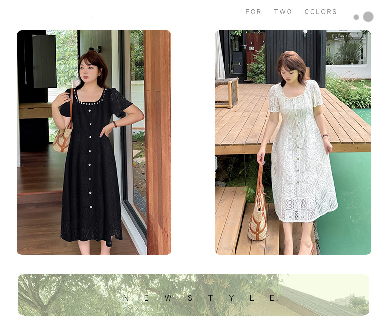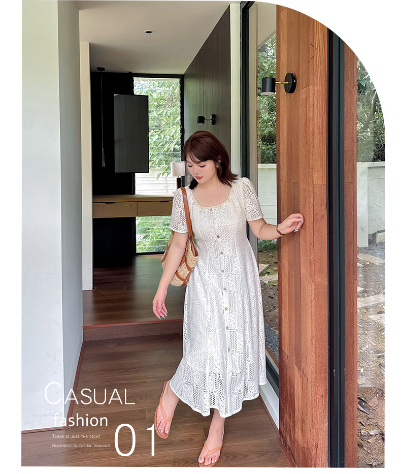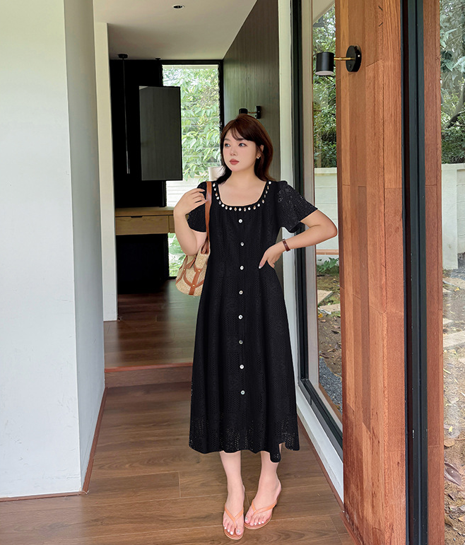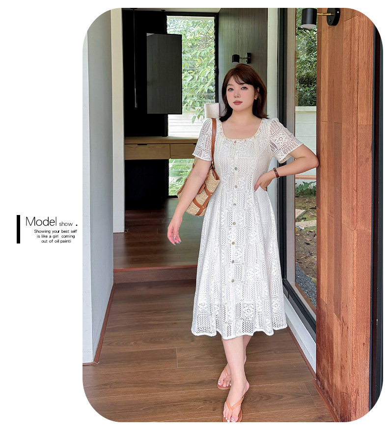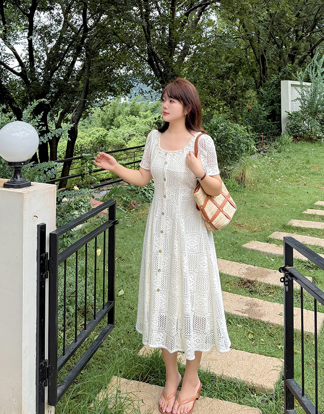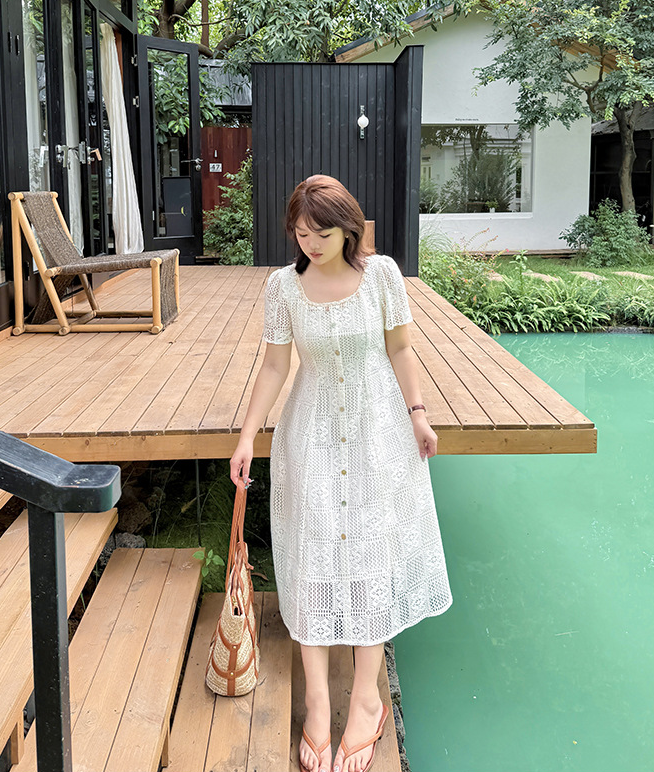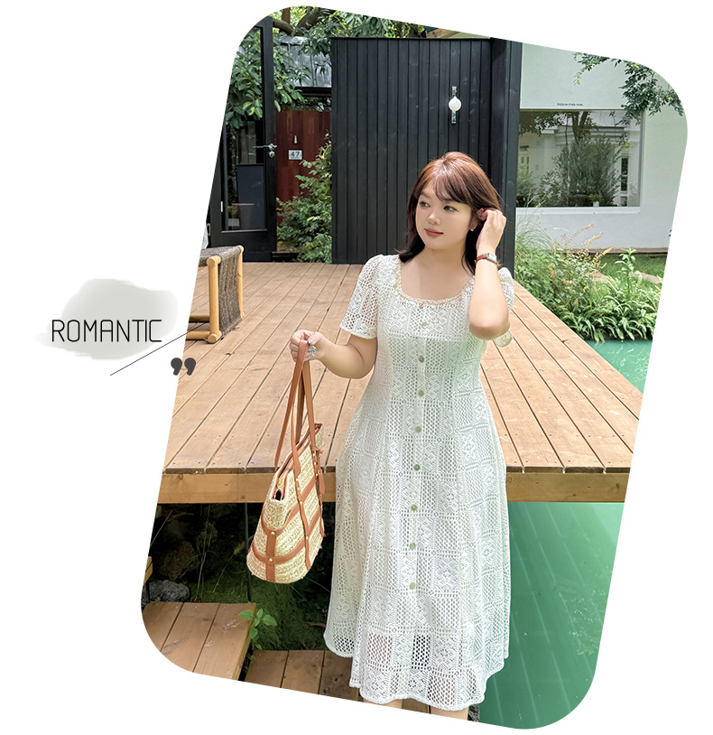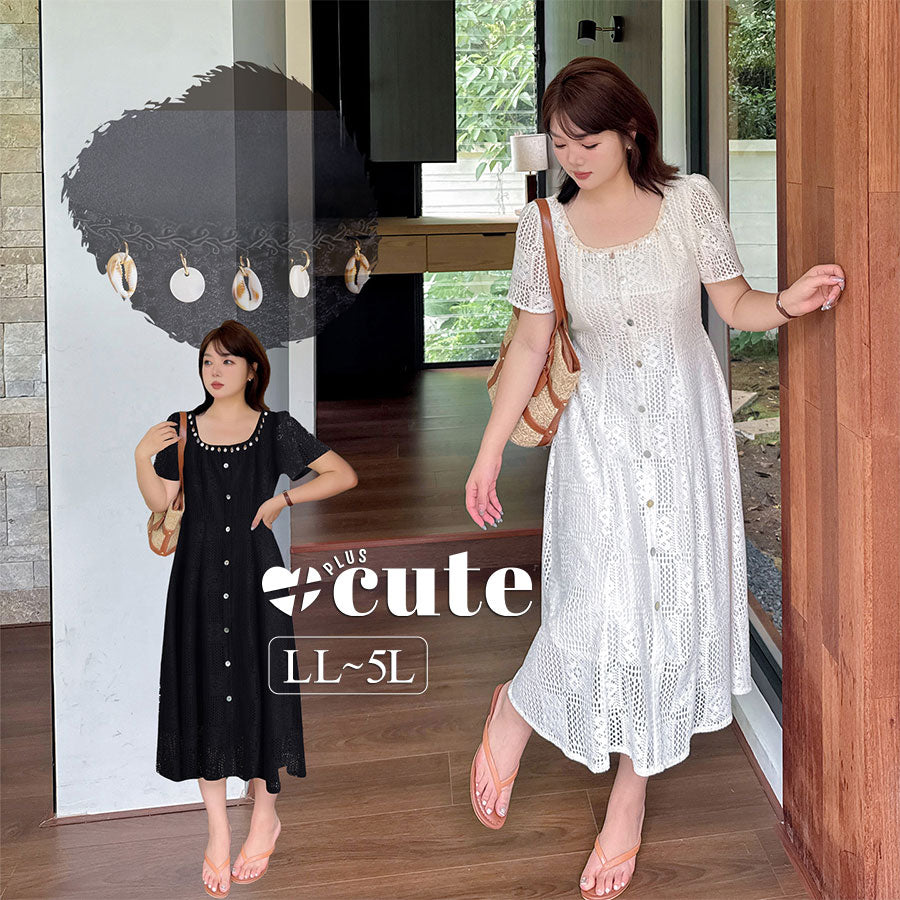 大きいサイズ レディース スクエアネック貝殻型飾り付き中空レースワンピース LL 3L 4L 5L