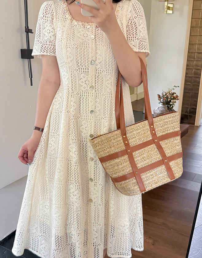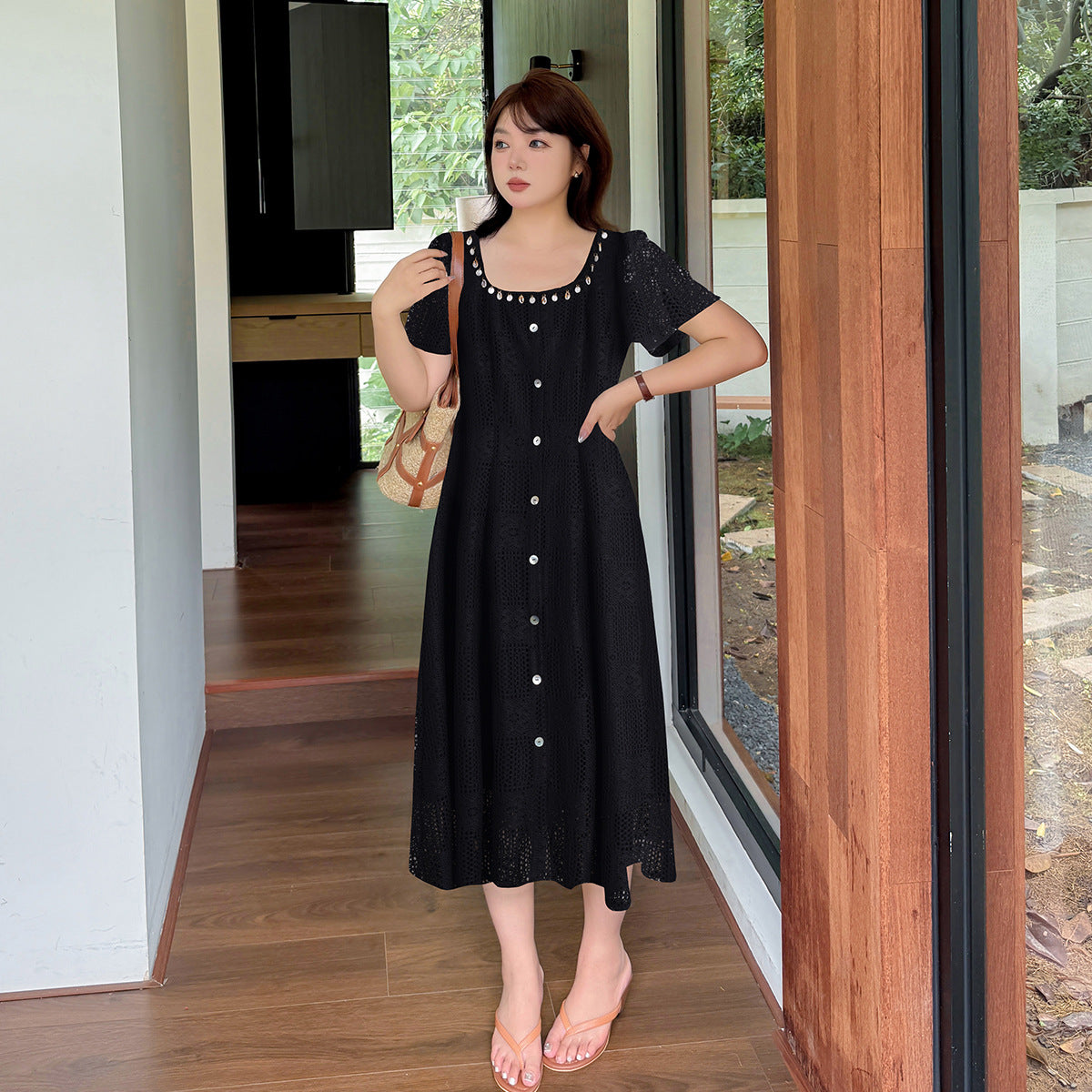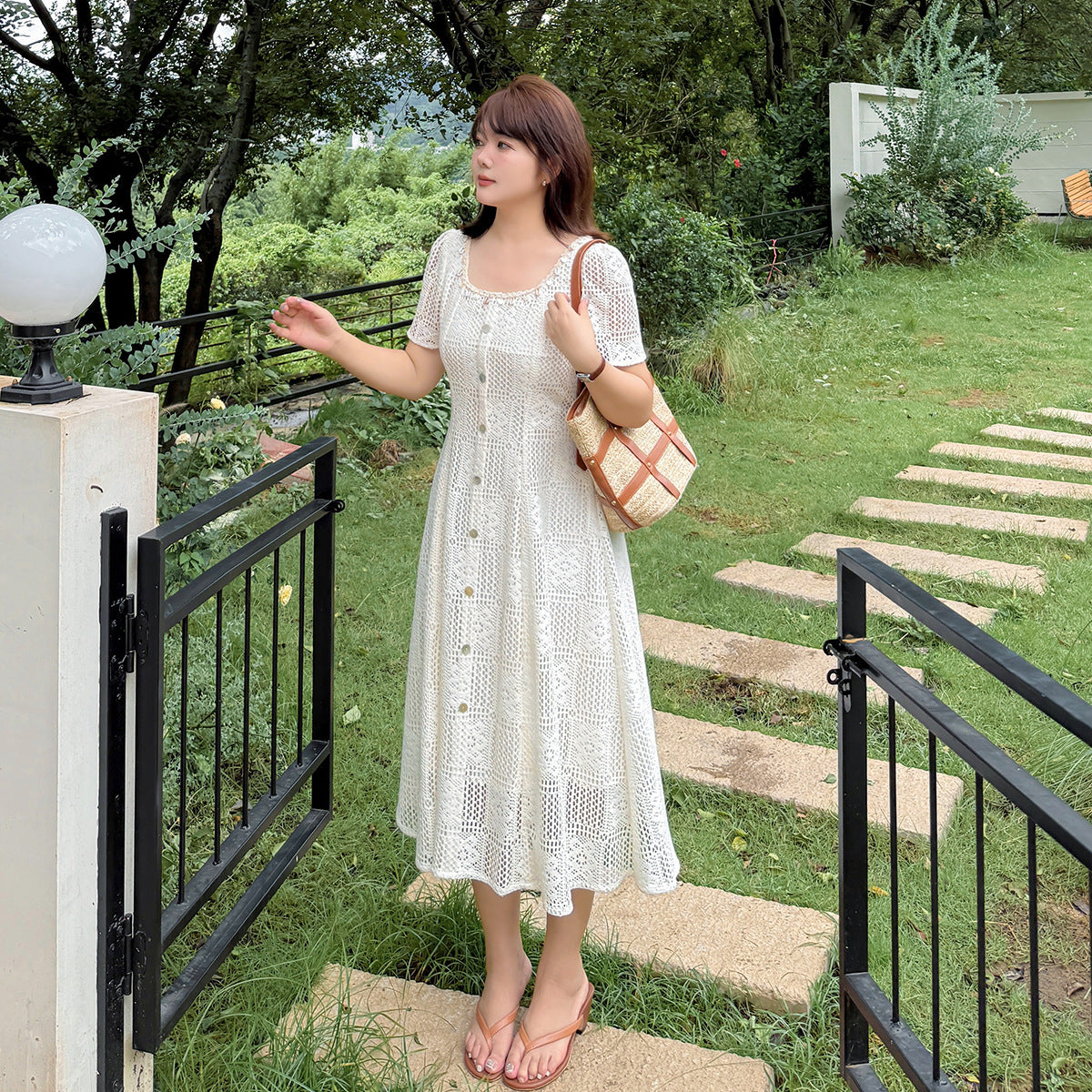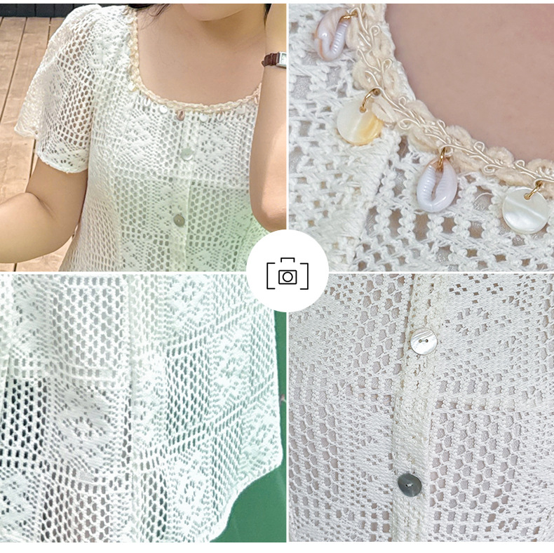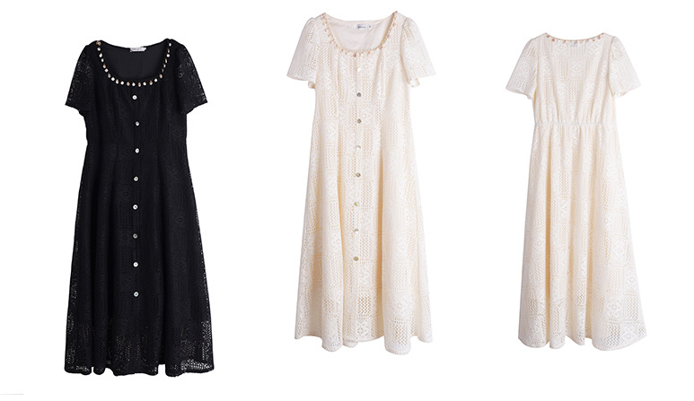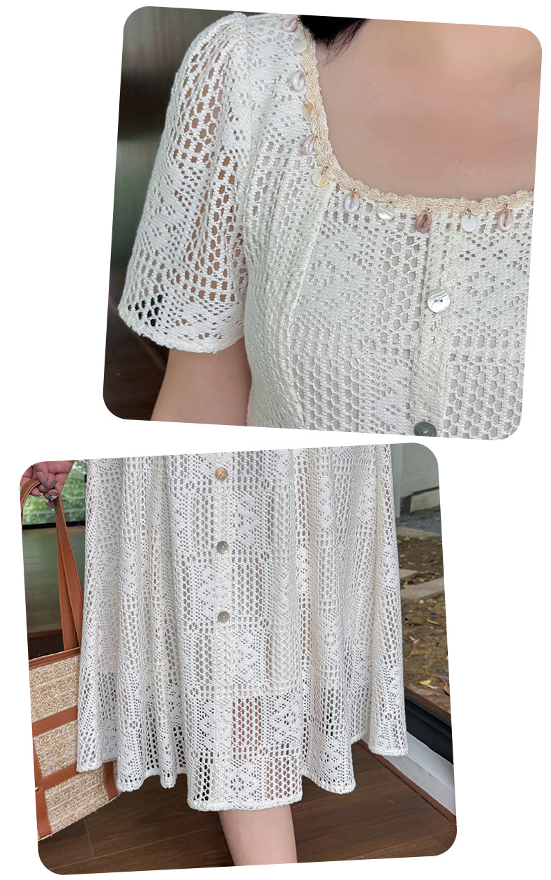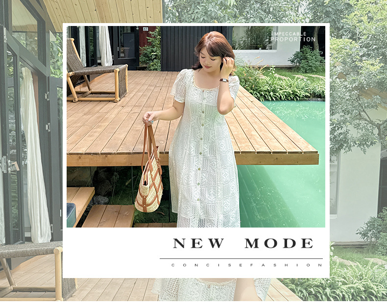 大きいサイズ レディース スクエアネック貝殻型飾り付き中空レースワンピース LL 3L 4L 5L
