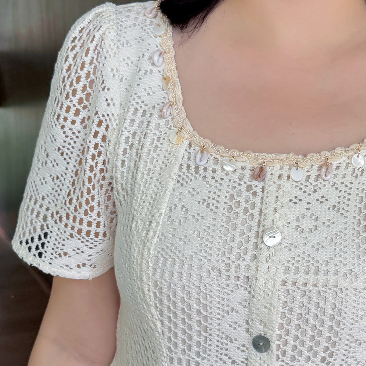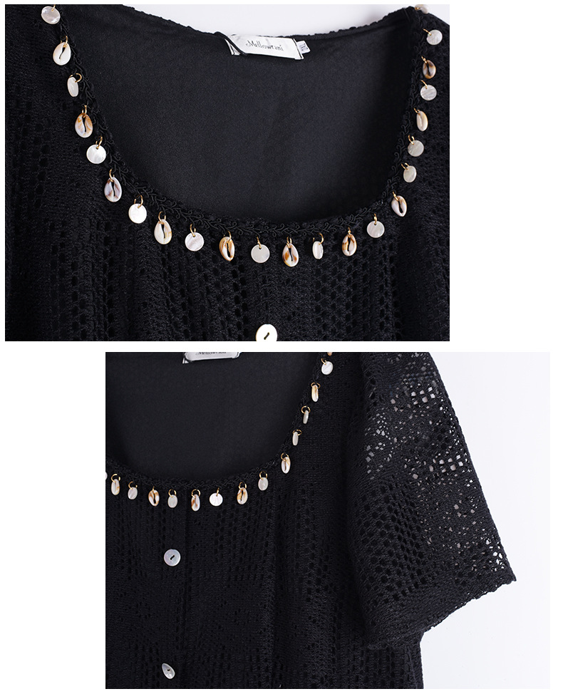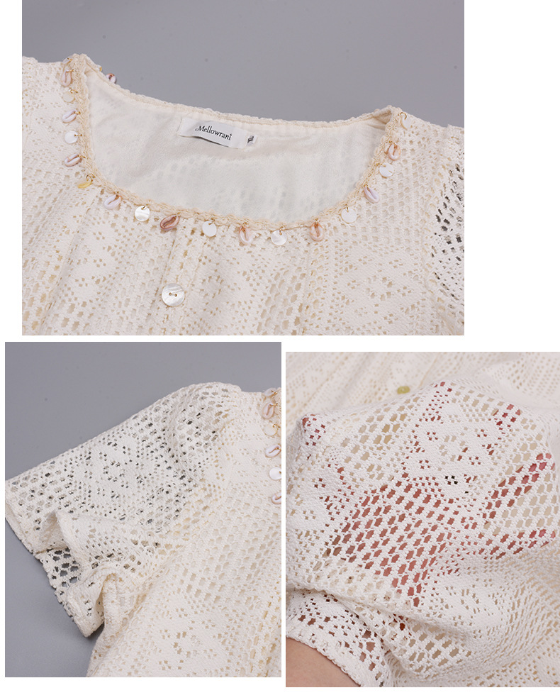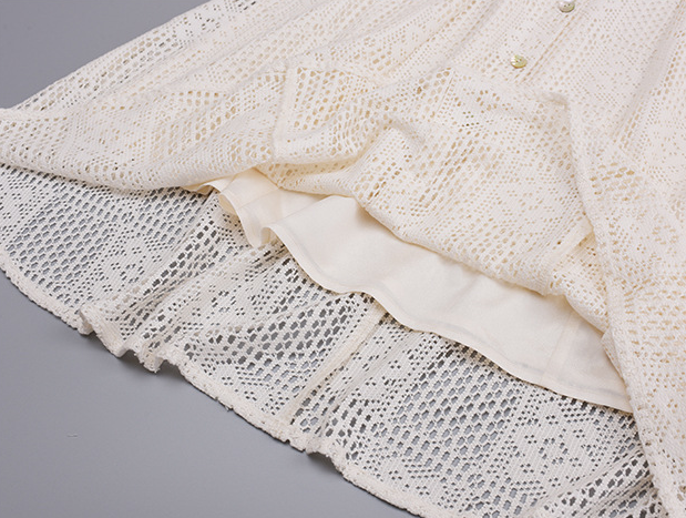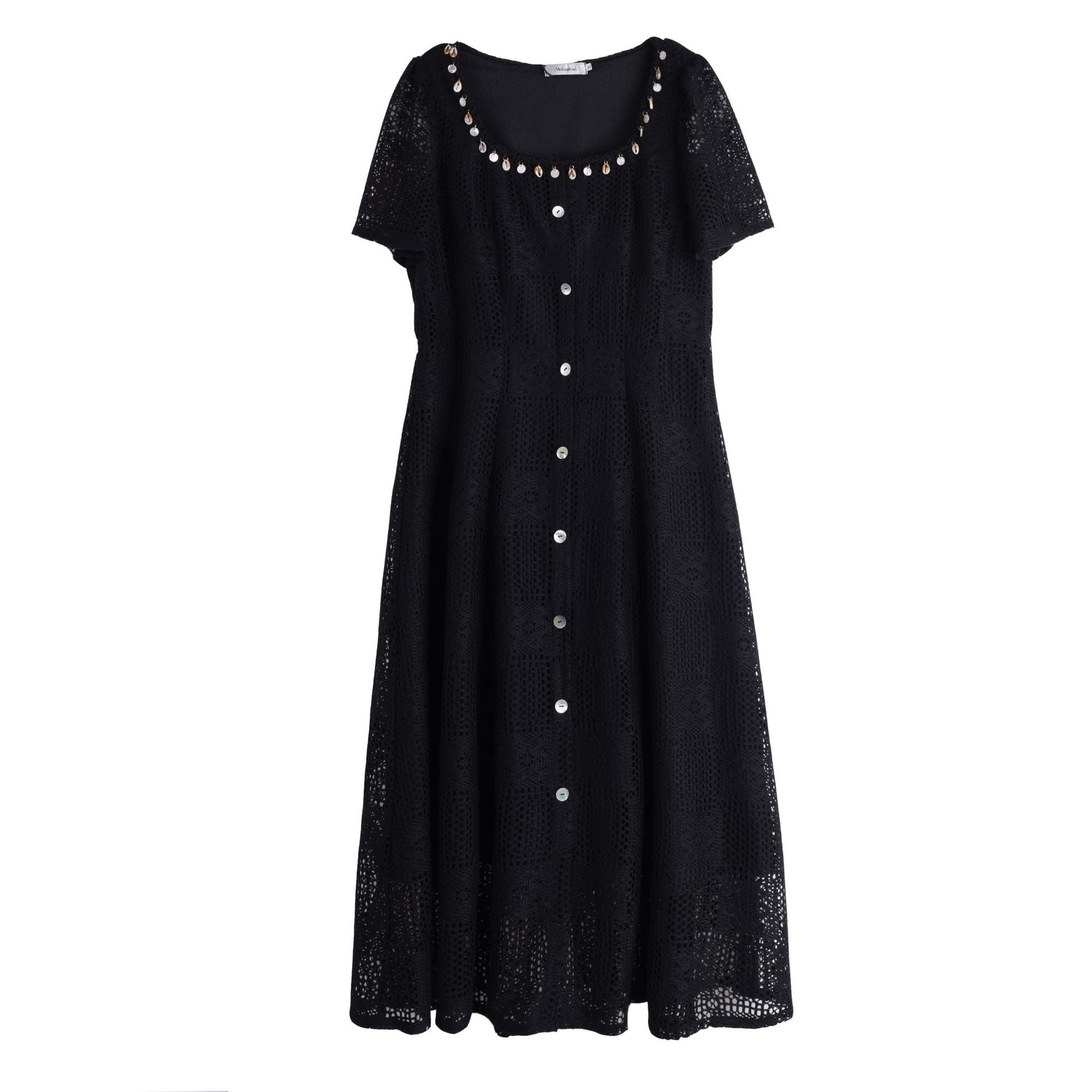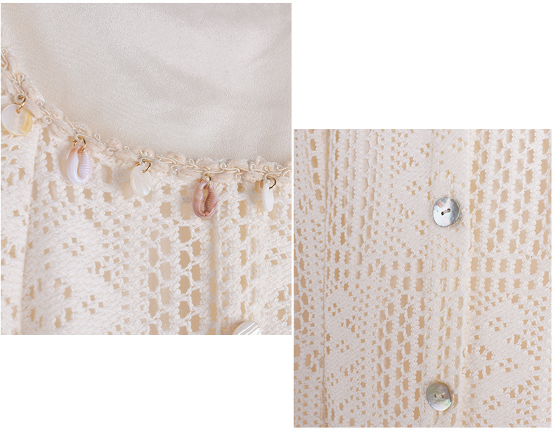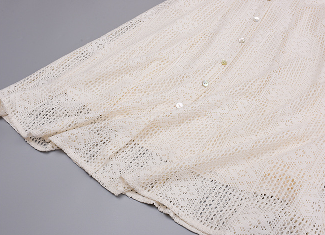 貝殻型飾り付きレースワンピースは、重量感がありドレープ性に優れ、大きな中空クロシェレース生地を使用しています。貝殻型のリボンタッセルが付いたスクエアネックラインで、フロント中央の前立てに装飾的な貝ボタンがデザインされています。伸縮性のあるバックウエストでスッキリとしたスタイルで、素敵なレースワンピースを是非お試しください。
