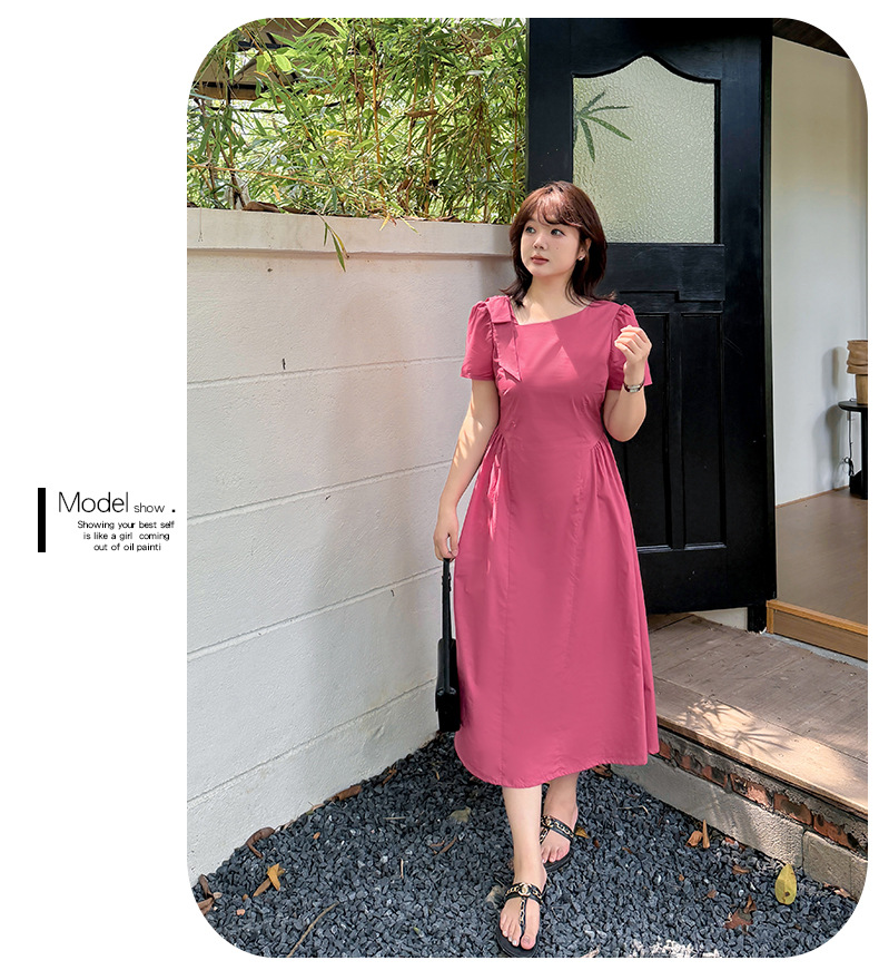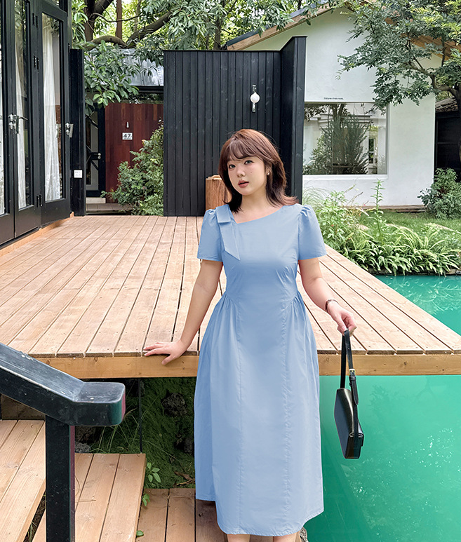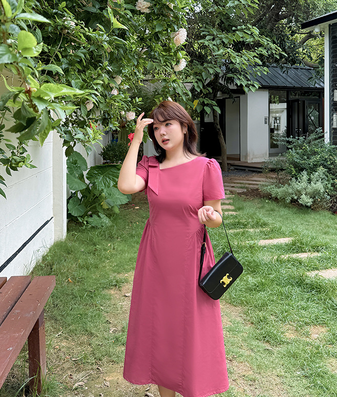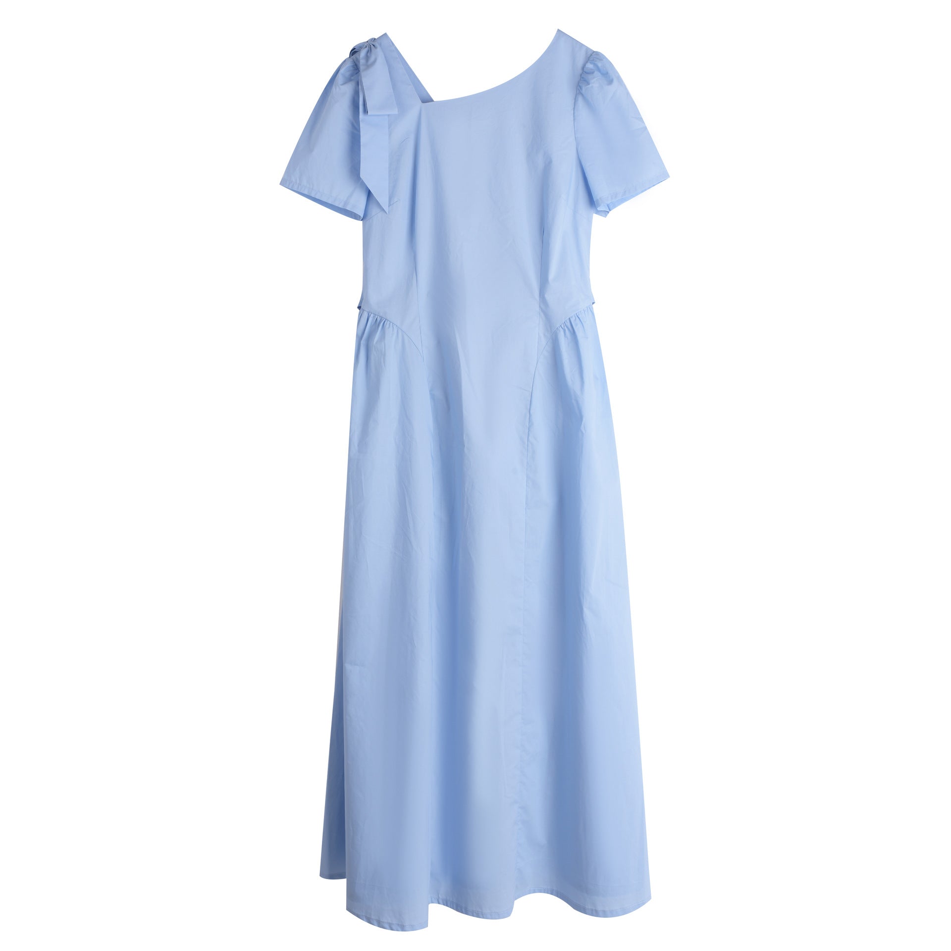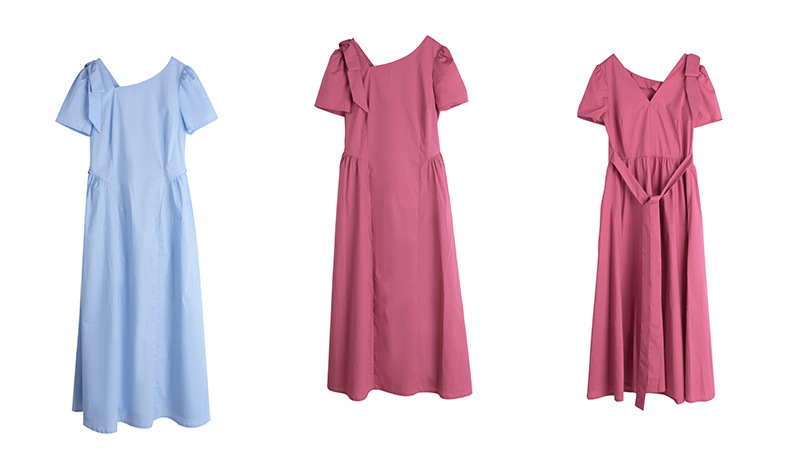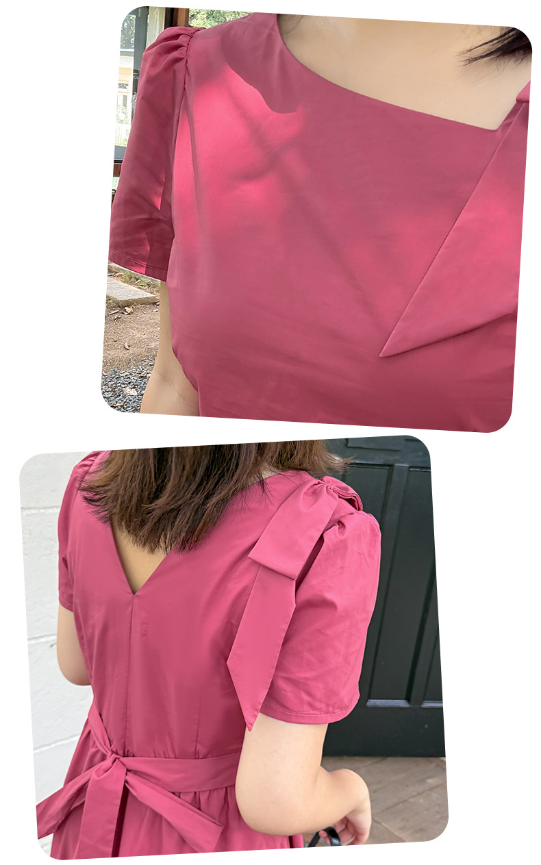 純色でアシンメトリーなデザインのコットンワンピース。通気性と吸汗性に優れ、暑い夏の日にぴったりです。ワンピースのデザインのポイントは、アシンメトリーな襟のデザインです。フロント部分は斜めになっており、バック部分は深いV字型で背中が大きく開いています。片方の肩に立体的なリボンが飾られ、サイドシームに隠しファスナーが付いているので、プルオーバーとしても着用できます。ベルトは前でも後ろでもリボンで結べます。ミドル丈のスカートでセンスと魅力を兼ね備えたワンピースを是非お試しください。