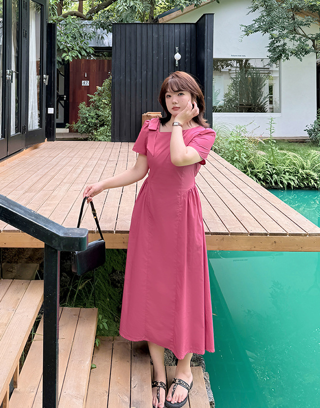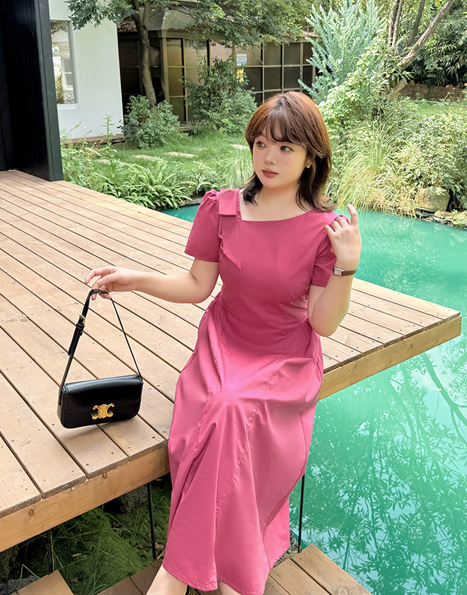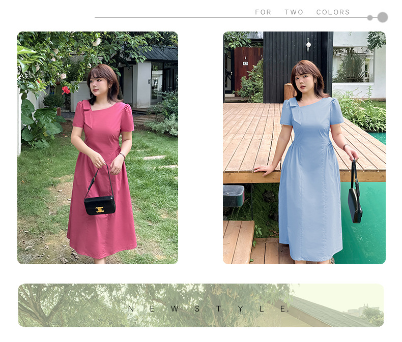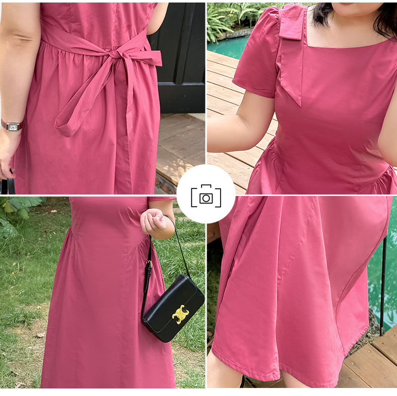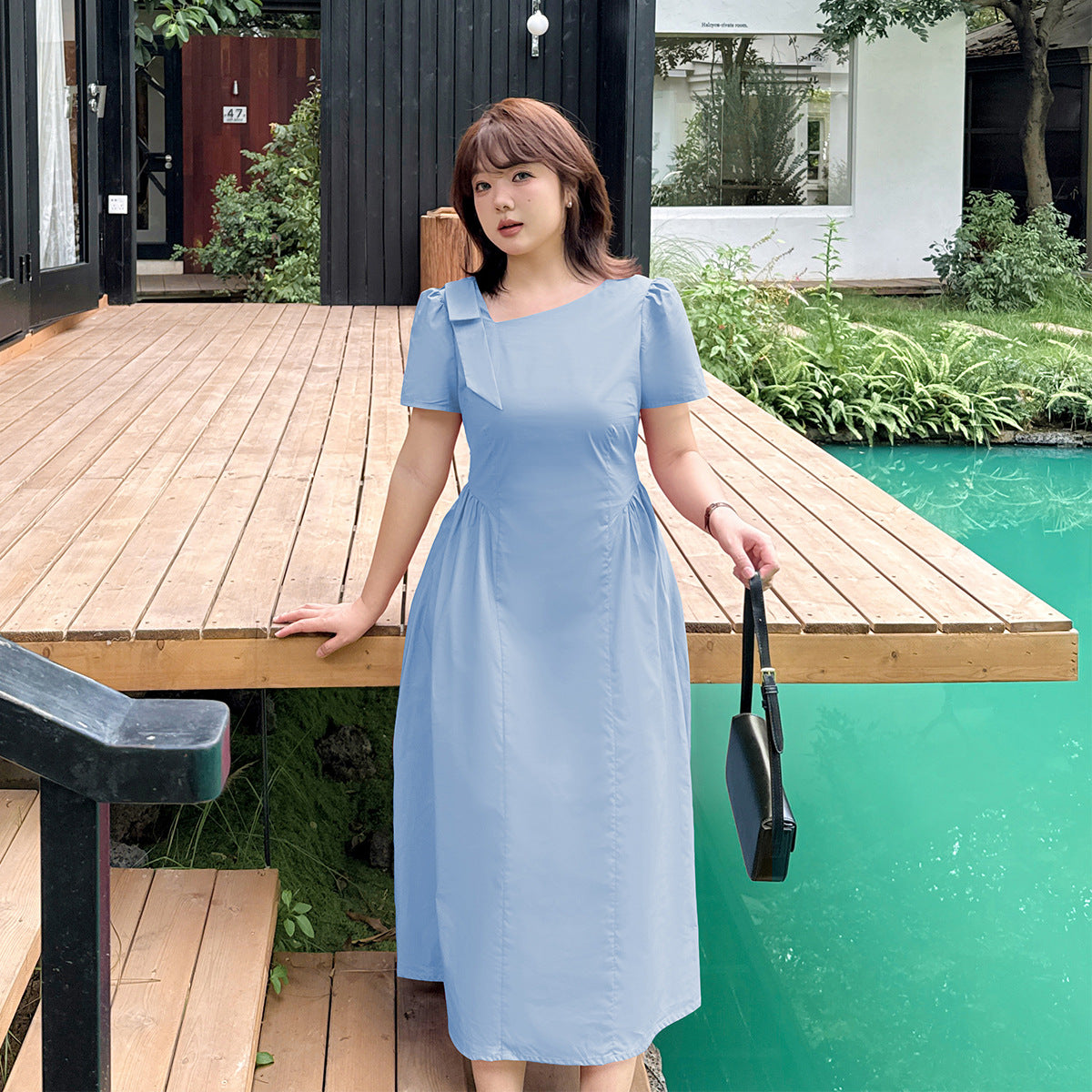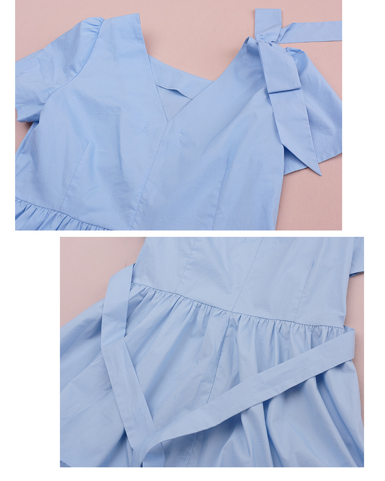 純色でアシンメトリーなデザインのコットンワンピース。通気性と吸汗性に優れ、暑い夏の日にぴったりです。ワンピースのデザインのポイントは、アシンメトリーな襟のデザインです。フロント部分は斜めになっており、バック部分は深いV字型で背中が大きく開いています。片方の肩に立体的なリボンが飾られ、サイドシームに隠しファスナーが付いているので、プルオーバーとしても着用できます。ベルトは前でも後ろでもリボンで結べます。ミドル丈のスカートでセンスと魅力を兼ね備えたワンピースを是非お試しください。