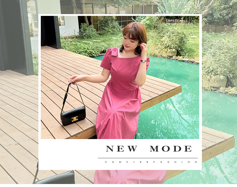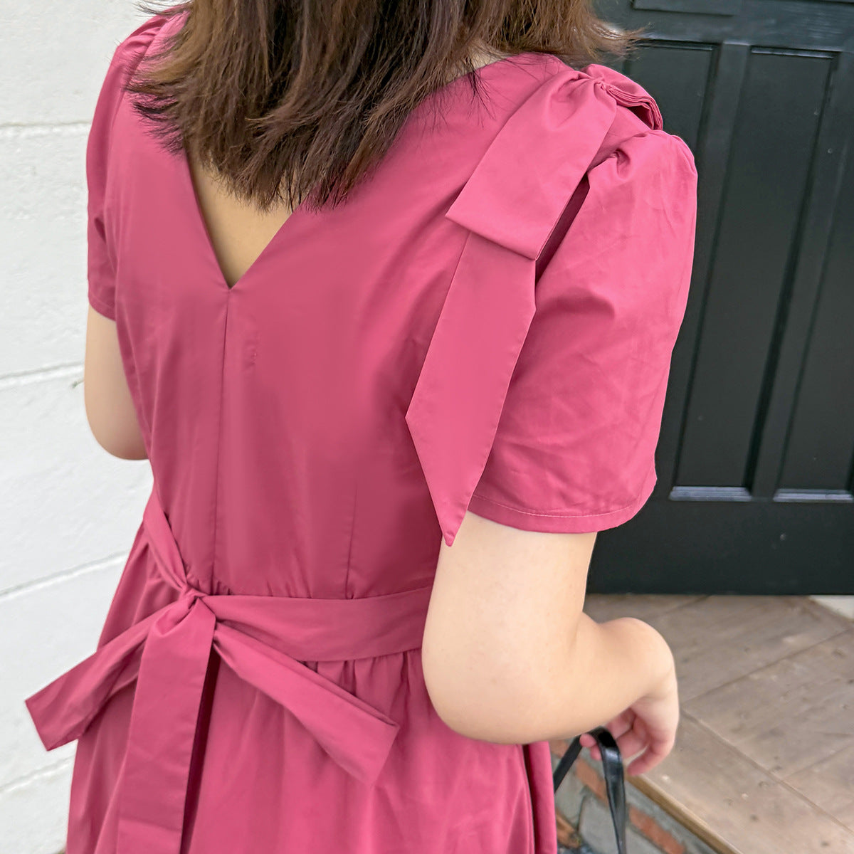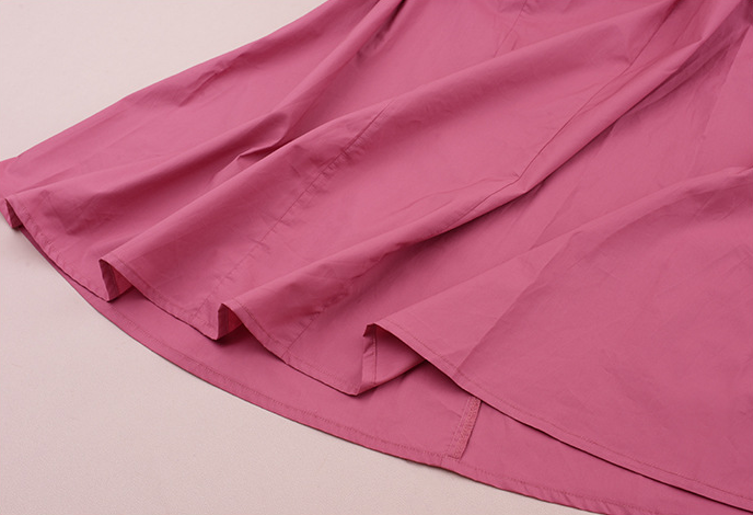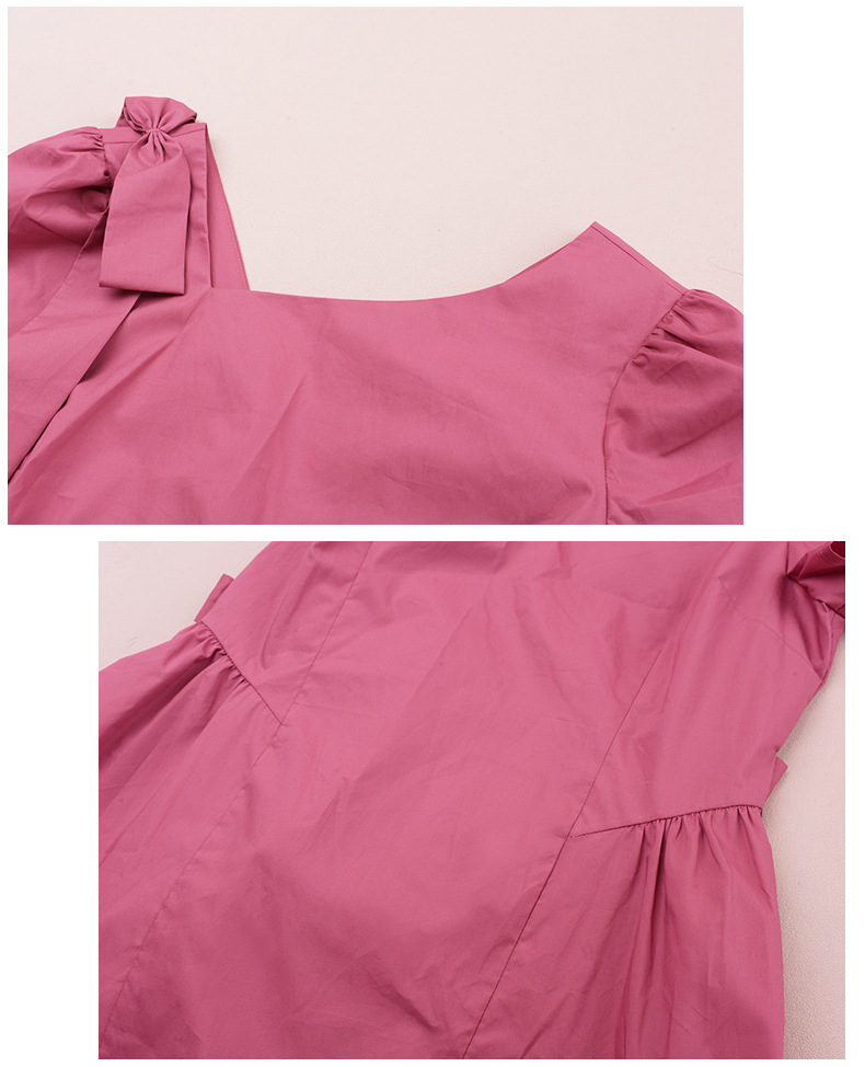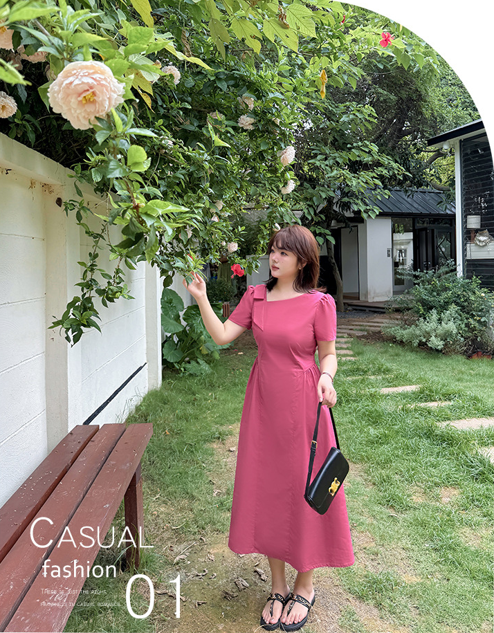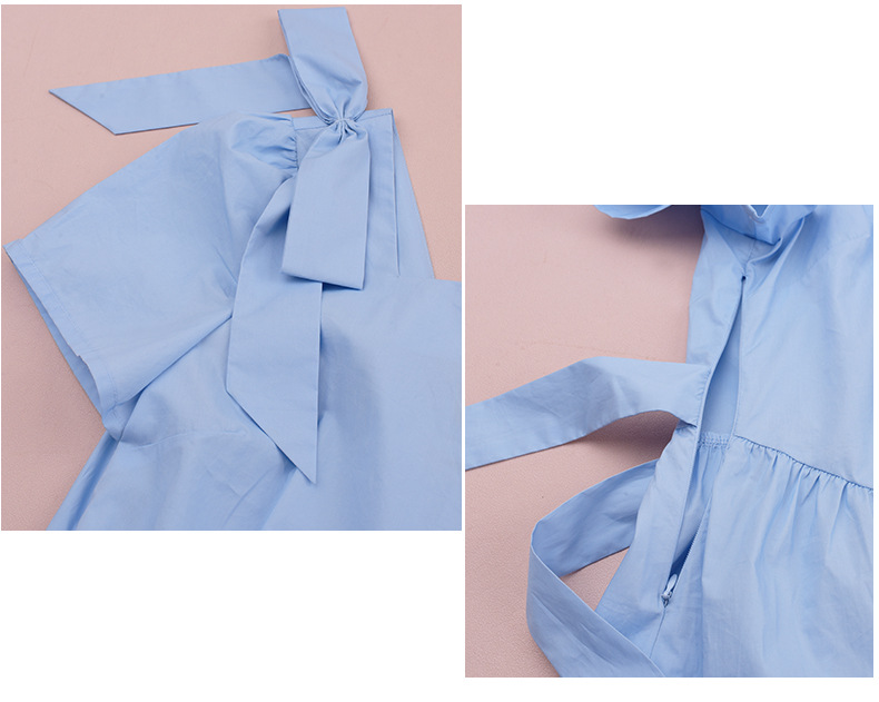 純色でアシンメトリーなデザインのコットンワンピース。通気性と吸汗性に優れ、暑い夏の日にぴったりです。ワンピースのデザインのポイントは、アシンメトリーな襟のデザインです。フロント部分は斜めになっており、バック部分は深いV字型で背中が大きく開いています。片方の肩に立体的なリボンが飾られ、サイドシームに隠しファスナーが付いているので、プルオーバーとしても着用できます。ベルトは前でも後ろでもリボンで結べます。ミドル丈のスカートでセンスと魅力を兼ね備えたワンピースを是非お試しください。