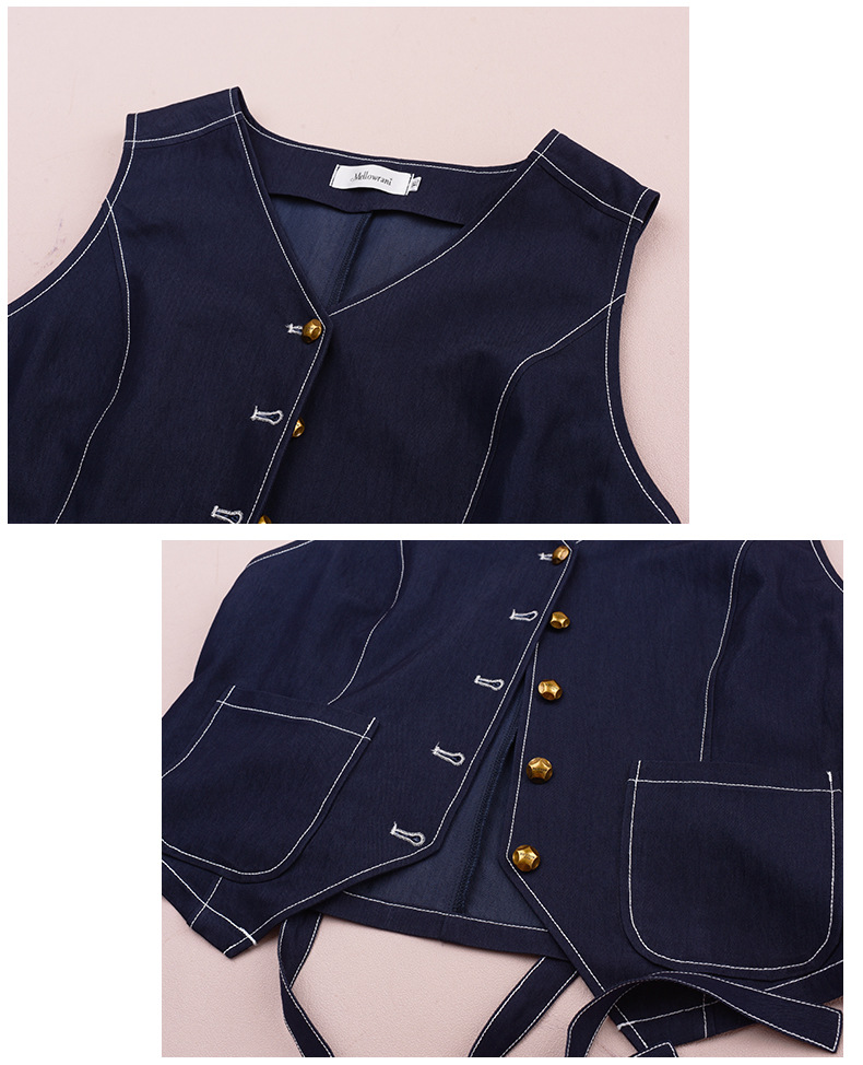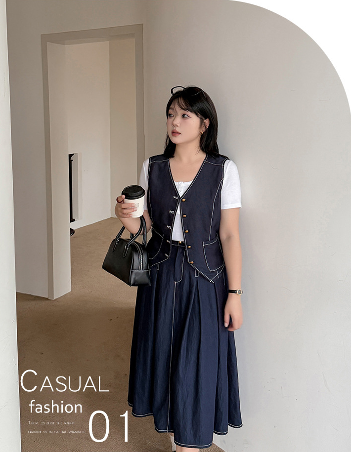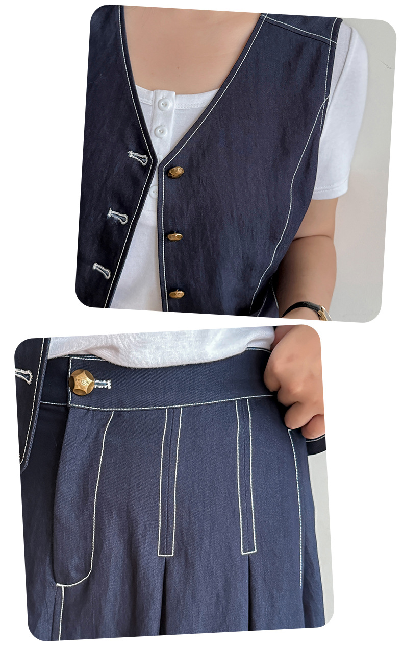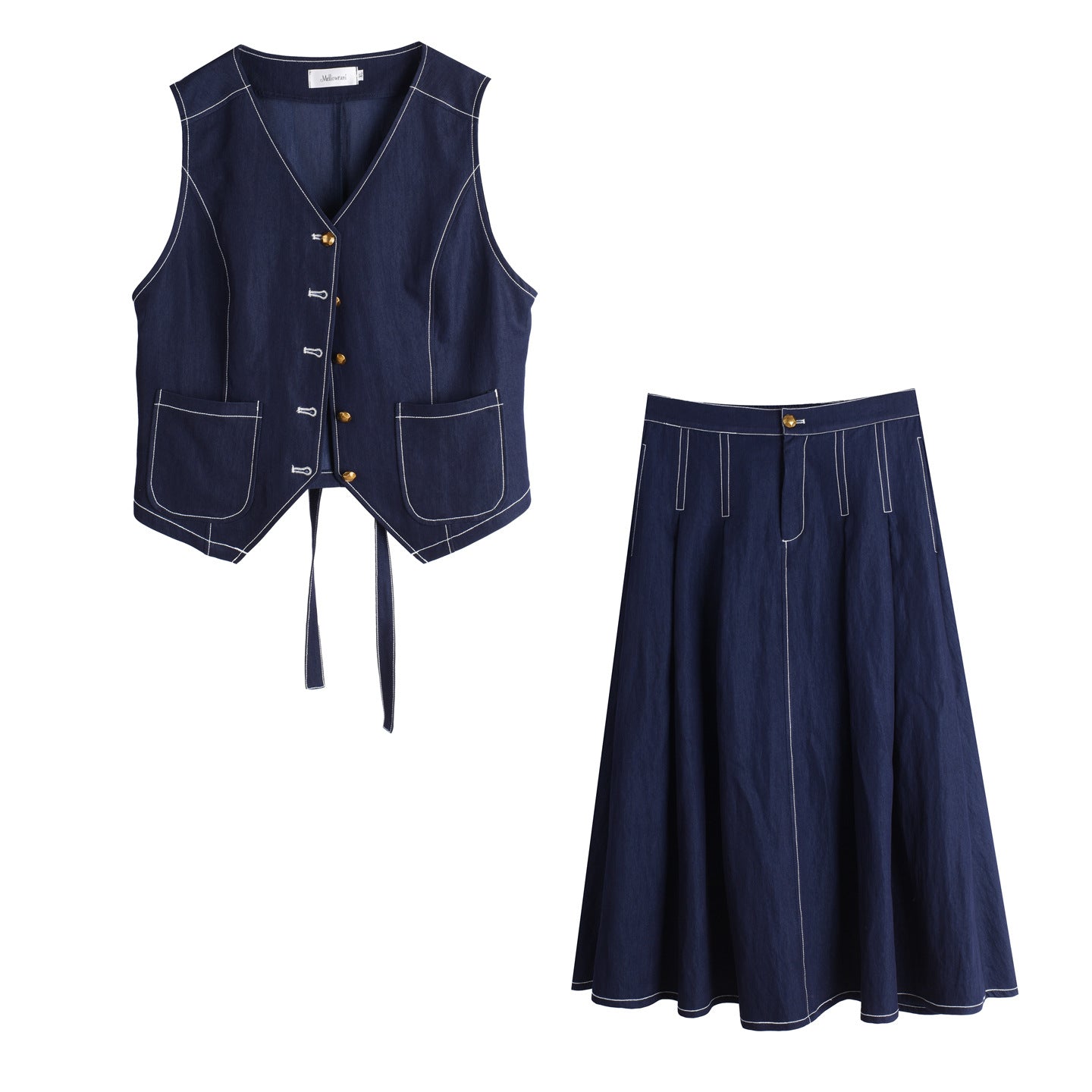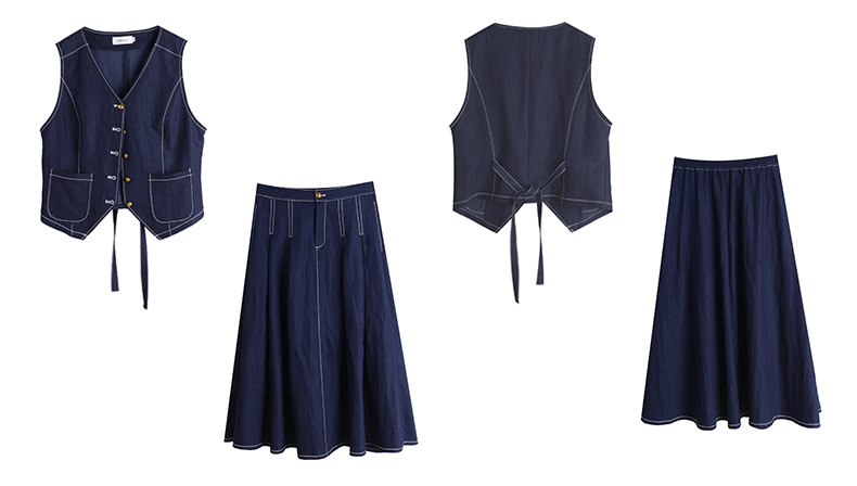 ベスト+スカートのツーピースセットは組み合わせても別々でも使えるので、実用的なコーデリーダーになります!柔らかなデニム生地は軽量で通気性に優れています。春から秋への季節の変わり目に最適な厚みです。深めのVネックベストは、フロントにゴールドのボタンが付いており、白いステッチがアクセントのおしゃれなデザインです。後ろにボウタイが付いており、ウエストにフィットするシルエットは、長袖にも半袖にも重ね着コーデが合います。スカートはフロントにボタンとジッパー、バックにゴムウエストバンドが付いています。フロントにはプリーツを複数施し、Aラインの裾は体型をカバーしながらもスリムに見せてくれます。
