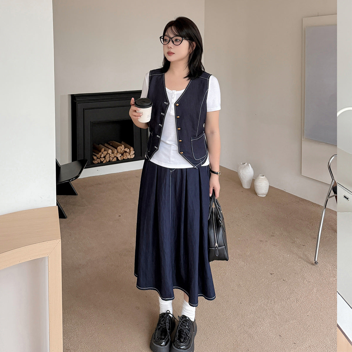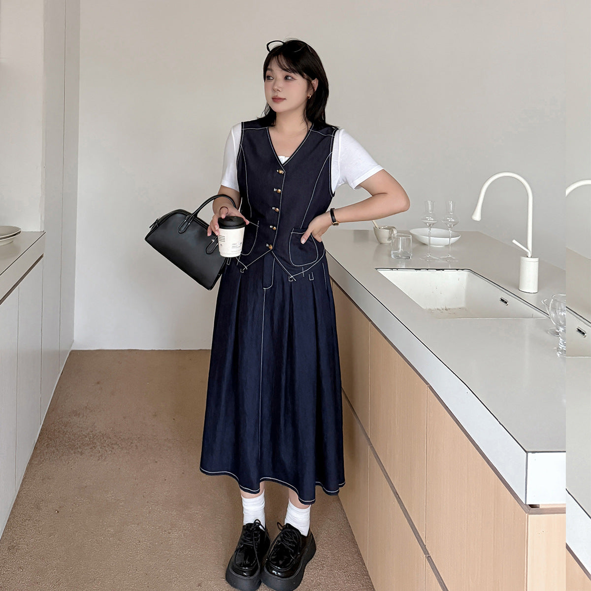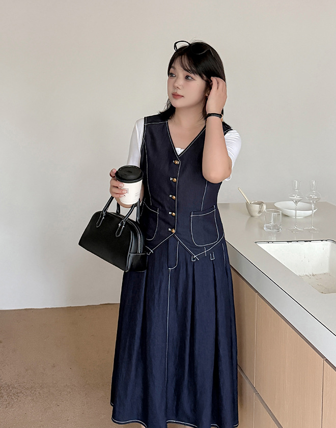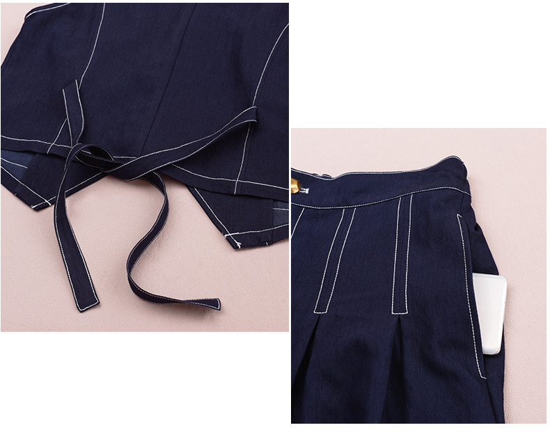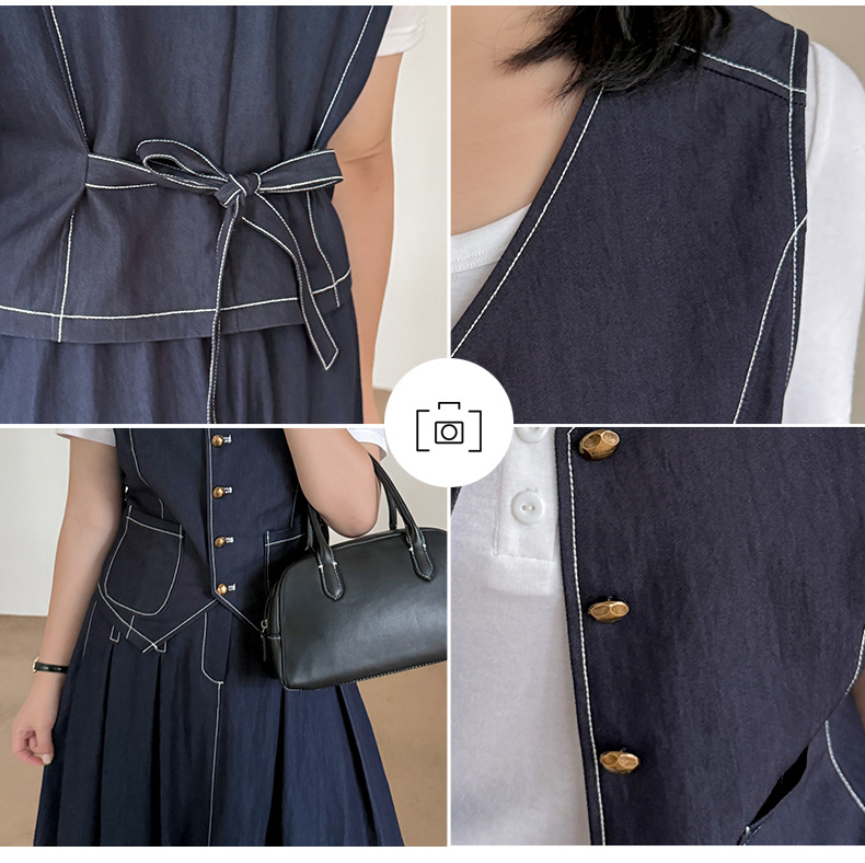 ベスト+スカートのツーピースセットは組み合わせても別々でも使えるので、実用的なコーデリーダーになります!柔らかなデニム生地は軽量で通気性に優れています。春から秋への季節の変わり目に最適な厚みです。深めのVネックベストは、フロントにゴールドのボタンが付いており、白いステッチがアクセントのおしゃれなデザインです。後ろにボウタイが付いており、ウエストにフィットするシルエットは、長袖にも半袖にも重ね着コーデが合います。スカートはフロントにボタンとジッパー、バックにゴムウエストバンドが付いています。フロントにはプリーツを複数施し、Aラインの裾は体型をカバーしながらもスリムに見せてくれます。