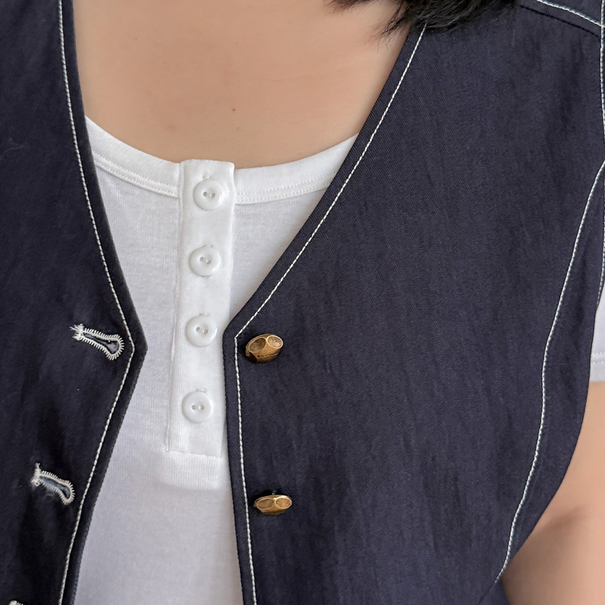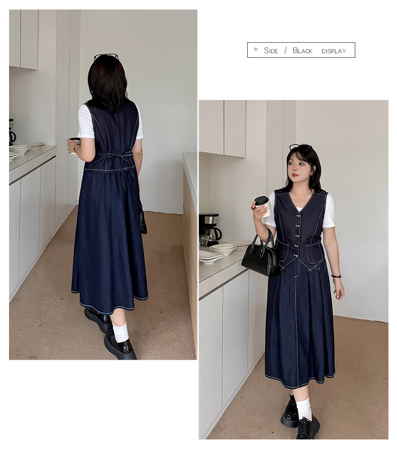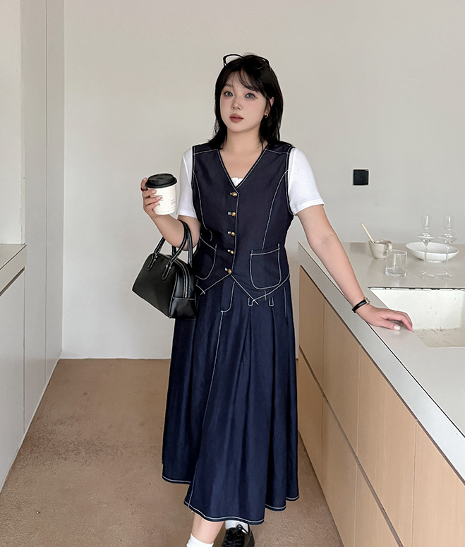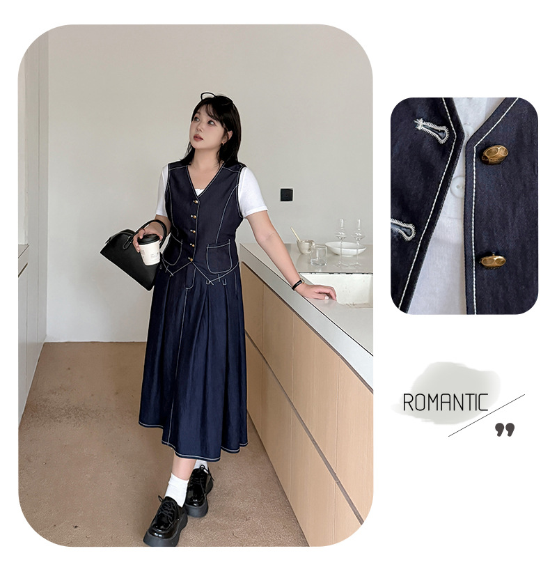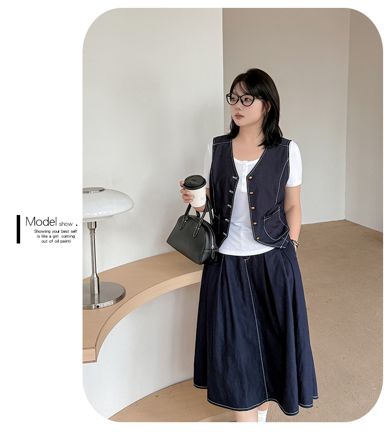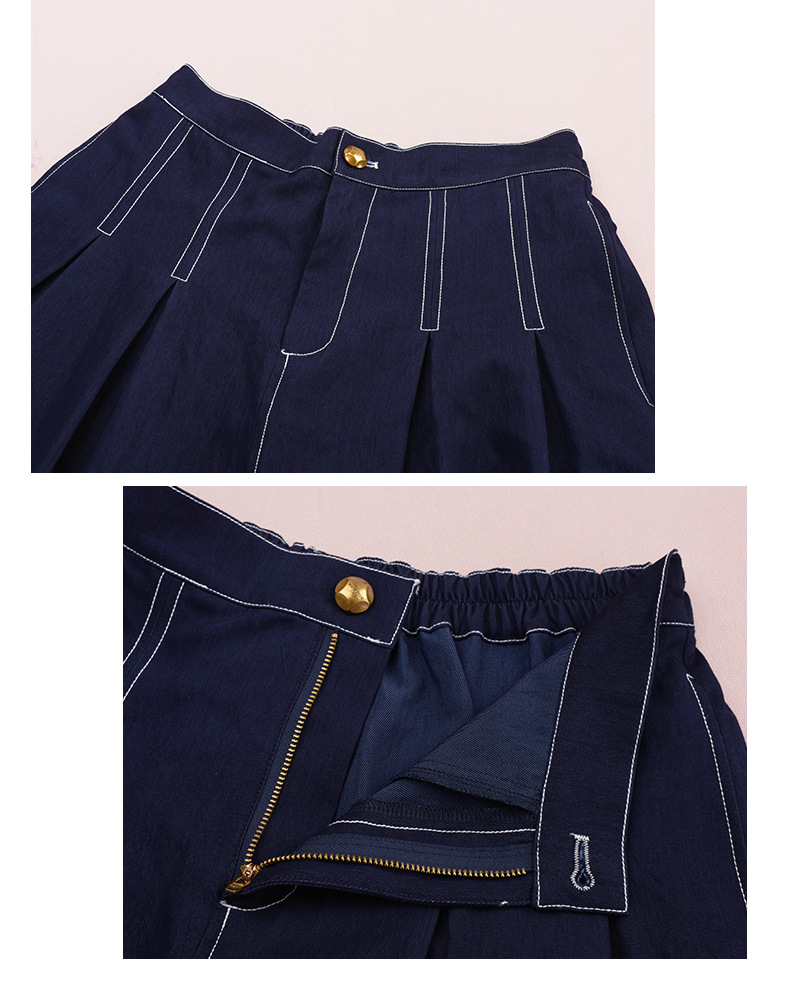 ベスト+スカートのツーピースセットは組み合わせても別々でも使えるので、実用的なコーデリーダーになります!柔らかなデニム生地は軽量で通気性に優れています。春から秋への季節の変わり目に最適な厚みです。深めのVネックベストは、フロントにゴールドのボタンが付いており、白いステッチがアクセントのおしゃれなデザインです。後ろにボウタイが付いており、ウエストにフィットするシルエットは、長袖にも半袖にも重ね着コーデが合います。スカートはフロントにボタンとジッパー、バックにゴムウエストバンドが付いています。フロントにはプリーツを複数施し、Aラインの裾は体型をカバーしながらもスリムに見せてくれます。