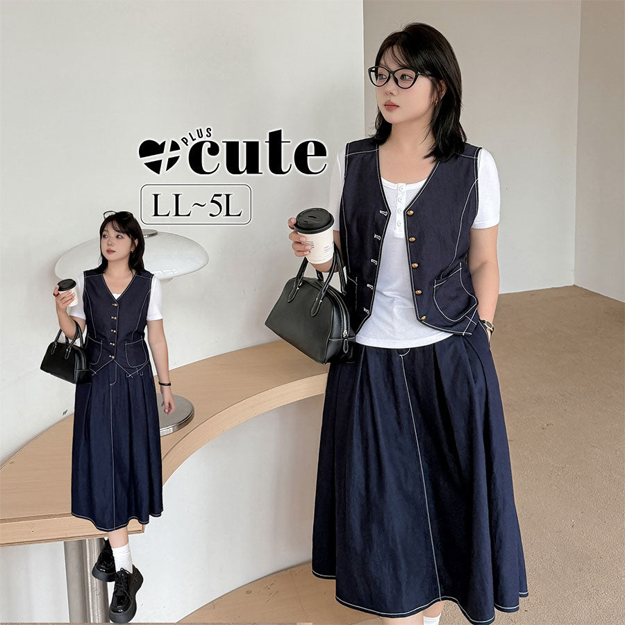 大きいサイズ レディース ネイビーブルーデニムツーピース(ベスト+スカート) LL 3L 4L 5L