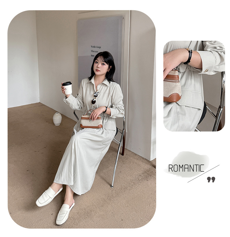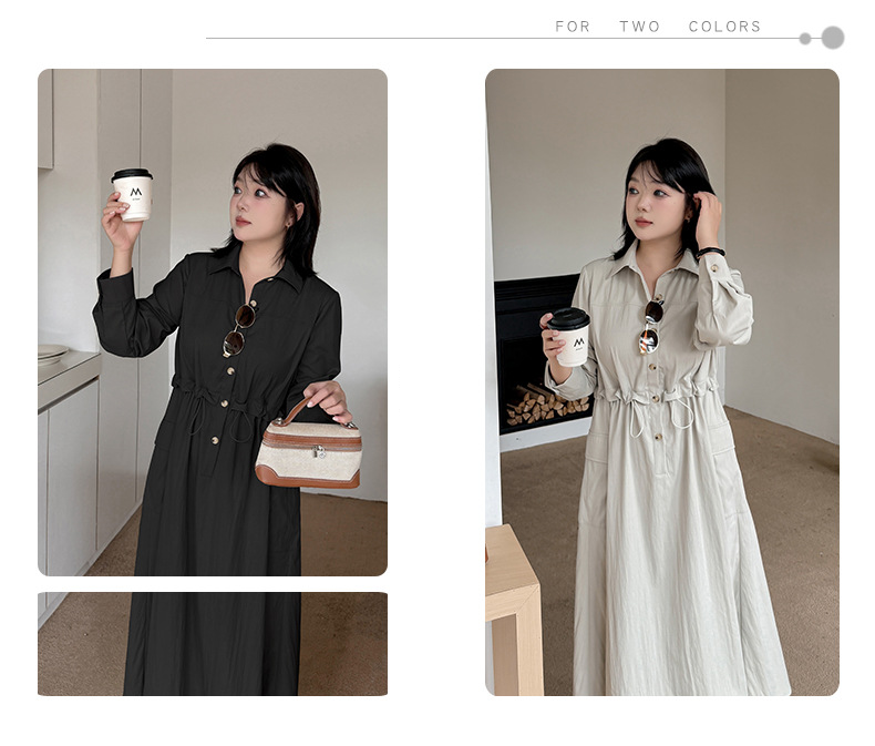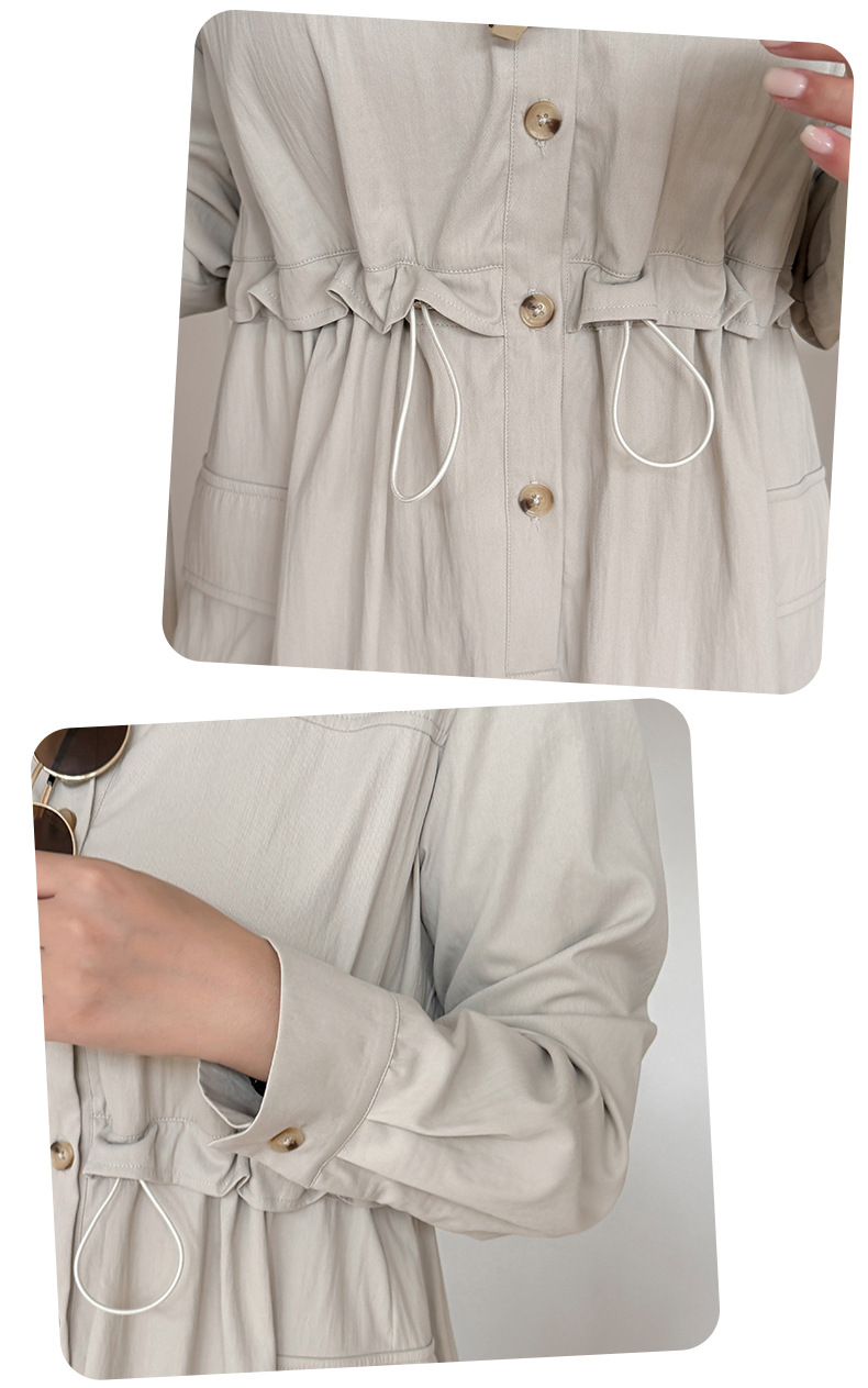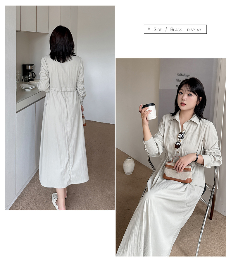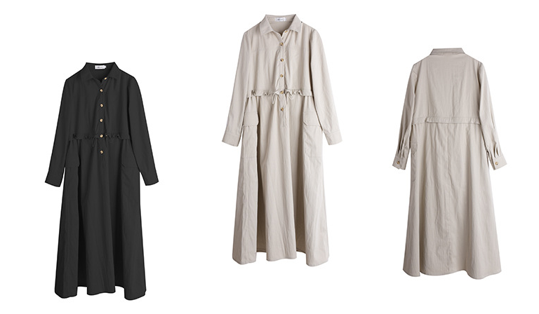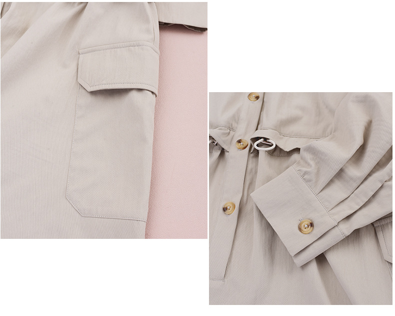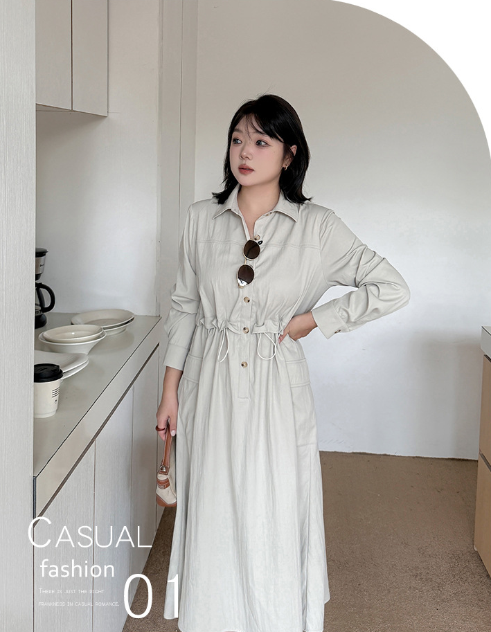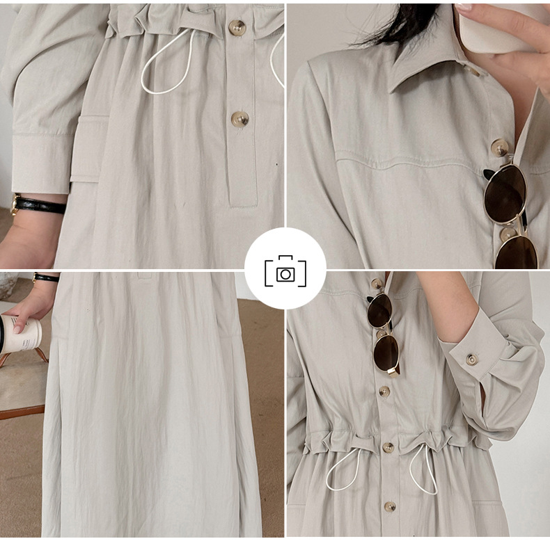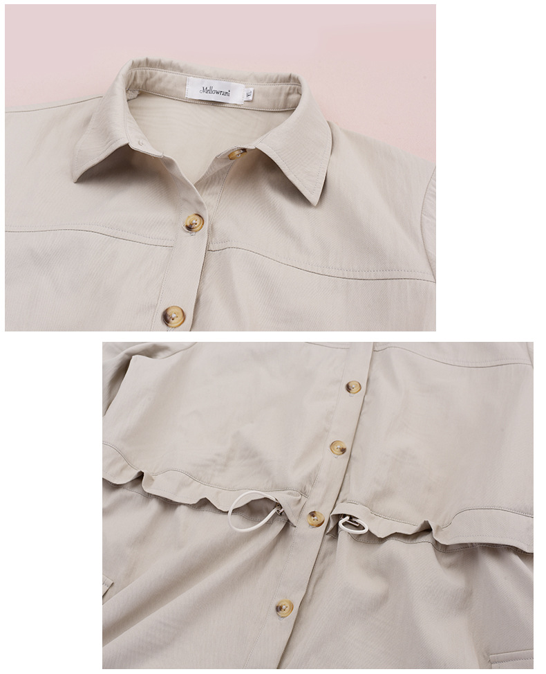 知的な通勤スタイルのウエストワンピースは、柔らかくドレープ性のあるツイル織物で作られています。シャツのラペル、半前立てのボタンは外すことができます。ウエスト部分はフェイクツーピースデザインで、ウエストはゴム紐で調節可能です。サイドシームには大きめのパッチポケットが2つ付いています。袖口はボタン付きのスリムフィットスリーブ、ワークウェアスタイルで、カジュアルにも通勤にも使える上品なワンピースです。