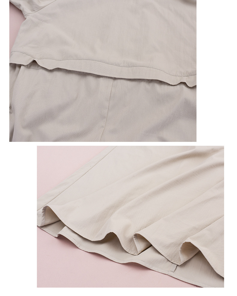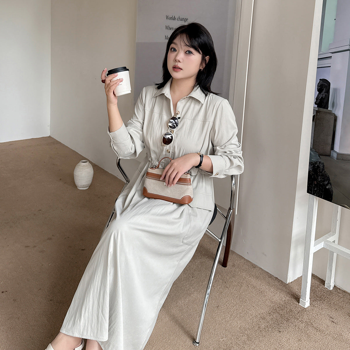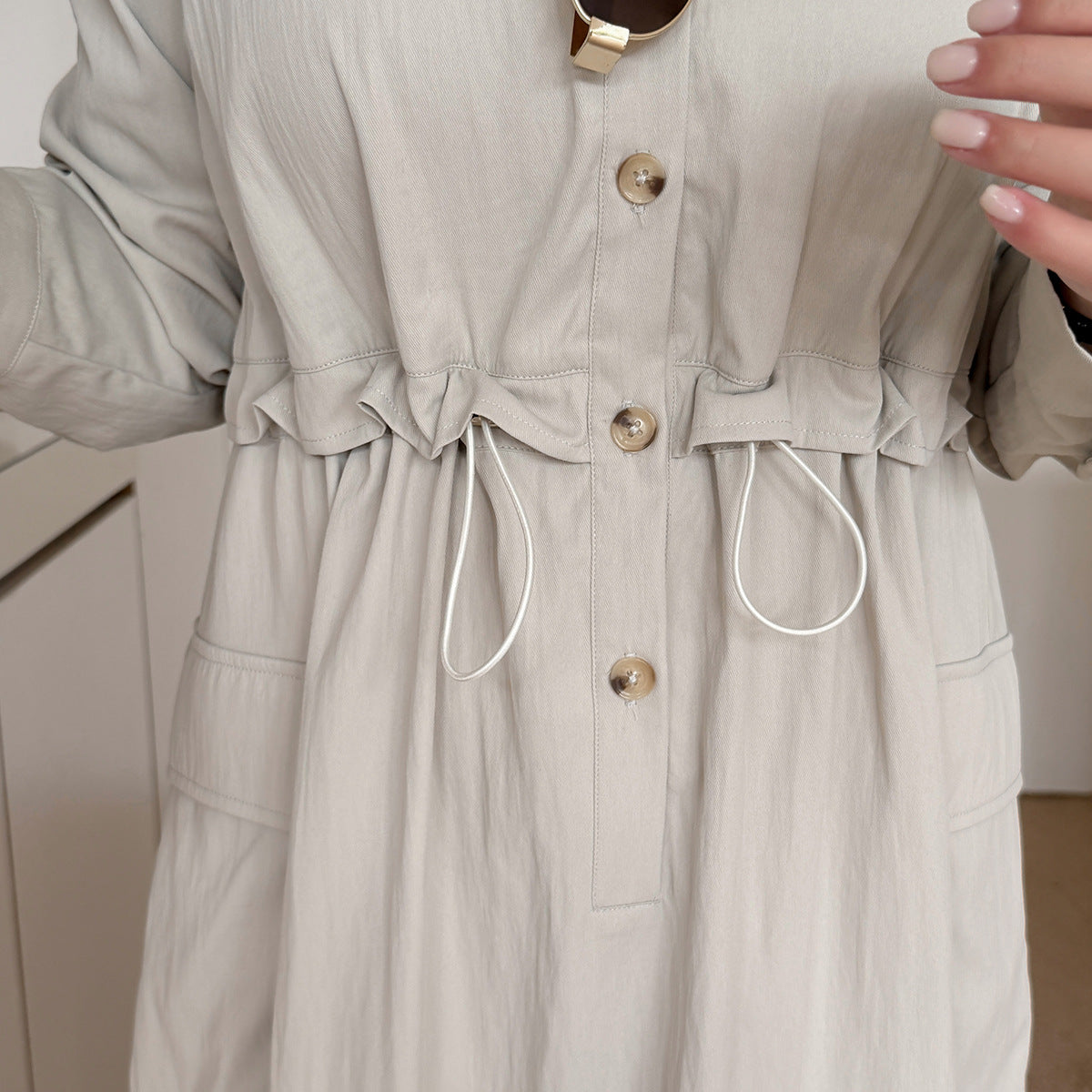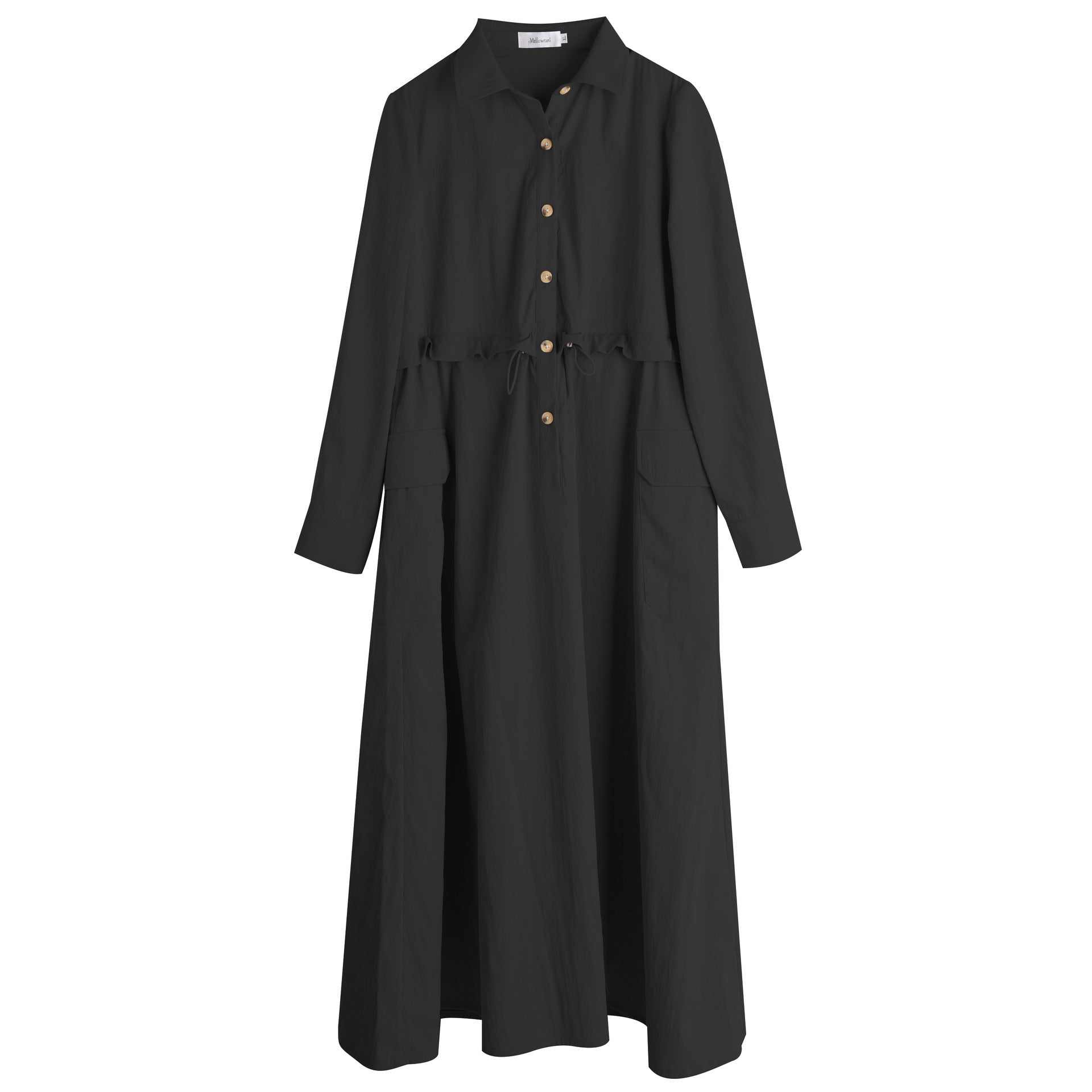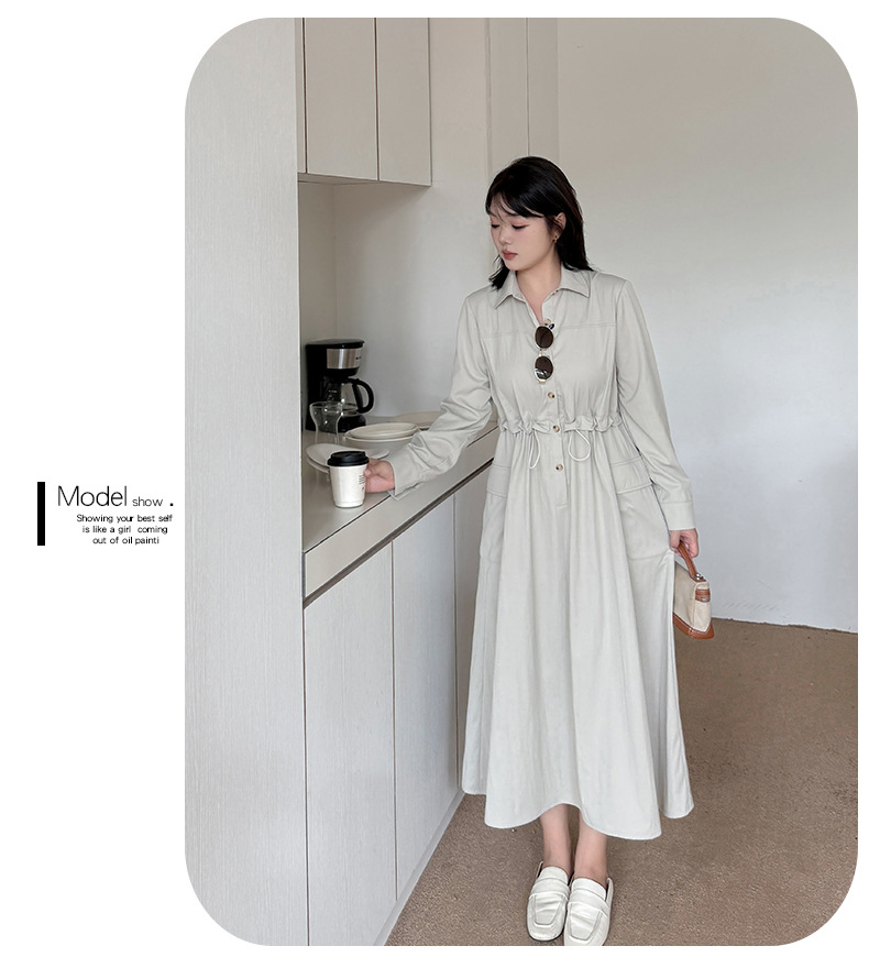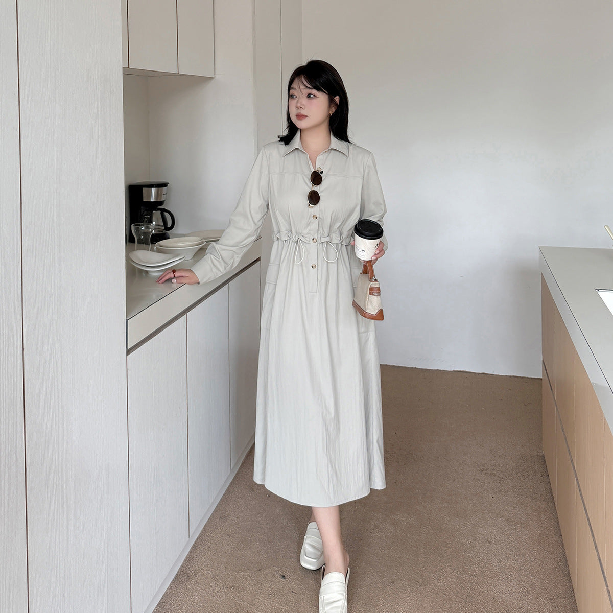 知的な通勤スタイルのウエストワンピースは、柔らかくドレープ性のあるツイル織物で作られています。シャツのラペル、半前立てのボタンは外すことができます。ウエスト部分はフェイクツーピースデザインで、ウエストはゴム紐で調節可能です。サイドシームには大きめのパッチポケットが2つ付いています。袖口はボタン付きのスリムフィットスリーブ、ワークウェアスタイルで、カジュアルにも通勤にも使える上品なワンピースです。