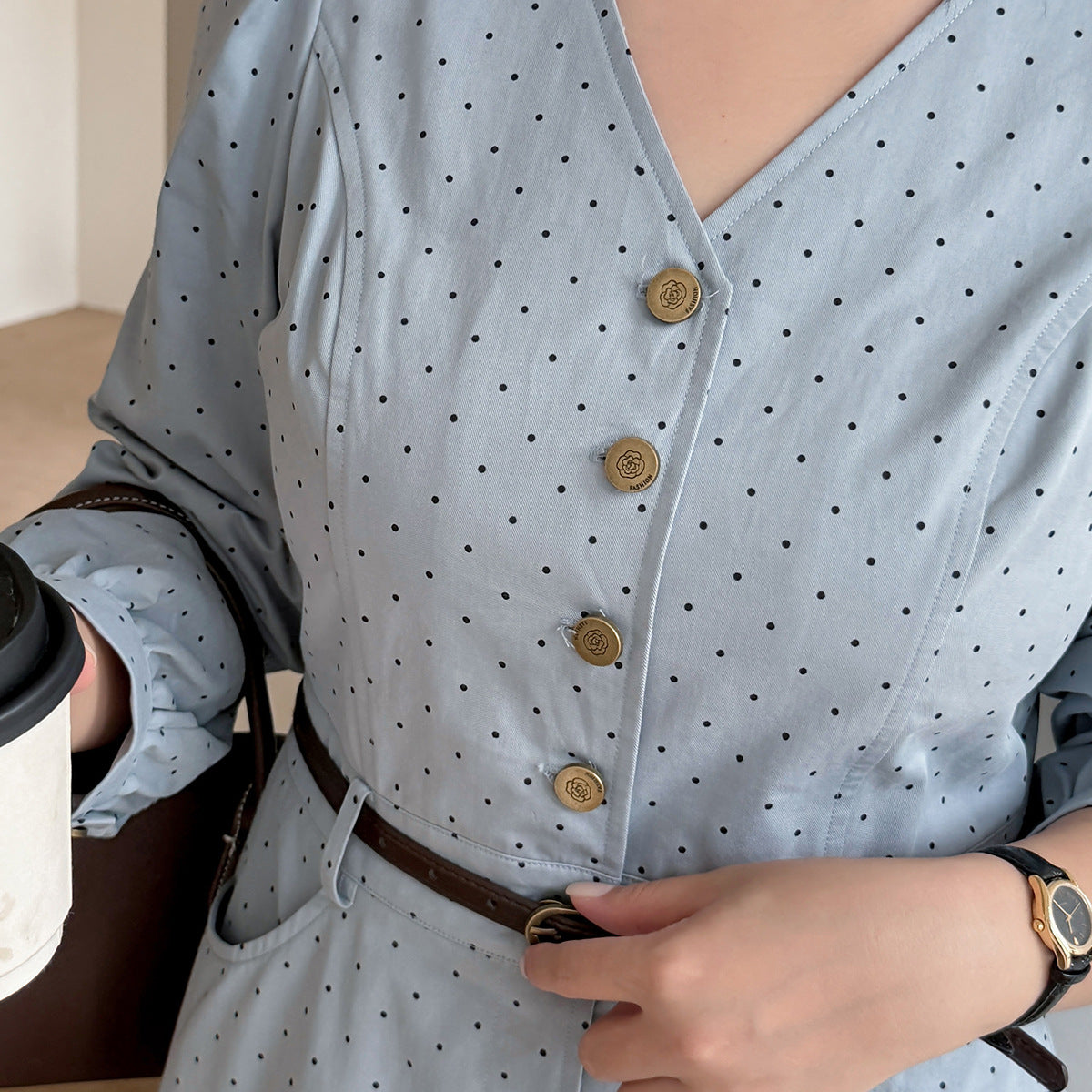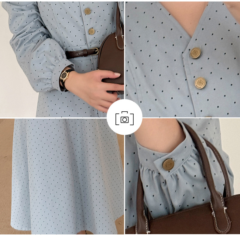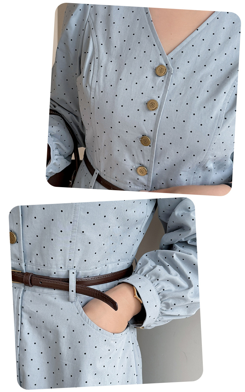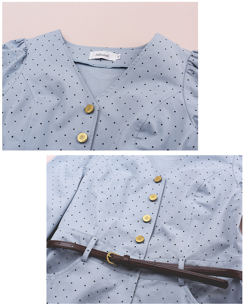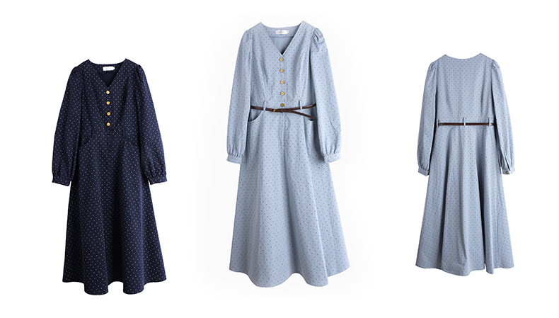 Vネックハイセンス水玉ドットウエストワンピースは、さりげないドットプリントを施した、ハリのあるコットン生地で作られており、程よい厚みと重量感があります。Vネックで、オシャレなフロントボタンは取り外しができます。ウエストはファスナー付きで、ベルトを装着することでさらにスッキリとしたスタイルの装いを楽しめます。袖口のボタン、サイドポケット付きで、大きめのアンブレラスカートのデザインです。力強さと柔らかさのバランスを実現したハイセンスのワンピースを是非お試しください。
