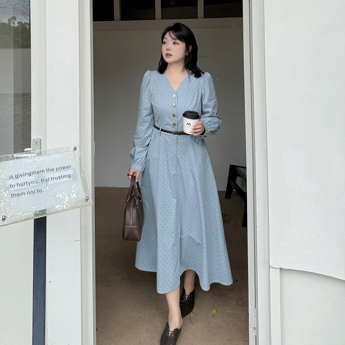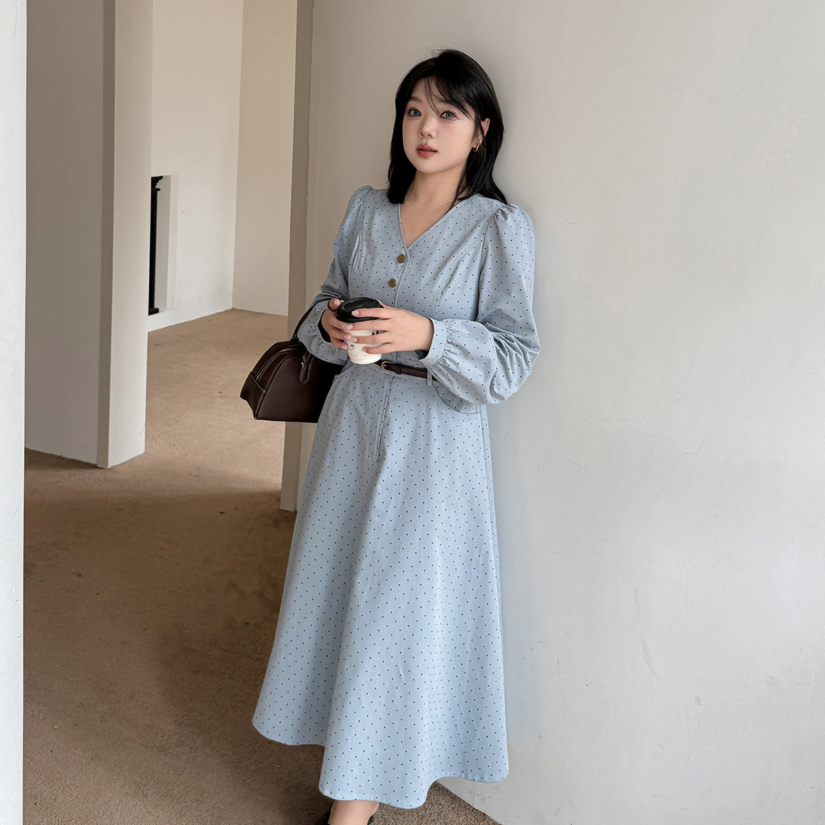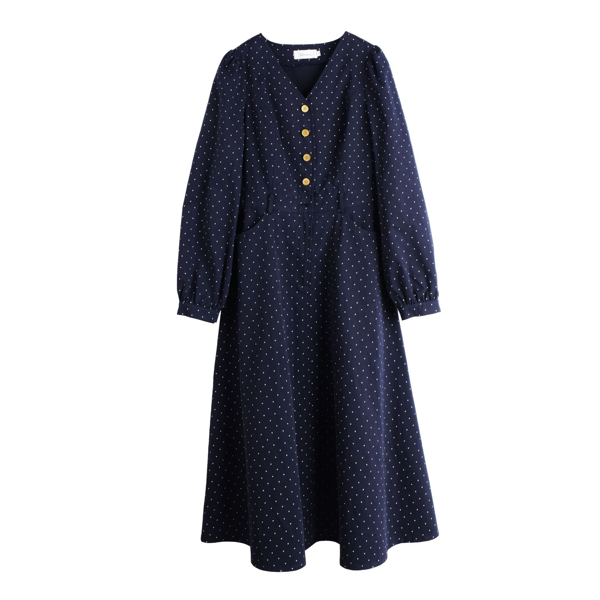Vネックハイセンス水玉ドットウエストワンピースは、さりげないドットプリントを施した、ハリのあるコットン生地で作られており、程よい厚みと重量感があります。Vネックで、オシャレなフロントボタンは取り外しができます。ウエストはファスナー付きで、ベルトを装着することでさらにスッキリとしたスタイルの装いを楽しめます。袖口のボタン、サイドポケット付きで、大きめのアンブレラスカートのデザインです。力強さと柔らかさのバランスを実現したハイセンスのワンピースを是非お試しください。