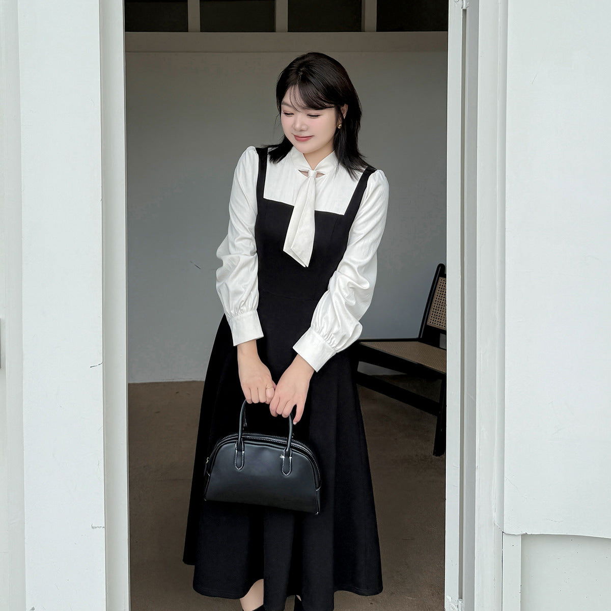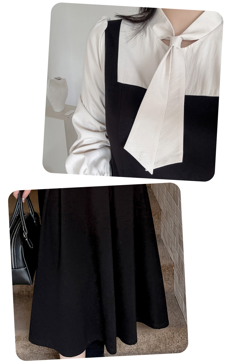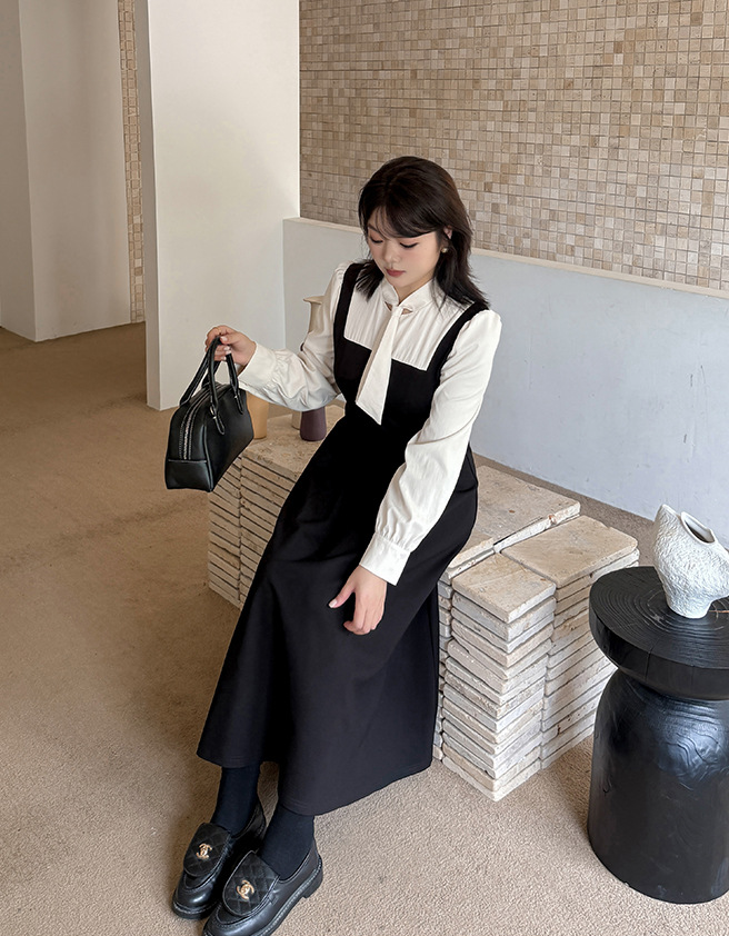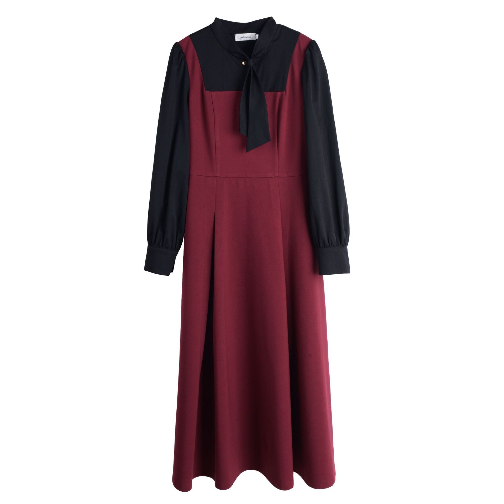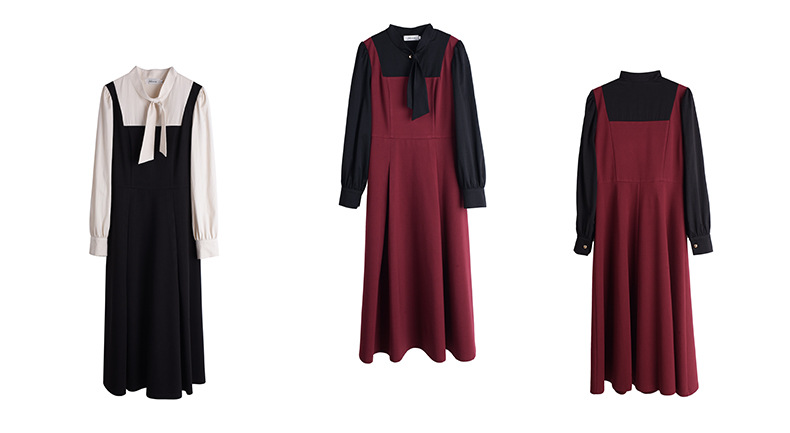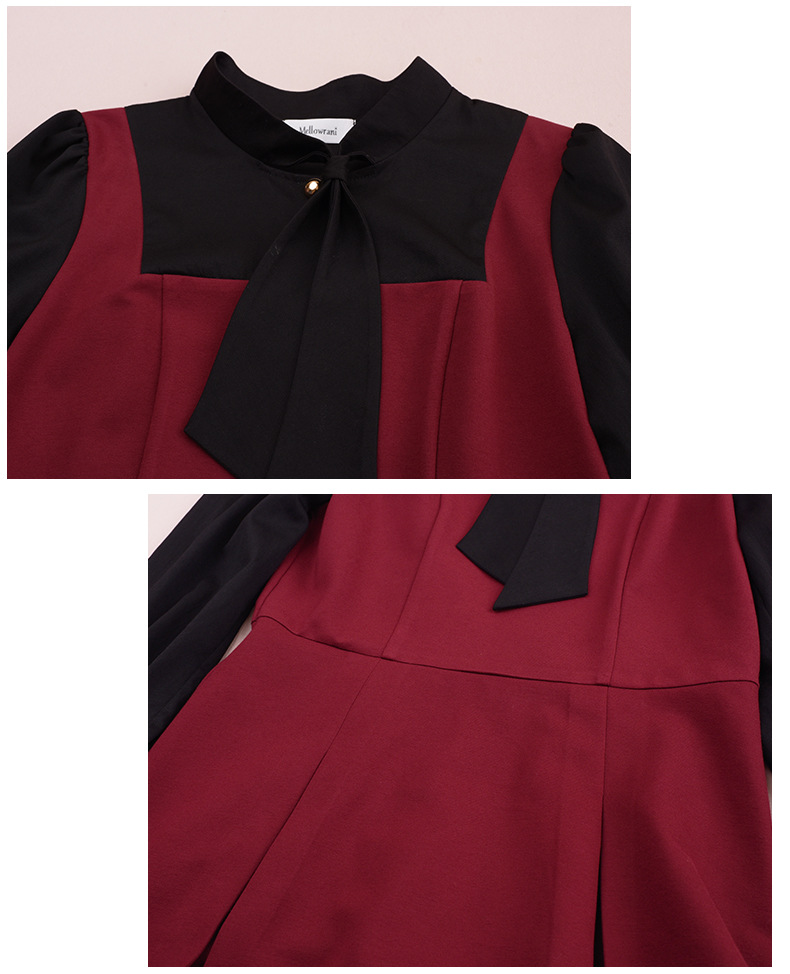 フェイクツーピースワンピースは、伸縮性がありドレープ性の優れたローマの布地を使用し、柔らかく滑らかな肌触りです。小さめのスタンドカラー、襟には特徴的なリボンタイデザインが施され、ボタンは開けられます。袖口にもボタンが付いており、ウエストを包み込むアンブレラスタイルとミディアム丈スカートが優しく上品な知性と優雅さを際立たせます。