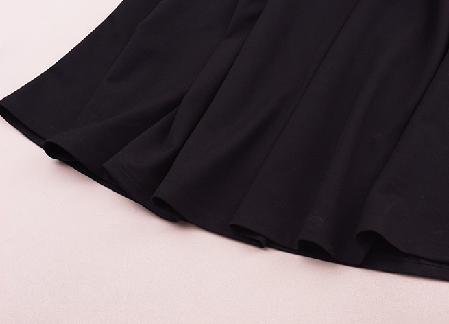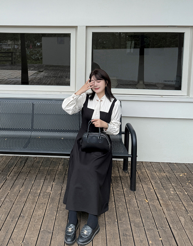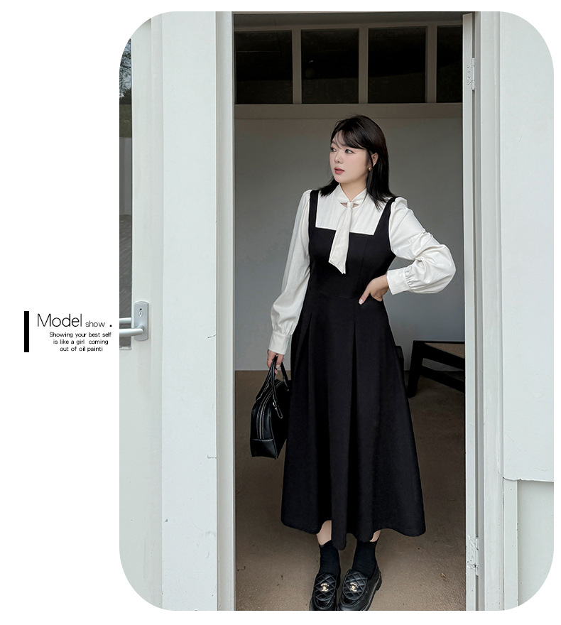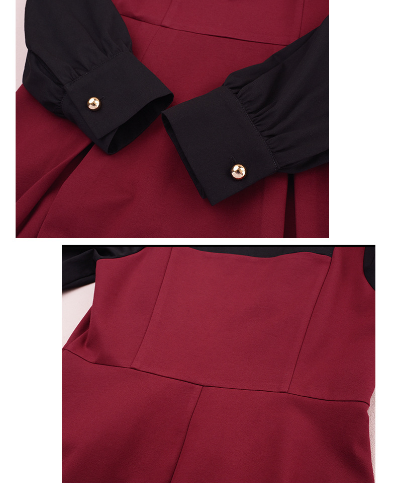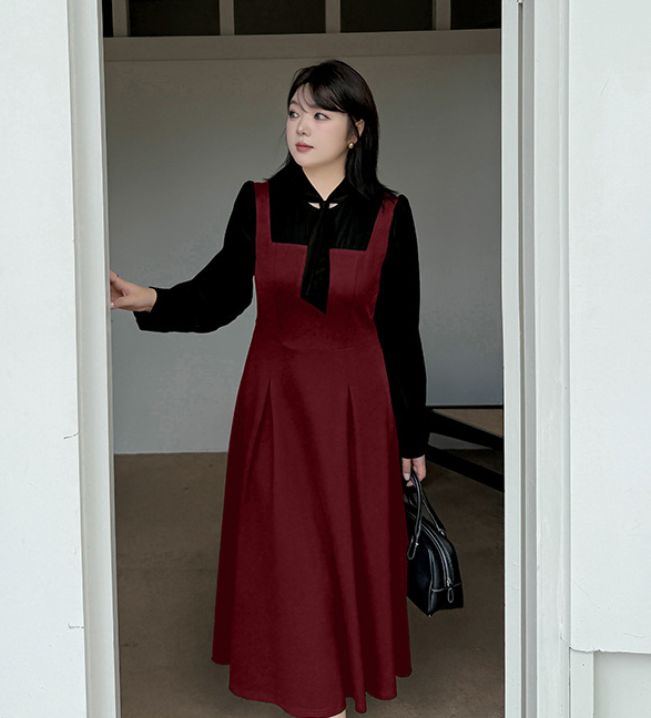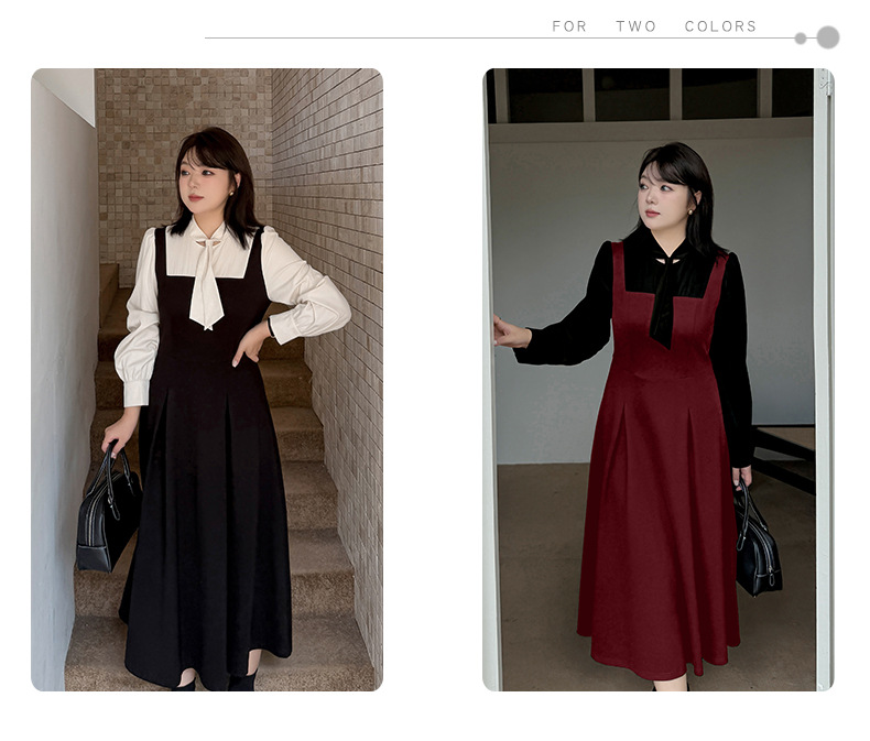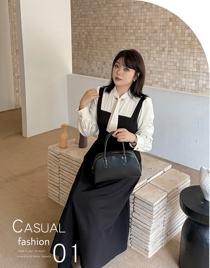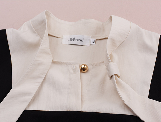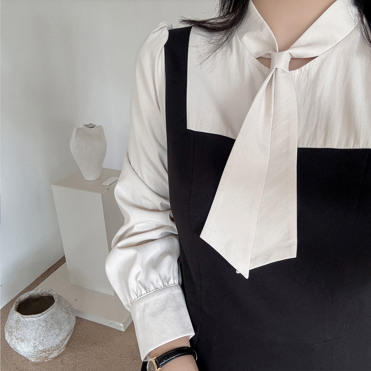 フェイクツーピースワンピースは、伸縮性がありドレープ性の優れたローマの布地を使用し、柔らかく滑らかな肌触りです。小さめのスタンドカラー、襟には特徴的なリボンタイデザインが施され、ボタンは開けられます。袖口にもボタンが付いており、ウエストを包み込むアンブレラスタイルとミディアム丈スカートが優しく上品な知性と優雅さを際立たせます。