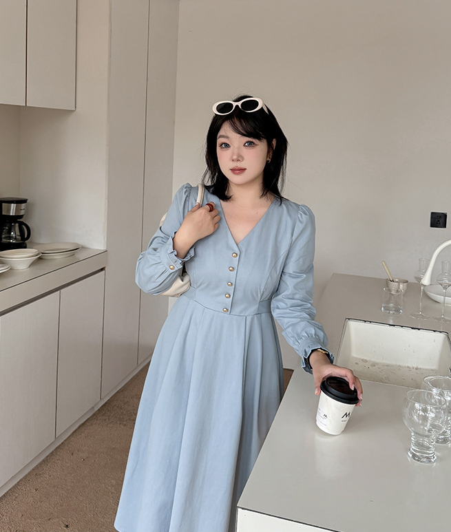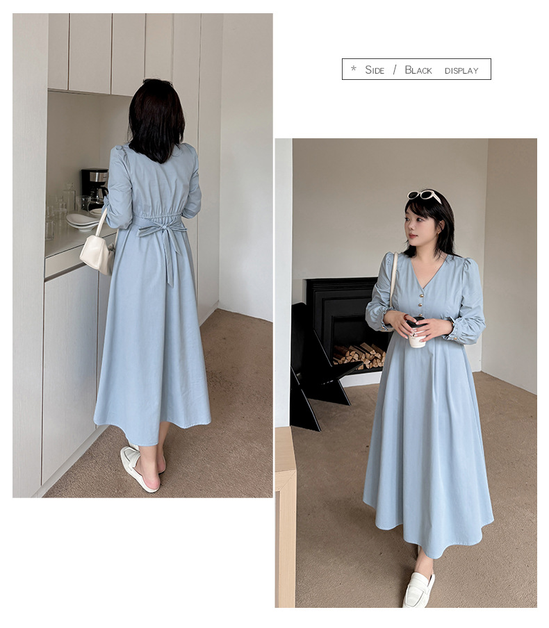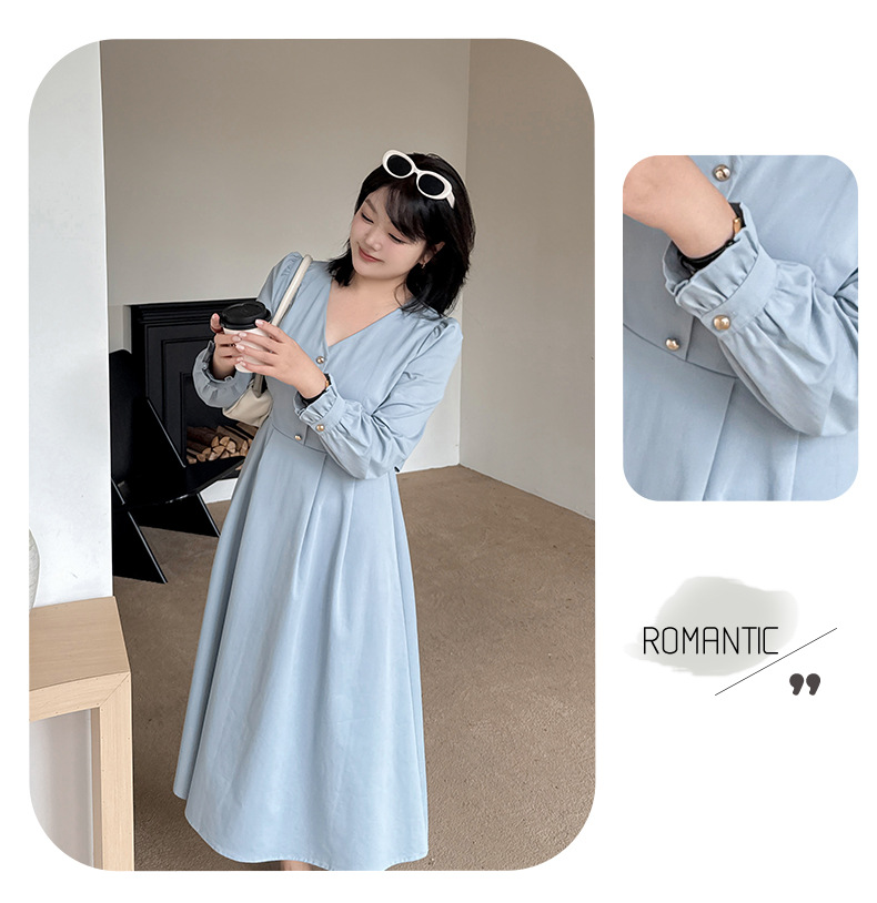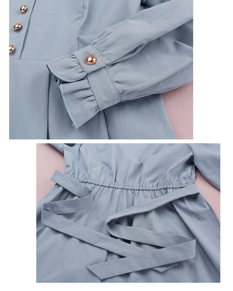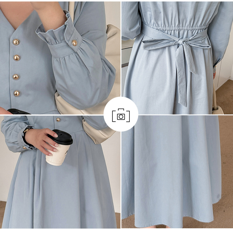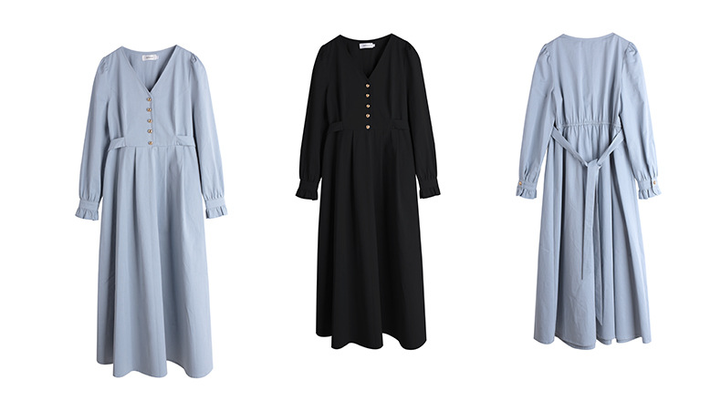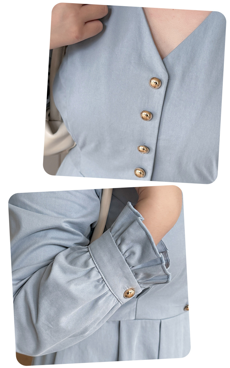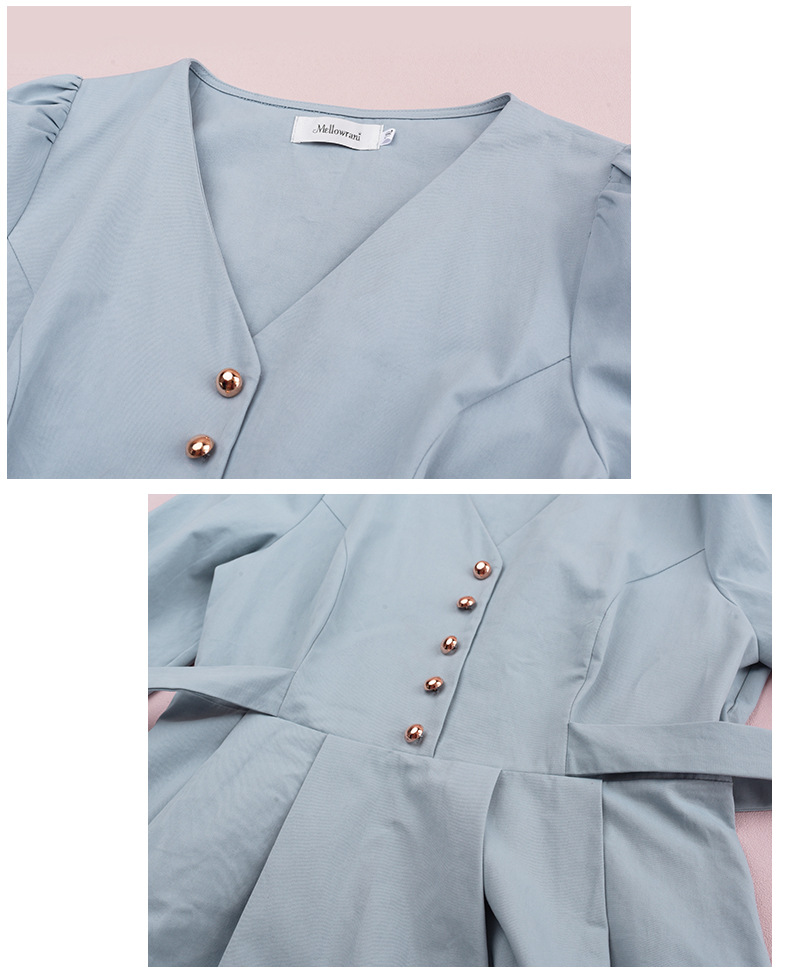 Vネックウエストフレンチワンピースは、ややシャリ感のあるコットン生地で作られており、通気性と快適性に優れた快適な着心地です。Vネック、フロント中央に金ボタンが装飾され、ボタンは開けられません。後ろウエストはゴムとベルトデザインでリボンに結ぶことができます。袖口には小さなフリル飾り、袖口は開けることができます。優しく落ち着いた知的なスタイルの、エレガントなワンピースを是非お試しください。