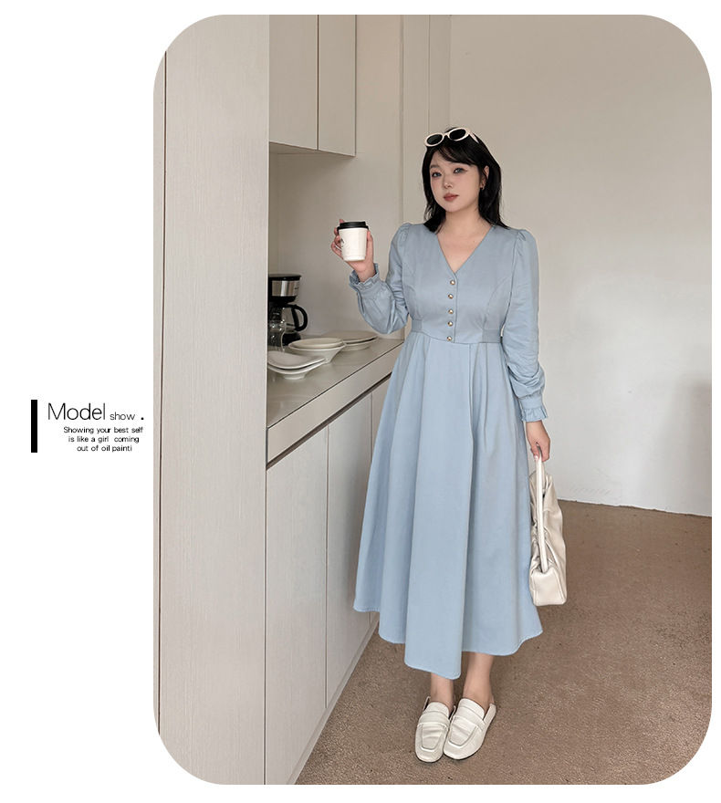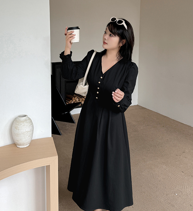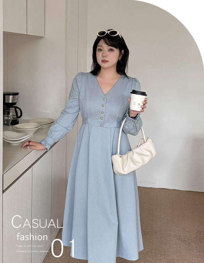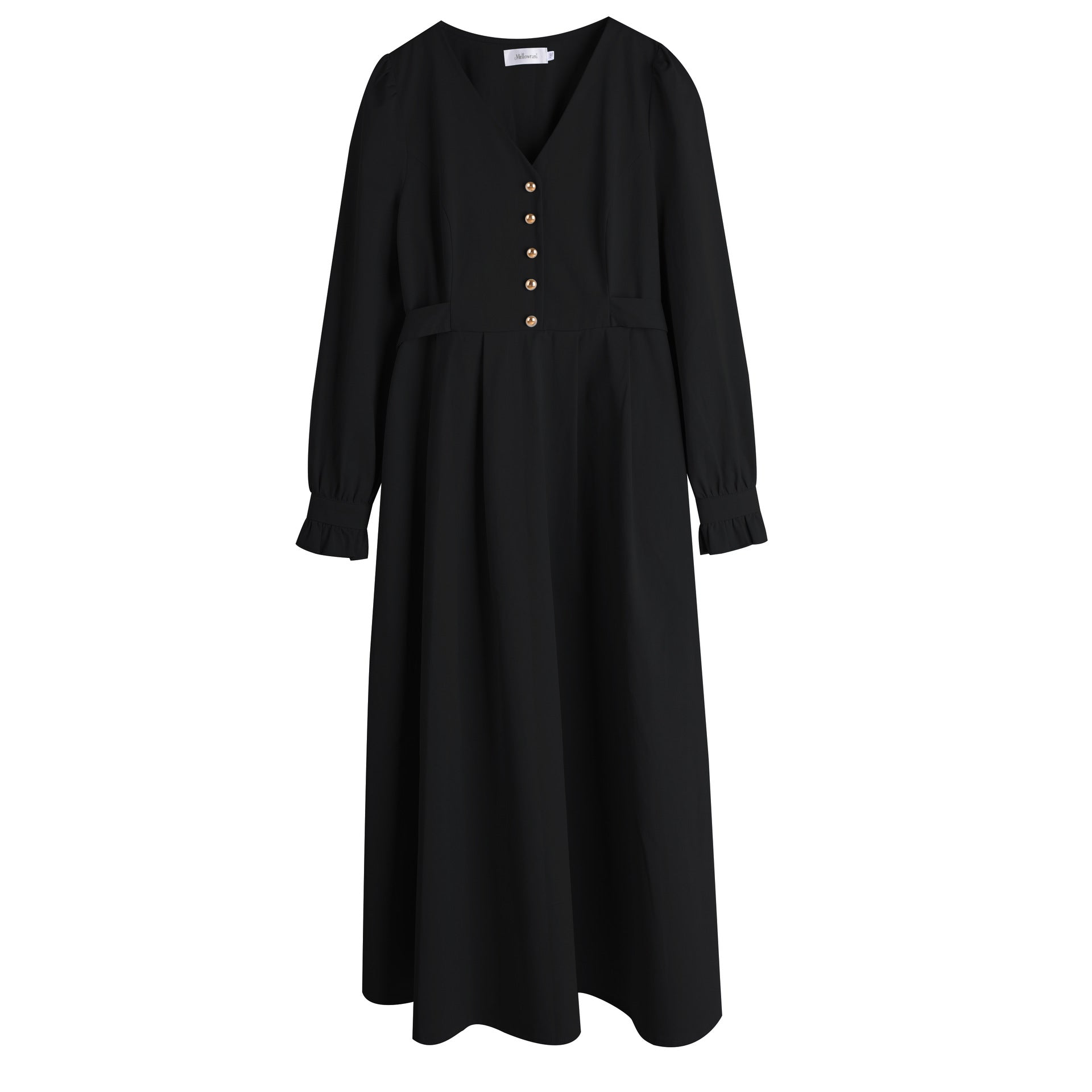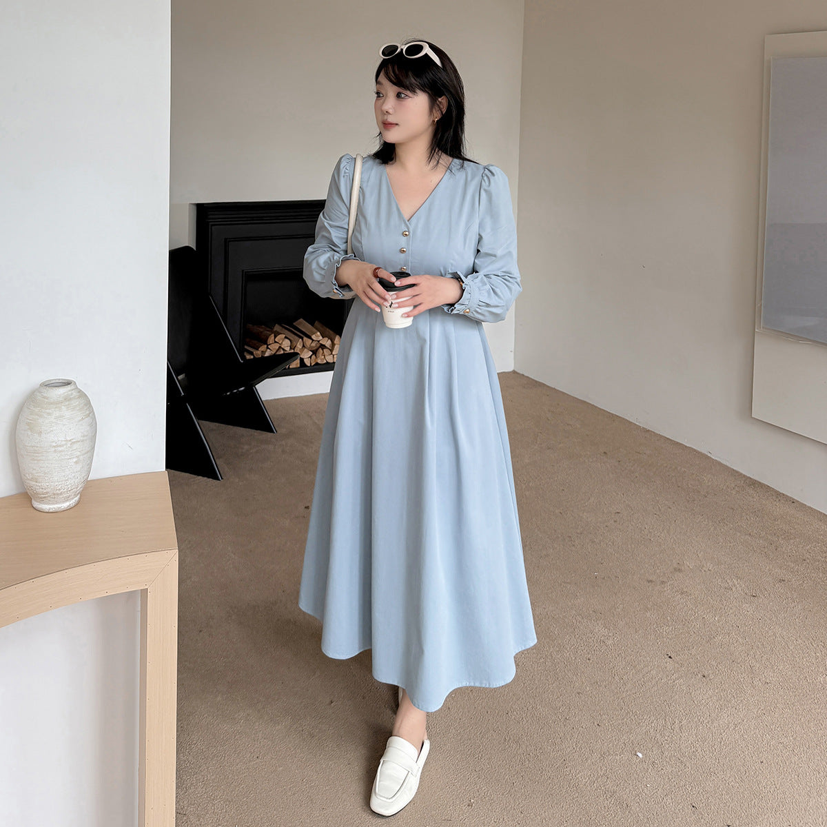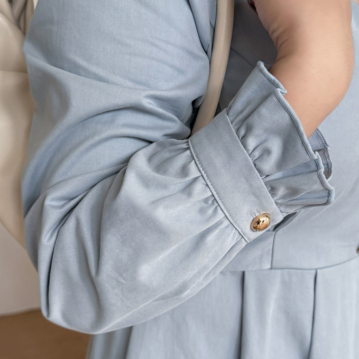 Vネックウエストフレンチワンピースは、ややシャリ感のあるコットン生地で作られており、通気性と快適性に優れた快適な着心地です。Vネック、フロント中央に金ボタンが装飾され、ボタンは開けられません。後ろウエストはゴムとベルトデザインでリボンに結ぶことができます。袖口には小さなフリル飾り、袖口は開けることができます。優しく落ち着いた知的なスタイルの、エレガントなワンピースを是非お試しください。