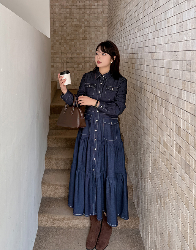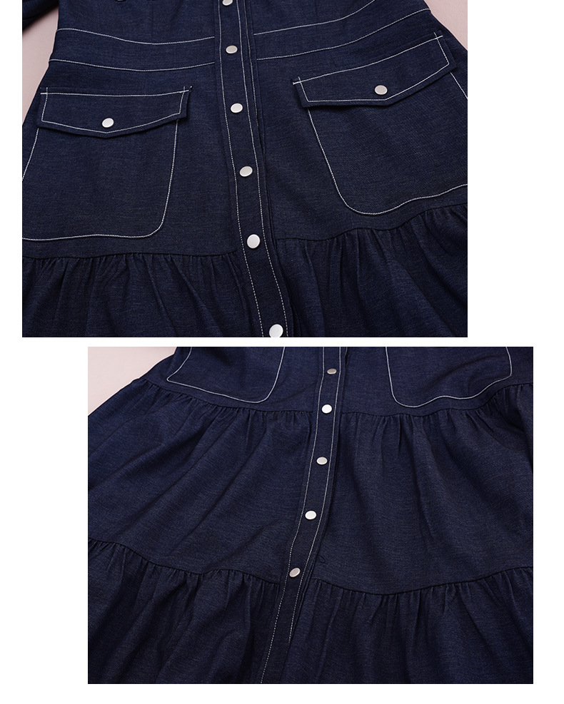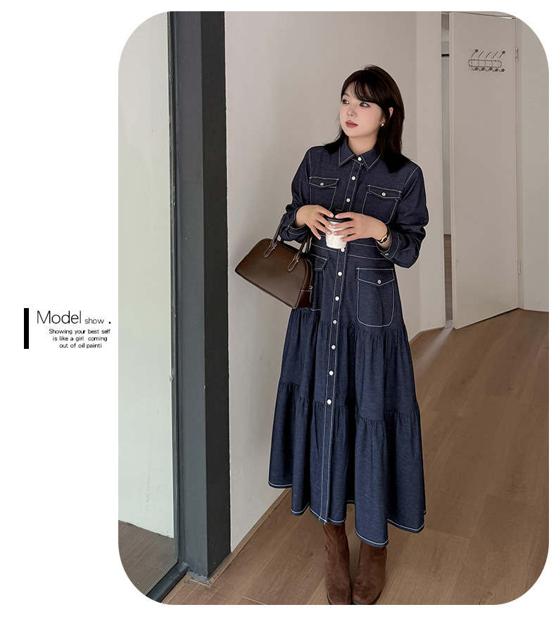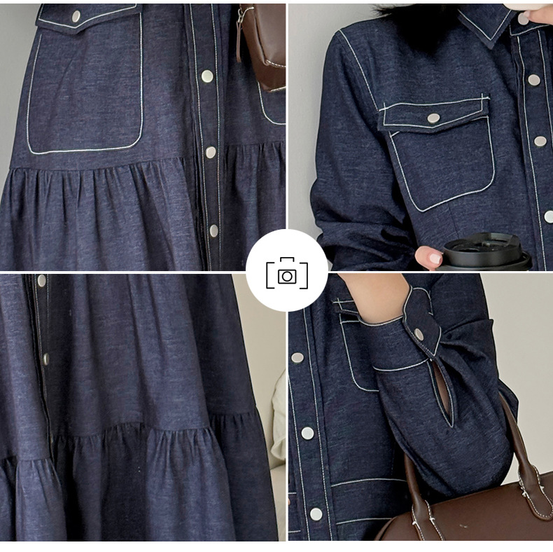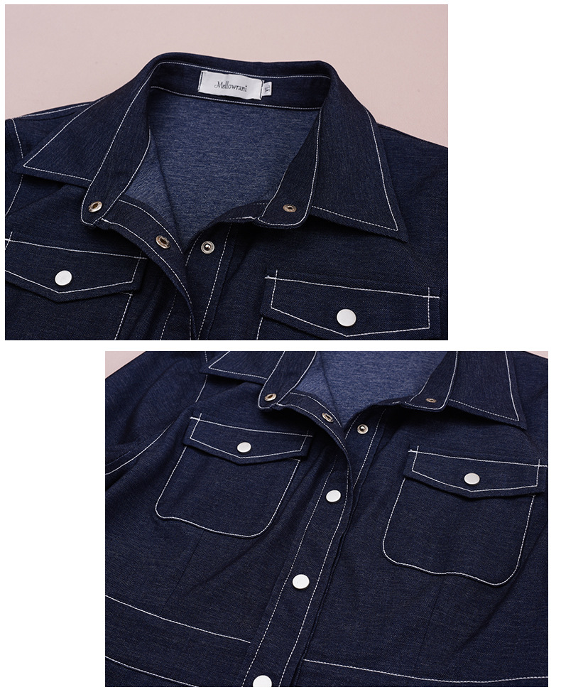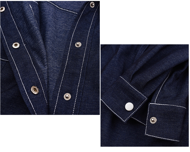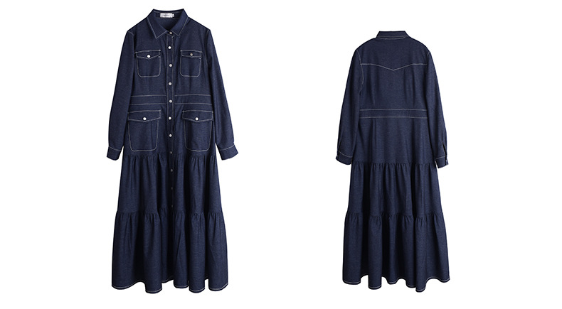 厚手のデニムロングワンピースは、柔らかく通気性のあるデニム生地で作られ、伸縮性のある快適な着心地です。全身に白い明るいラインがマッチしています。タフで力強く、立体的なフォルムを実現。ラペルタイプ、フロントにシルバーのスナップボタンを一列配置、4つのパッチポケット+ポケットカバーのデザインです。袖口にはボタンが付いており、外すこともできます。スカートはミディアム丈で、非常に上質な素材で作られています。