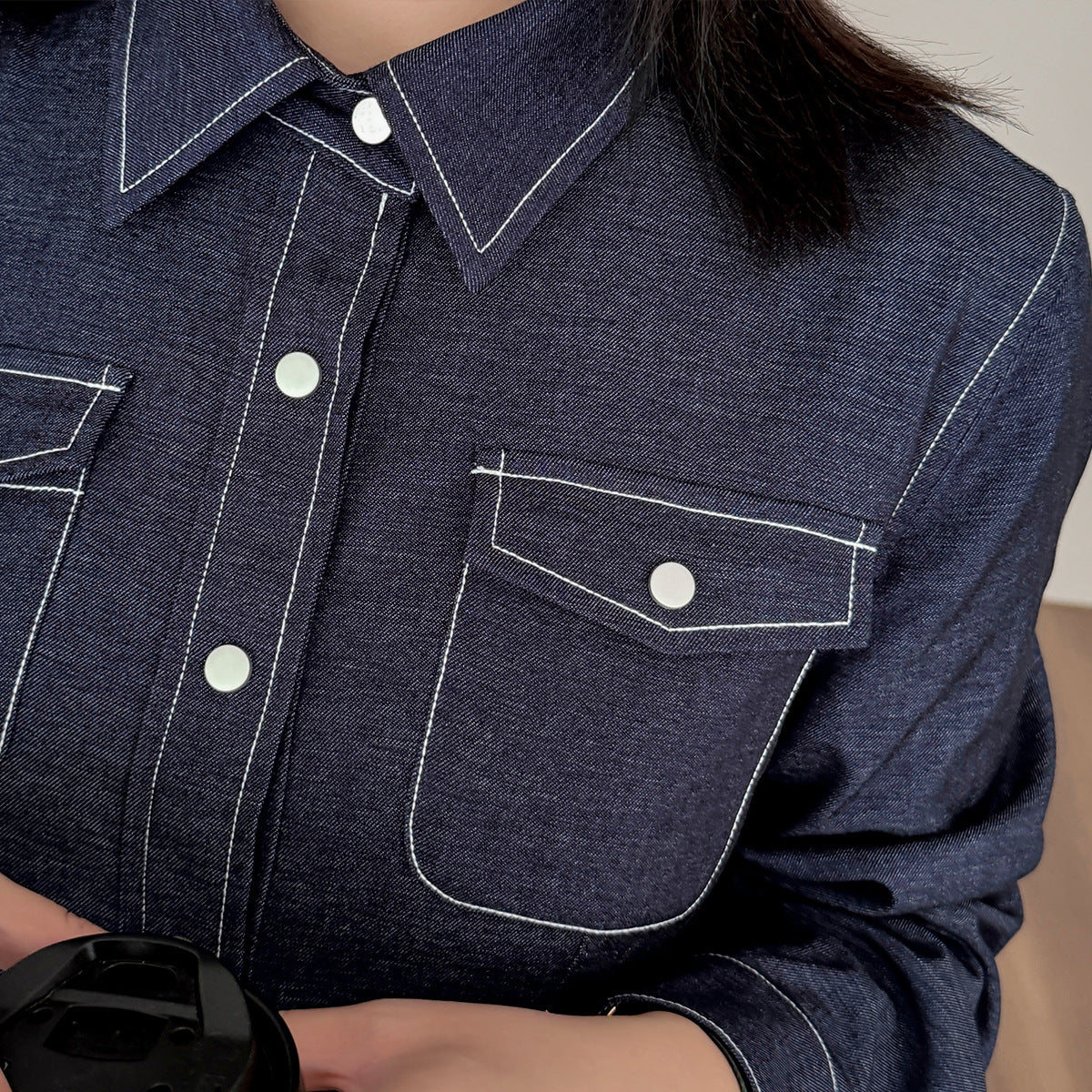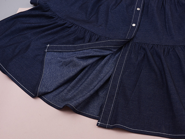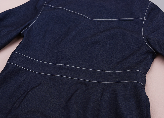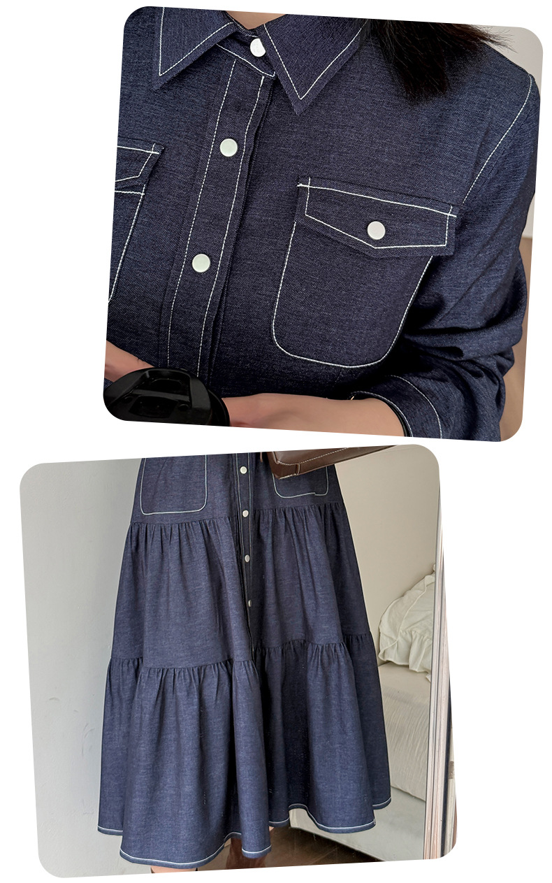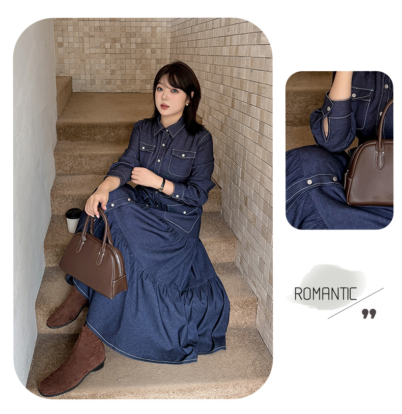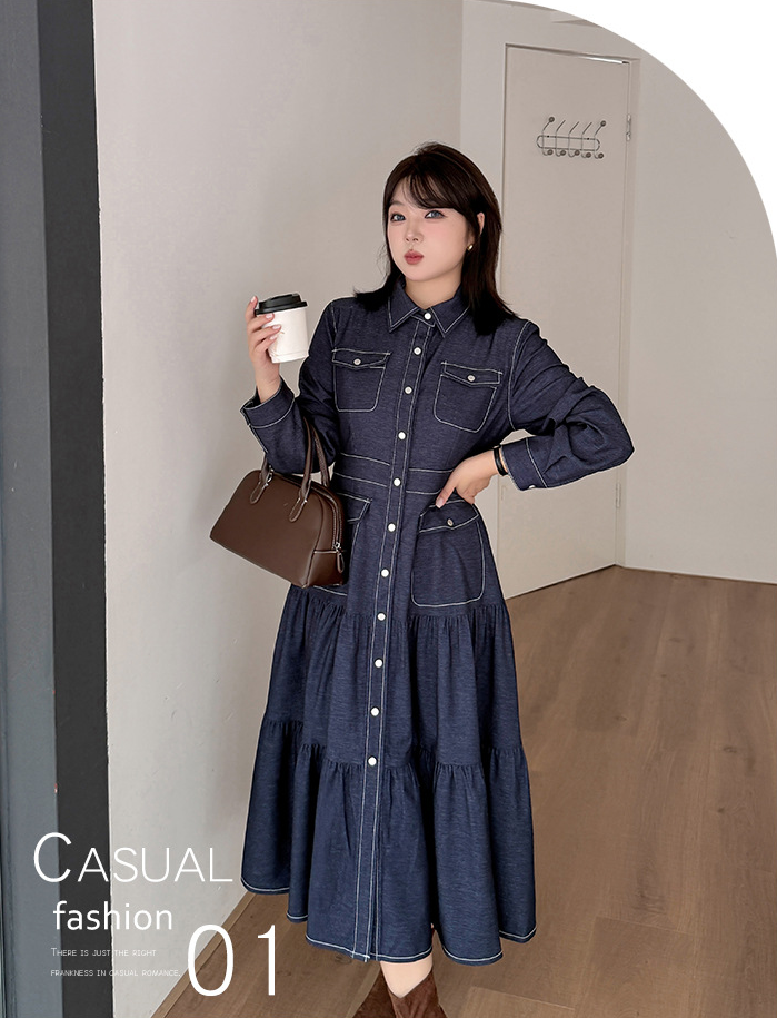 厚手のデニムロングワンピースは、柔らかく通気性のあるデニム生地で作られ、伸縮性のある快適な着心地です。全身に白い明るいラインがマッチしています。タフで力強く、立体的なフォルムを実現。ラペルタイプ、フロントにシルバーのスナップボタンを一列配置、4つのパッチポケット+ポケットカバーのデザインです。袖口にはボタンが付いており、外すこともできます。スカートはミディアム丈で、非常に上質な素材で作られています。