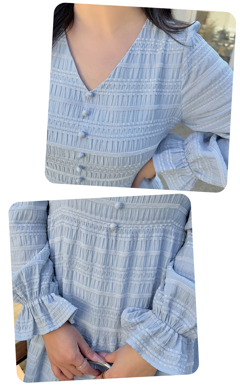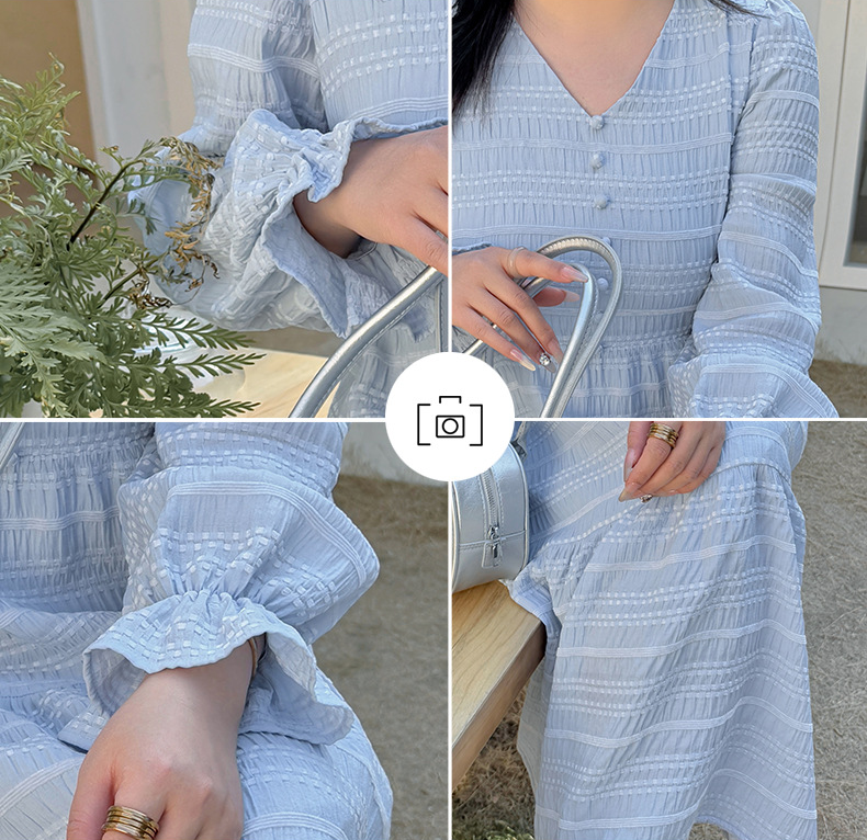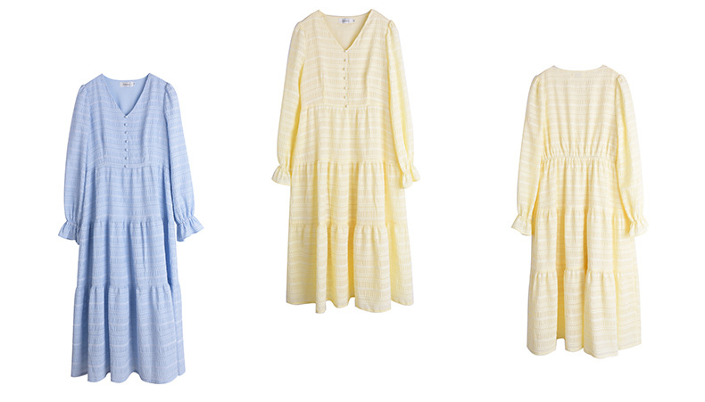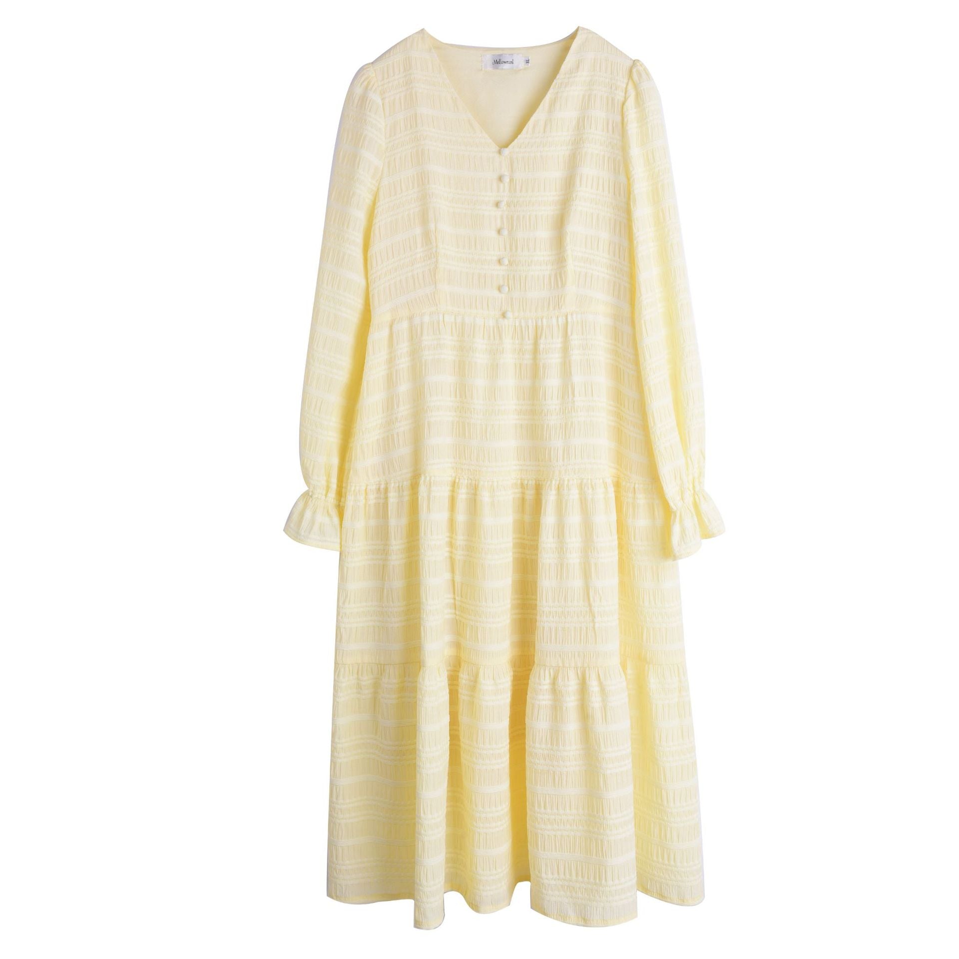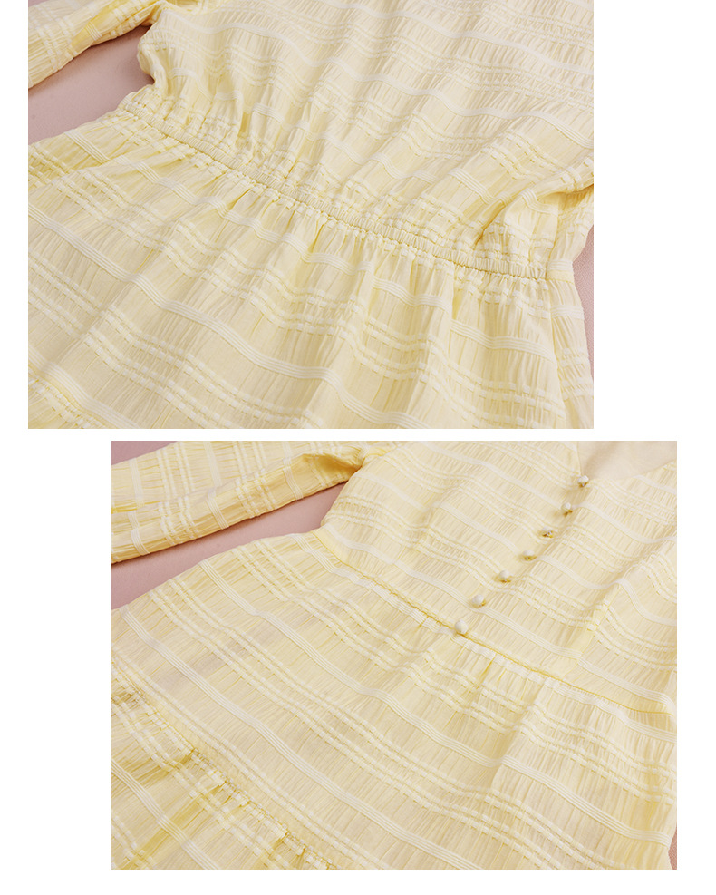 Vネックのステッチフリルワンピースは、清楚で美しくガーリーな印象のワンピースです。ポリエステル生地に横縞とプリーツを加工し、爽やかで柔らかい着心地です。Vネックは滑らかで、フロントの装飾用のボタンが可愛らしいデザインです。バックウエストと袖口は伸縮性があり、上半身を締め付けません。スカートは3枚の継ぎ合わせのステッチで作られており、ミディアム丈で、フェアリー風の優雅な印象が魅力的なワンピースです。
