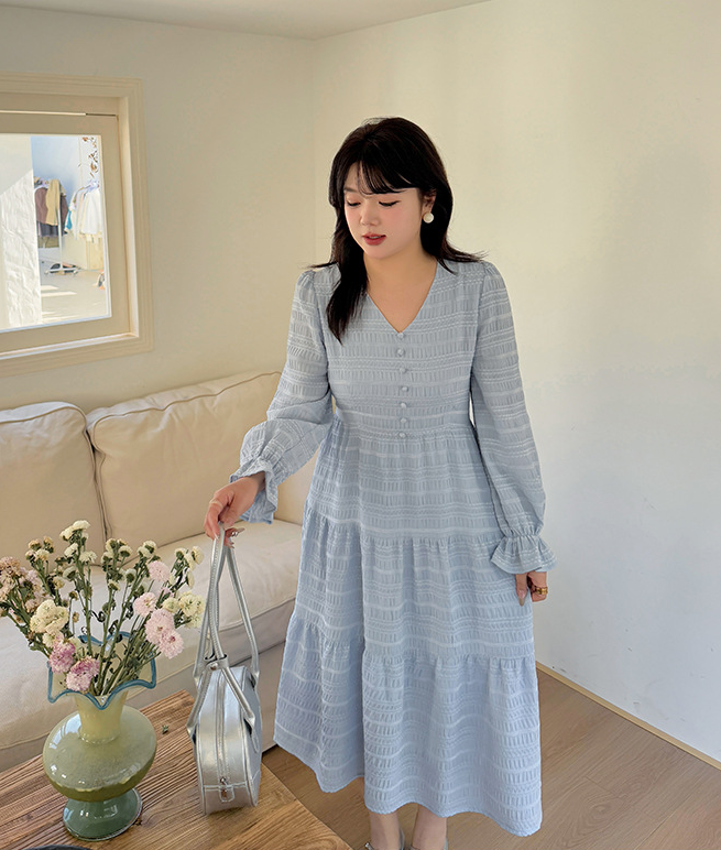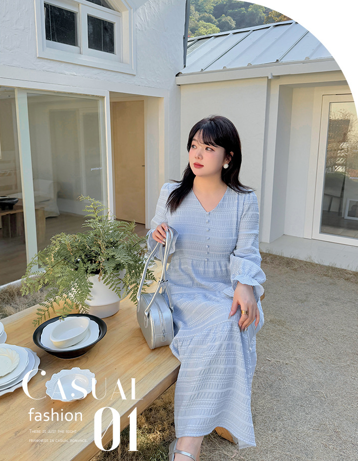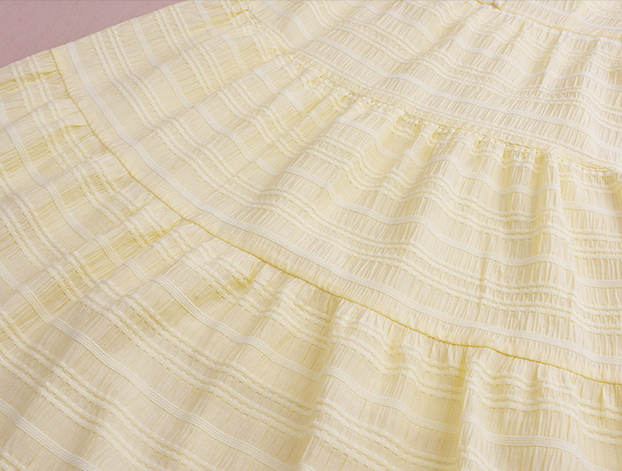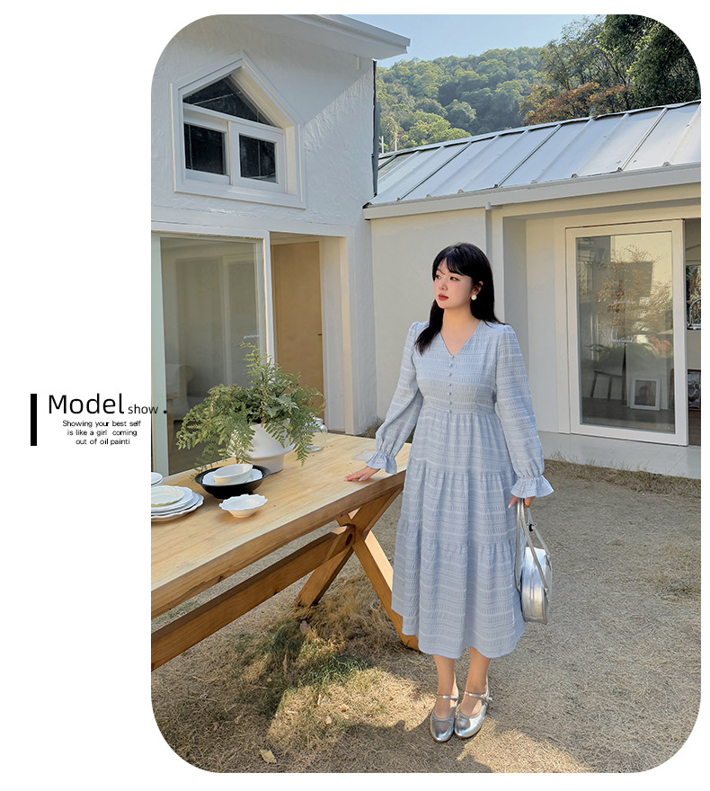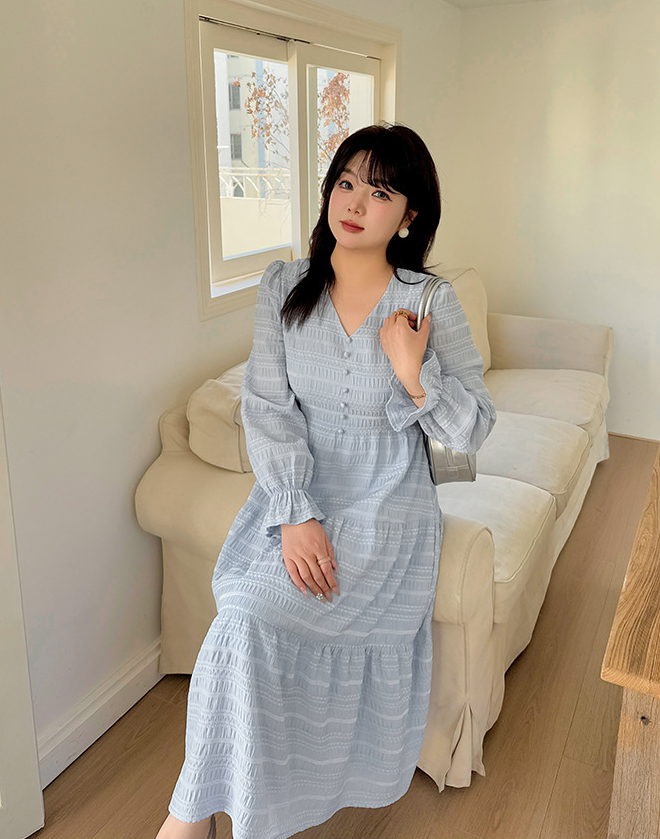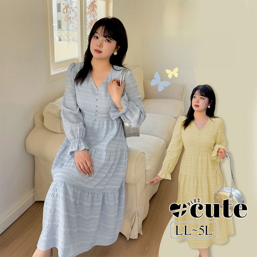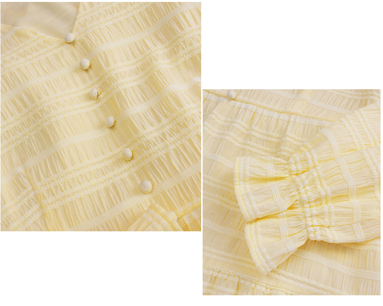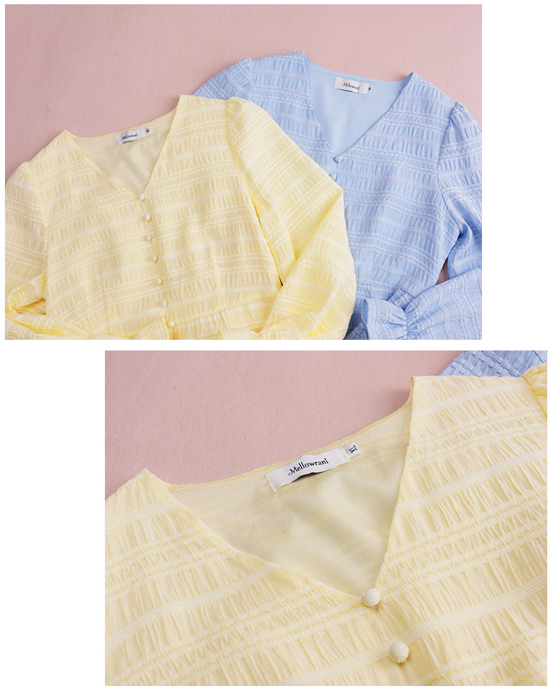 Vネックのステッチフリルワンピースは、清楚で美しくガーリーな印象のワンピースです。ポリエステル生地に横縞とプリーツを加工し、爽やかで柔らかい着心地です。Vネックは滑らかで、フロントの装飾用のボタンが可愛らしいデザインです。バックウエストと袖口は伸縮性があり、上半身を締め付けません。スカートは3枚の継ぎ合わせのステッチで作られており、ミディアム丈で、フェアリー風の優雅な印象が魅力的なワンピースです。