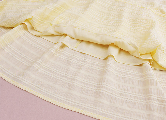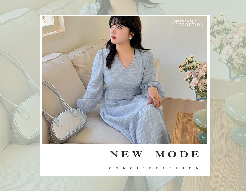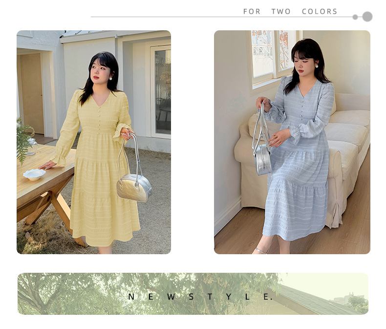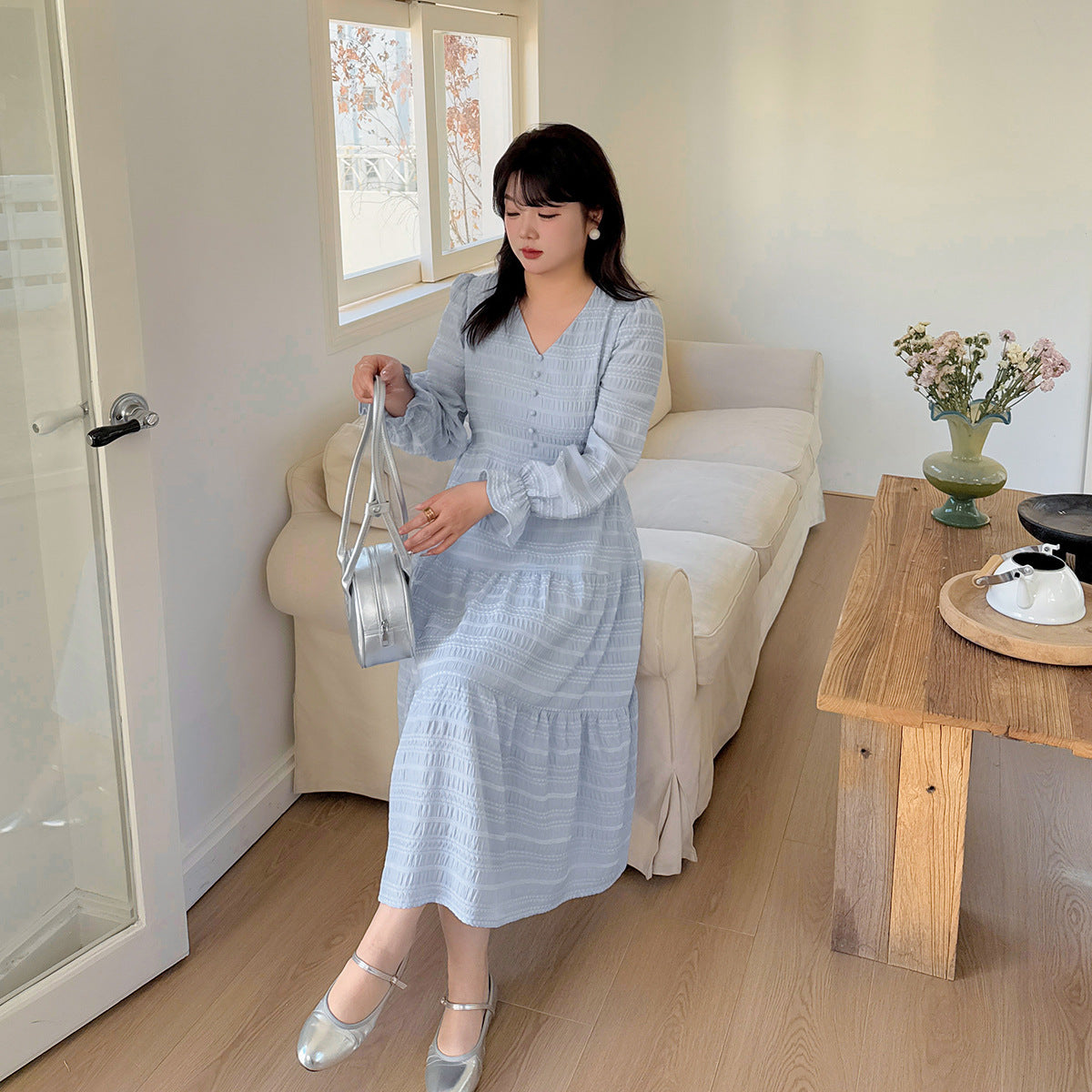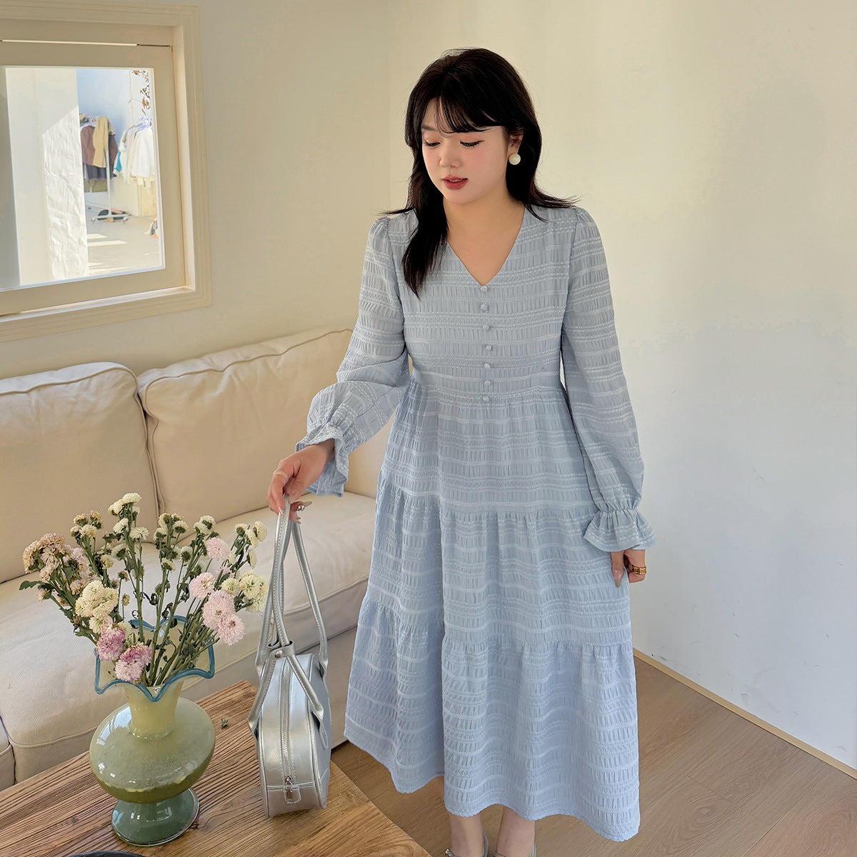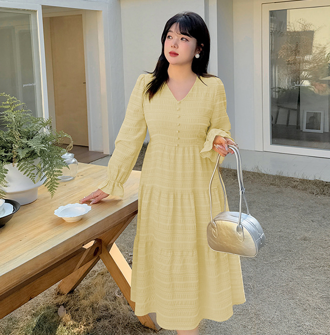 Vネックのステッチフリルワンピースは、清楚で美しくガーリーな印象のワンピースです。ポリエステル生地に横縞とプリーツを加工し、爽やかで柔らかい着心地です。Vネックは滑らかで、フロントの装飾用のボタンが可愛らしいデザインです。バックウエストと袖口は伸縮性があり、上半身を締め付けません。スカートは3枚の継ぎ合わせのステッチで作られており、ミディアム丈で、フェアリー風の優雅な印象が魅力的なワンピースです。