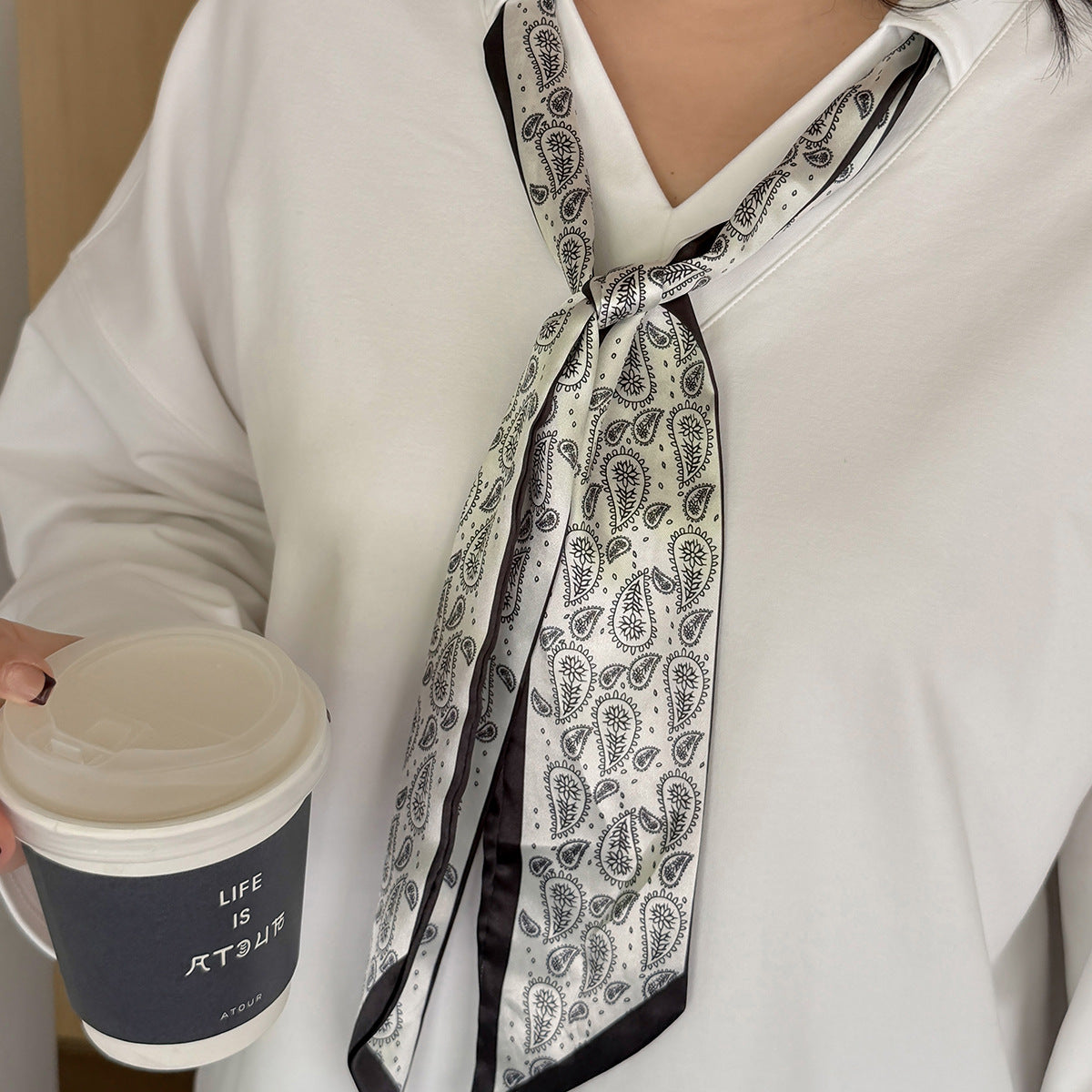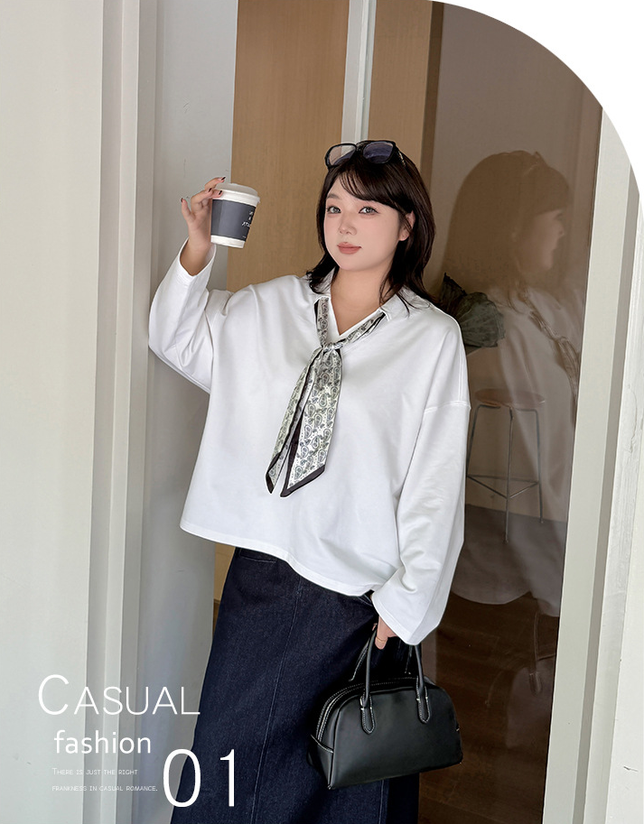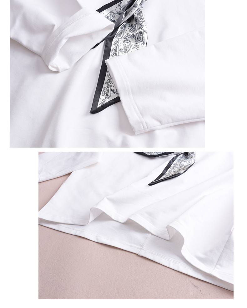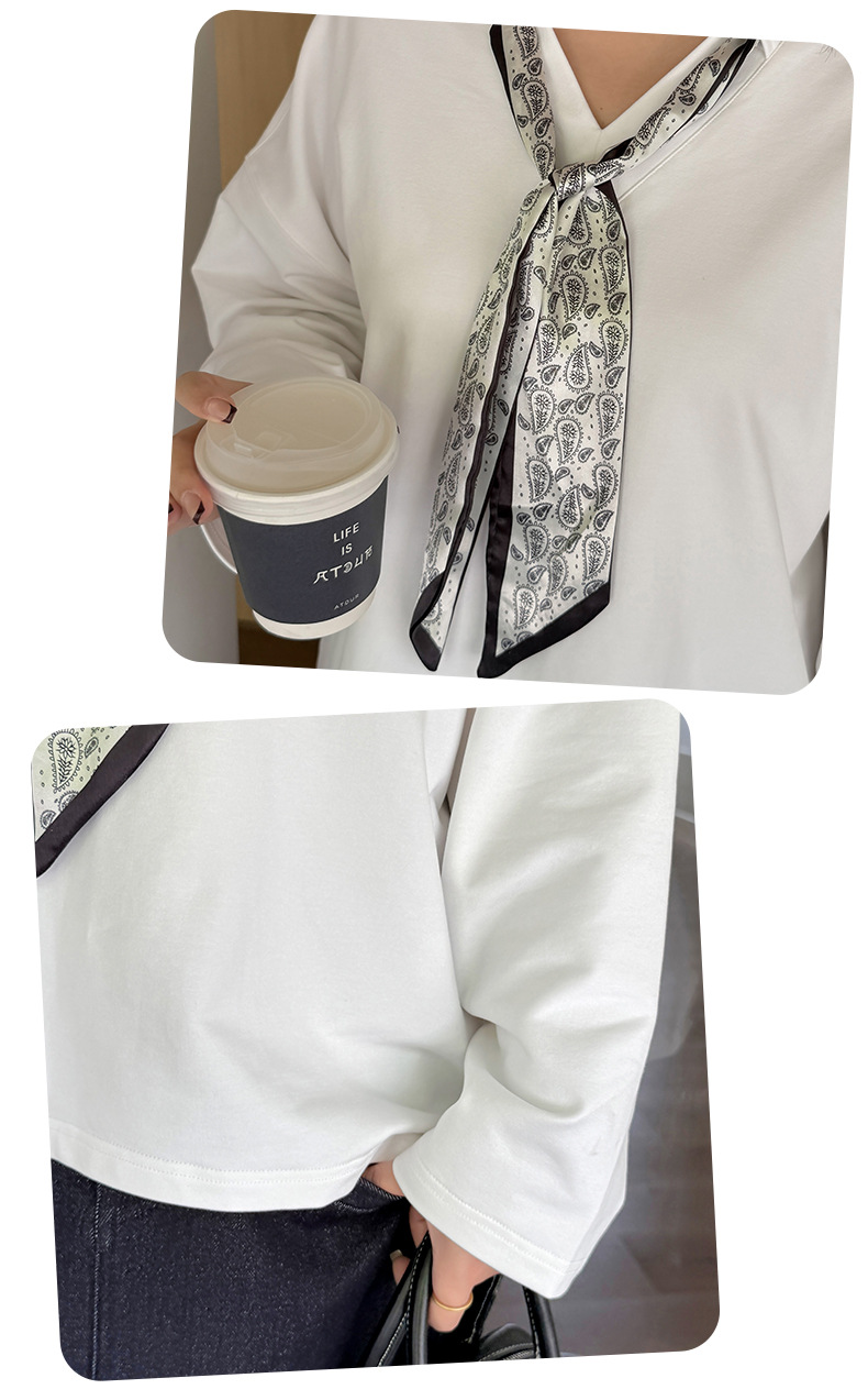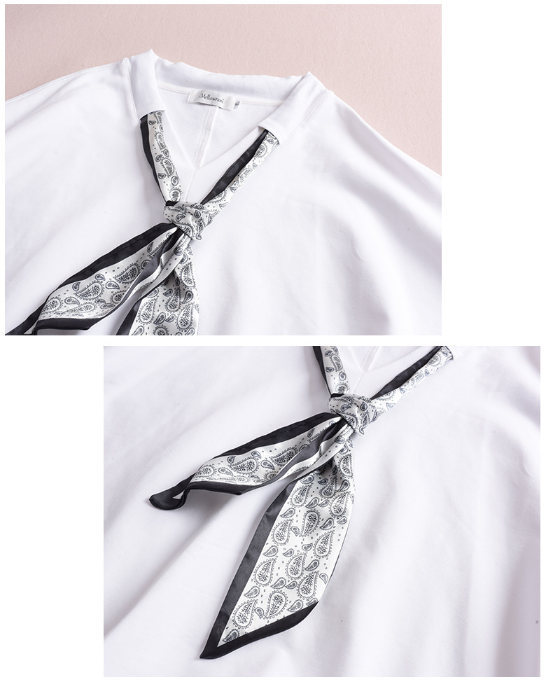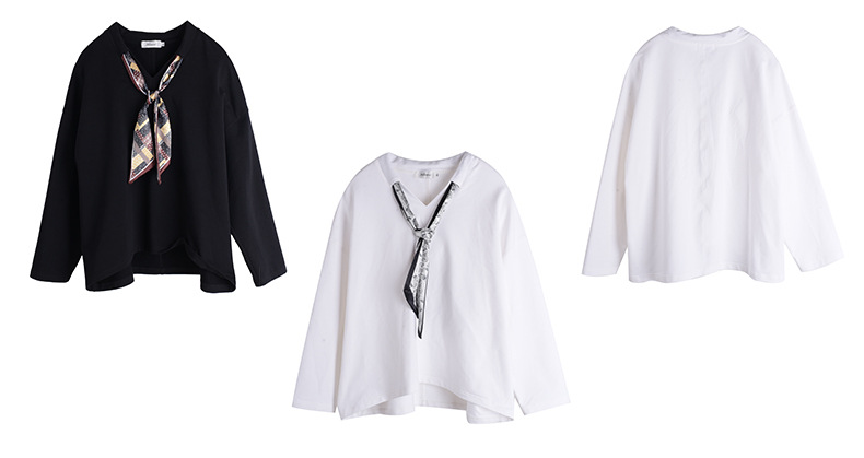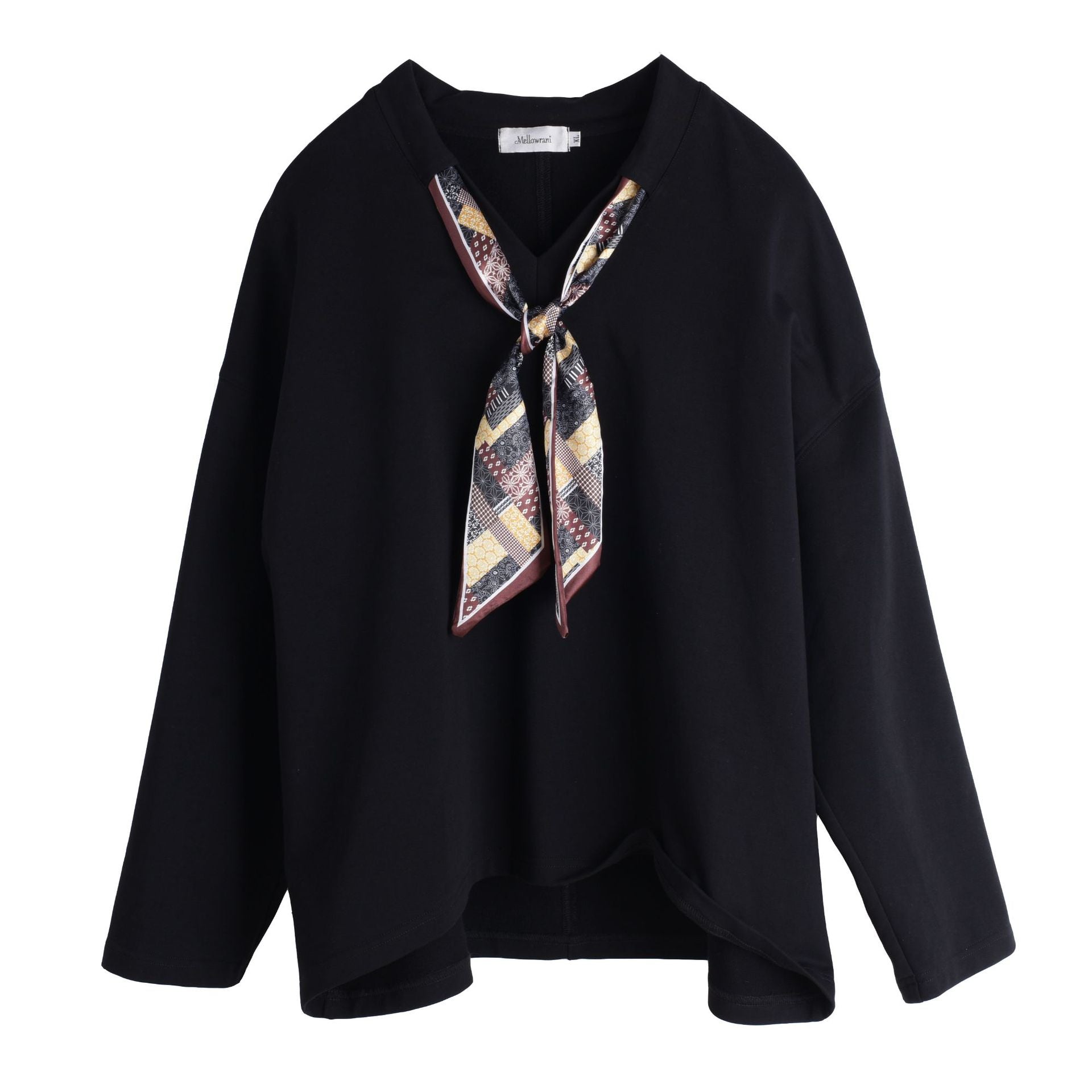Vネックニットスウェットシャツは、柔らかいミディアムテリーニット生地で作られています。通気性、吸汗性、伸縮性に優れています。Vネックが、スカーフリボンで飾られています。リボンで結ぶことも可能です。ゆったりとしたドロップショルダースタイルで、一枚でもインナーとしても着心地抜群です。通勤にも最適で、ファッショナブルな雰囲気のスウェットシャツを是非お試しください。