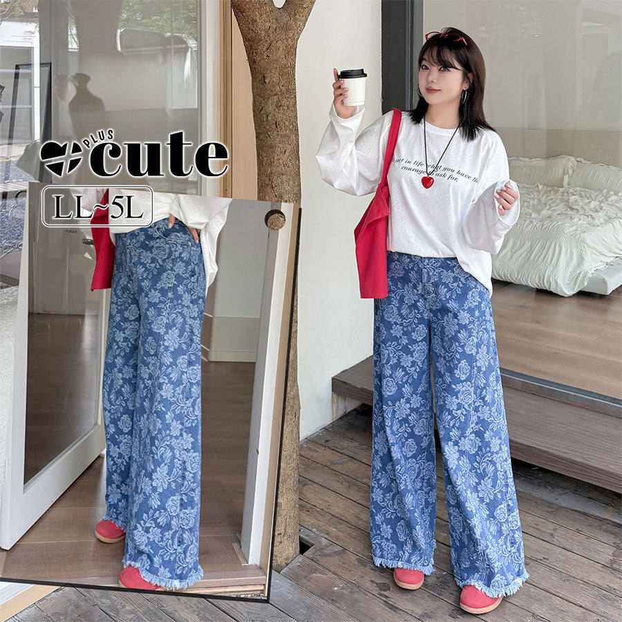 大きいサイズ レディース ヴィンテージ風ジャカードデニムワイドレッグパンツ LL 3L 4L 5L