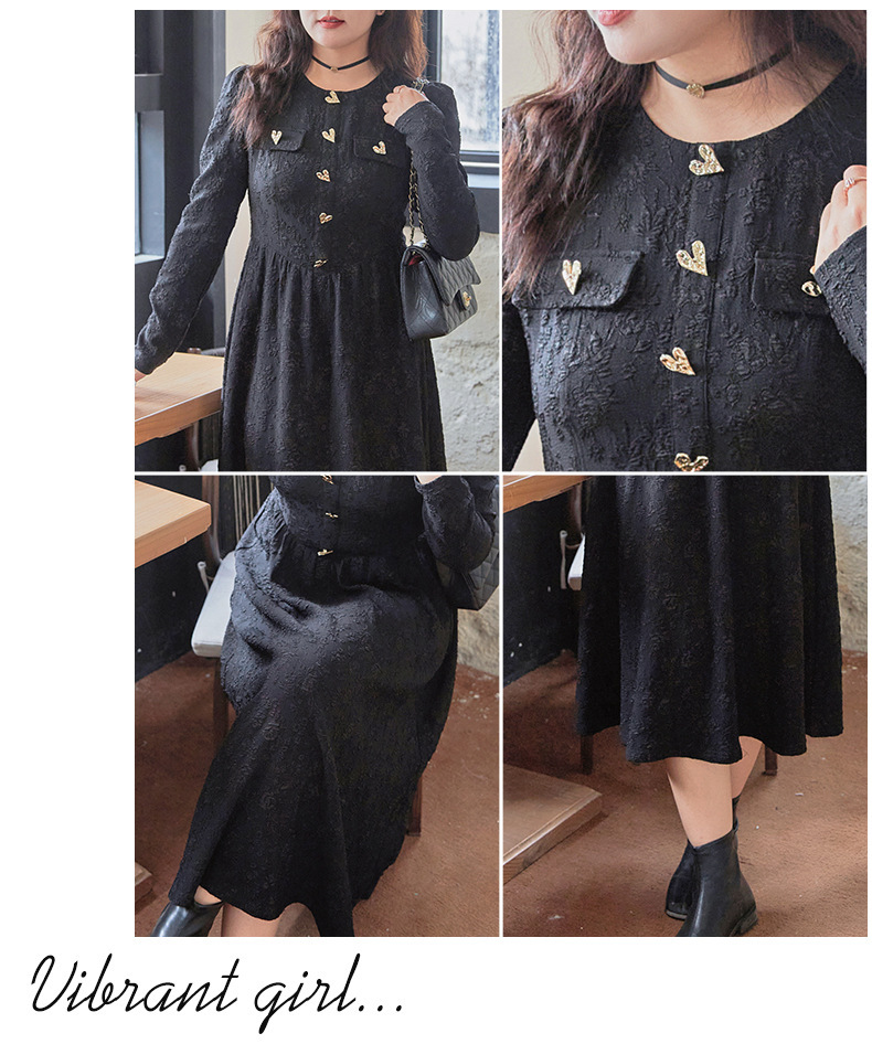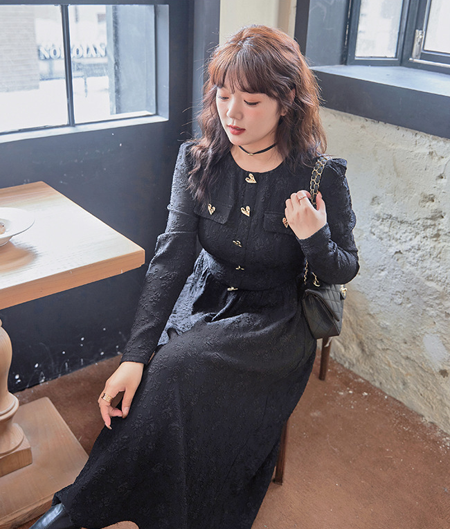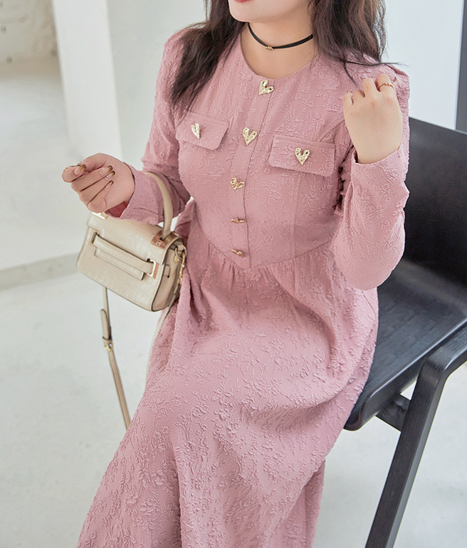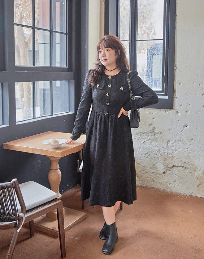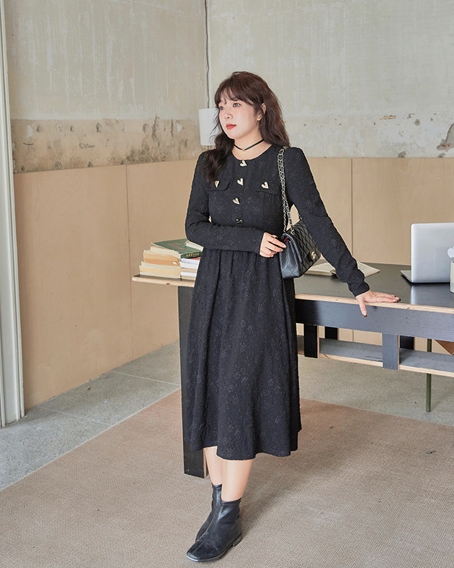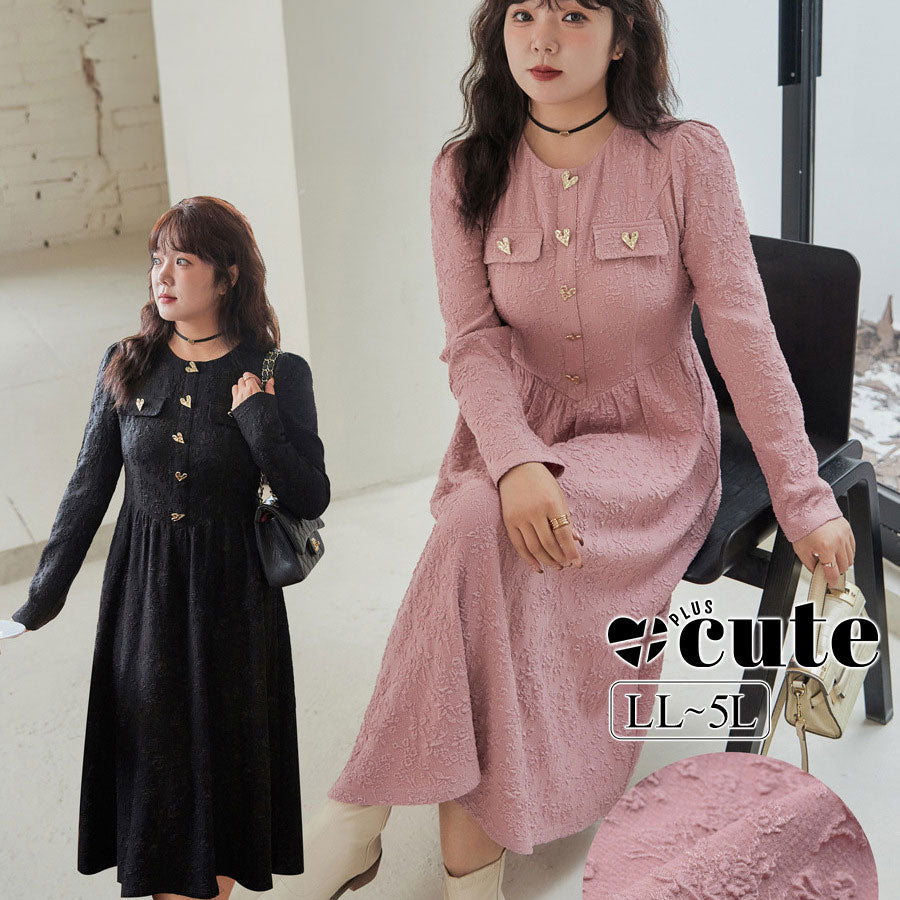大きいサイズ レディース ハート型ボタンラウンドネック花柄ジャカードウエストワンピース LL 3L 4L 5L