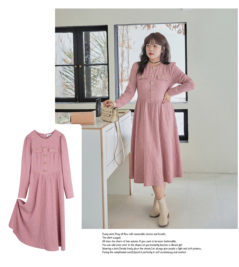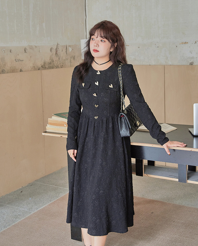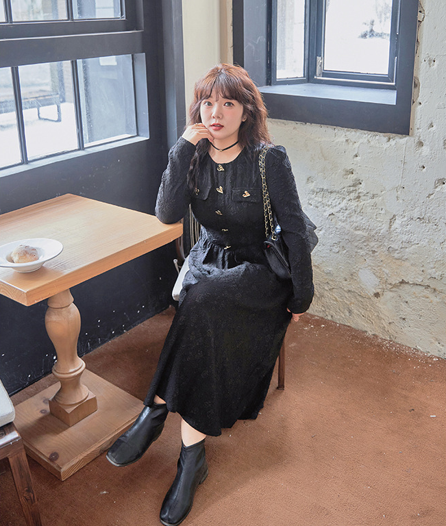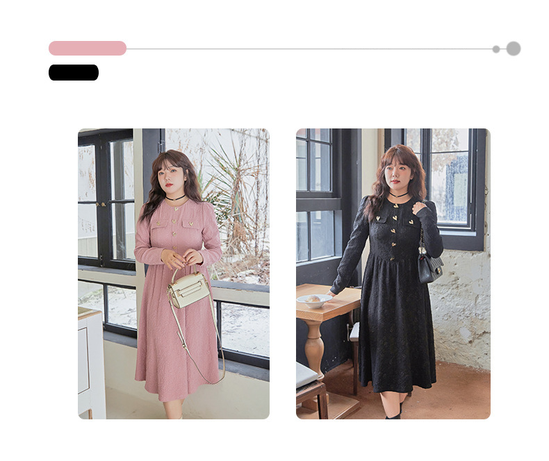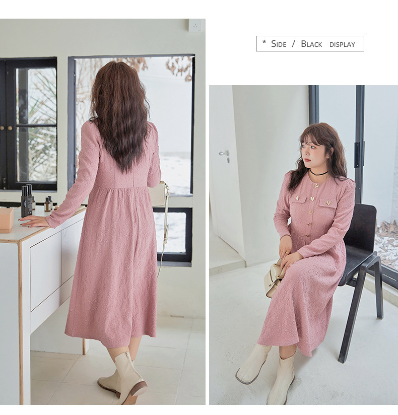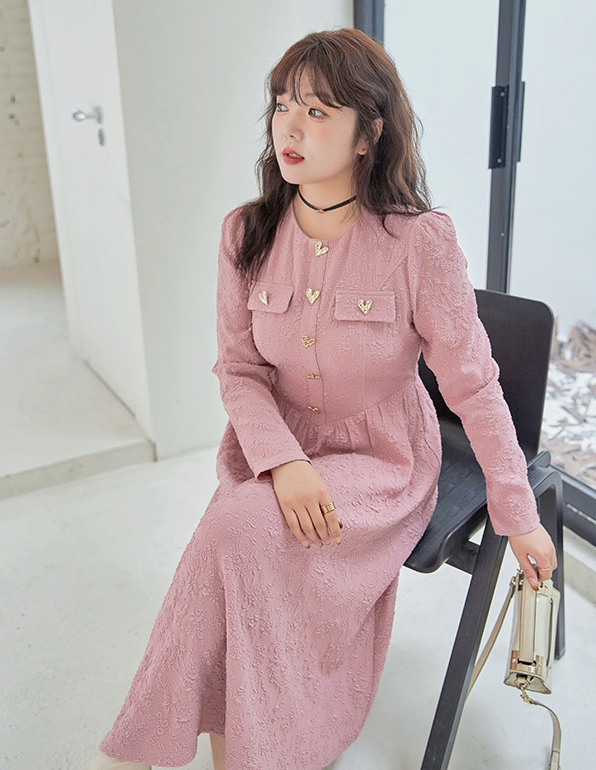 大きいサイズ レディース ハート型ボタンラウンドネック花柄ジャカードウエストワンピース LL 3L 4L 5L