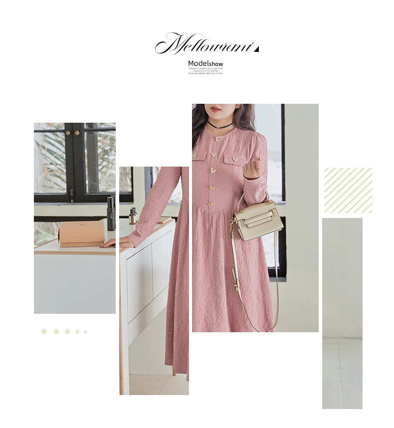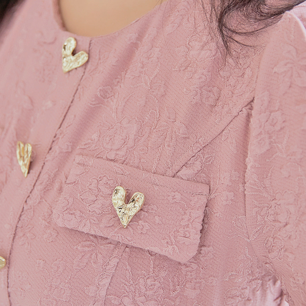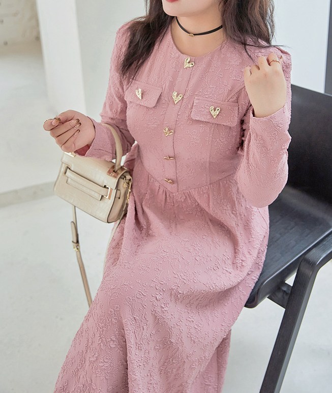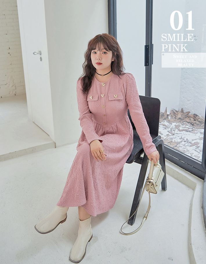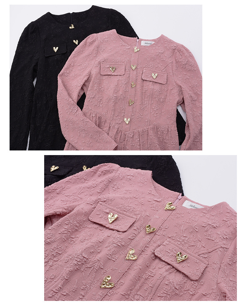 ラウンドネックでウエストを包み込むワンピースは、立体的な花柄のジャカード生地を使用しています。ジャカード織りは織り目が豊かで、伸縮性があり滑らかな触り心地です。ラウンドネックラインが特徴です。フロントにはポケットフラップをあしらい、センターフロントにはゴールドのハート型ボタンをあしらっています。後ろには隠しファスナーがあり、プリーツウエストとアンブレラスカートは優しく落ち着いた印象で、甘い雰囲気を醸し出しています。