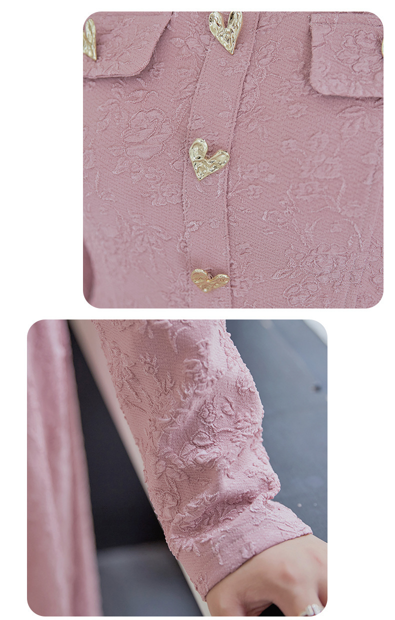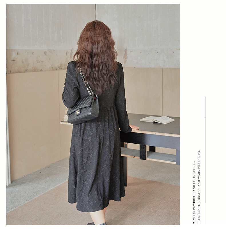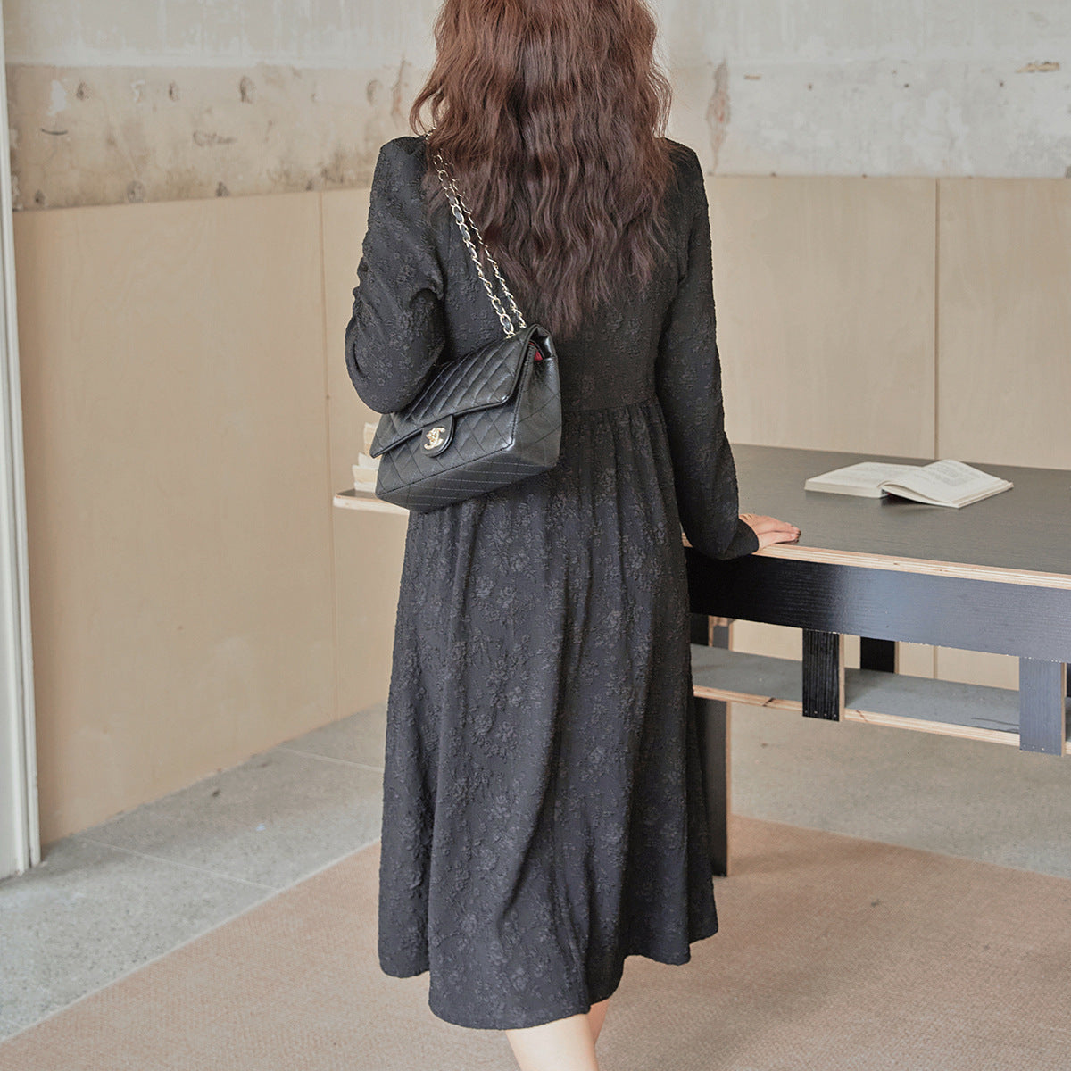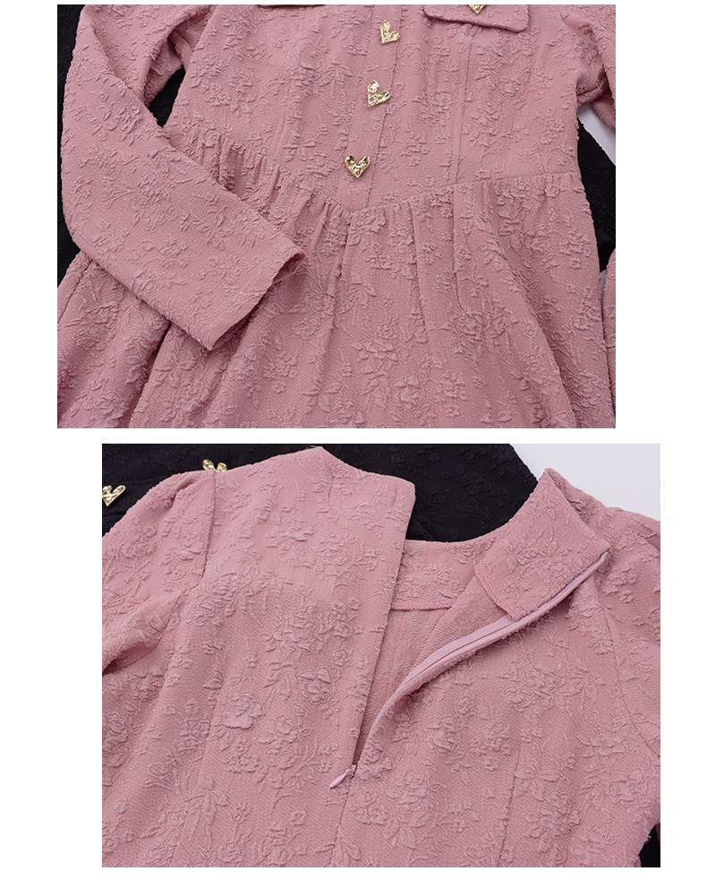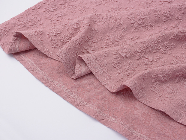 ラウンドネックでウエストを包み込むワンピースは、立体的な花柄のジャカード生地を使用しています。ジャカード織りは織り目が豊かで、伸縮性があり滑らかな触り心地です。ラウンドネックラインが特徴です。フロントにはポケットフラップをあしらい、センターフロントにはゴールドのハート型ボタンをあしらっています。後ろには隠しファスナーがあり、プリーツウエストとアンブレラスカートは優しく落ち着いた印象で、甘い雰囲気を醸し出しています。