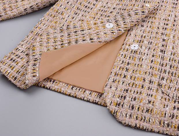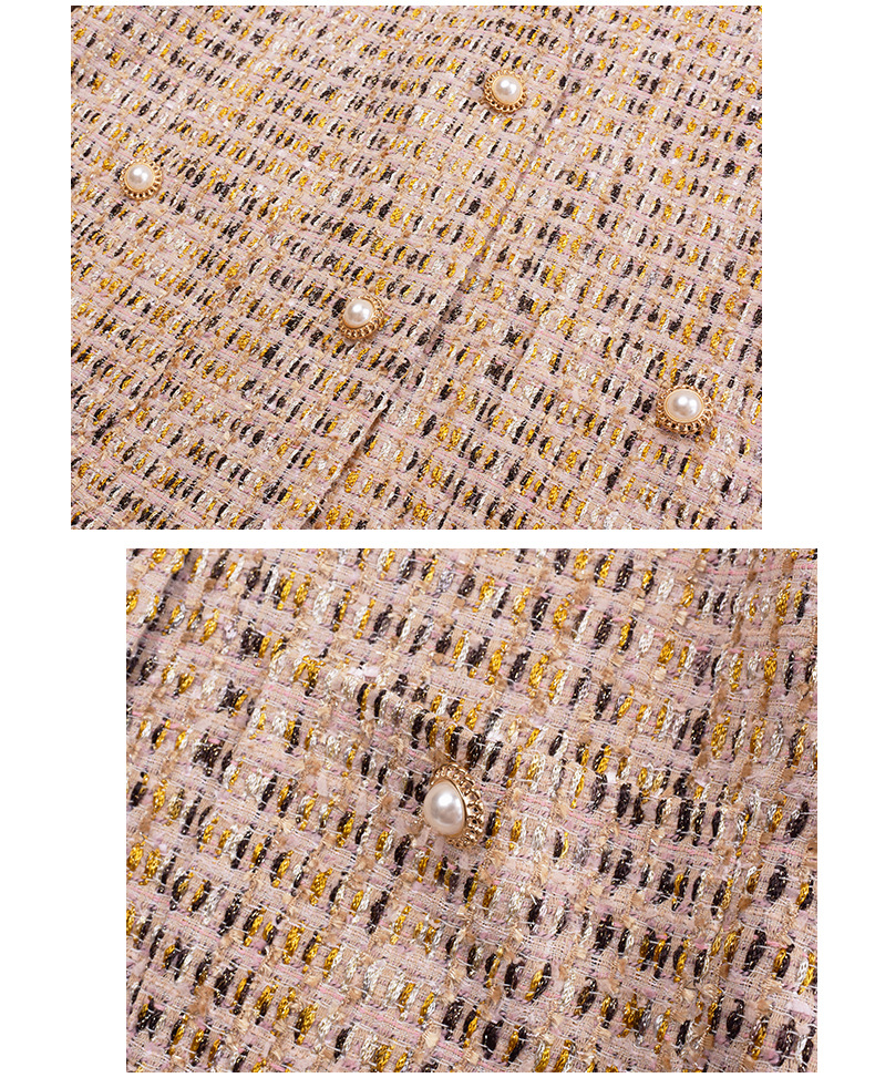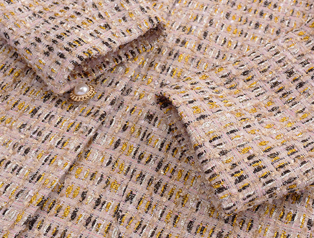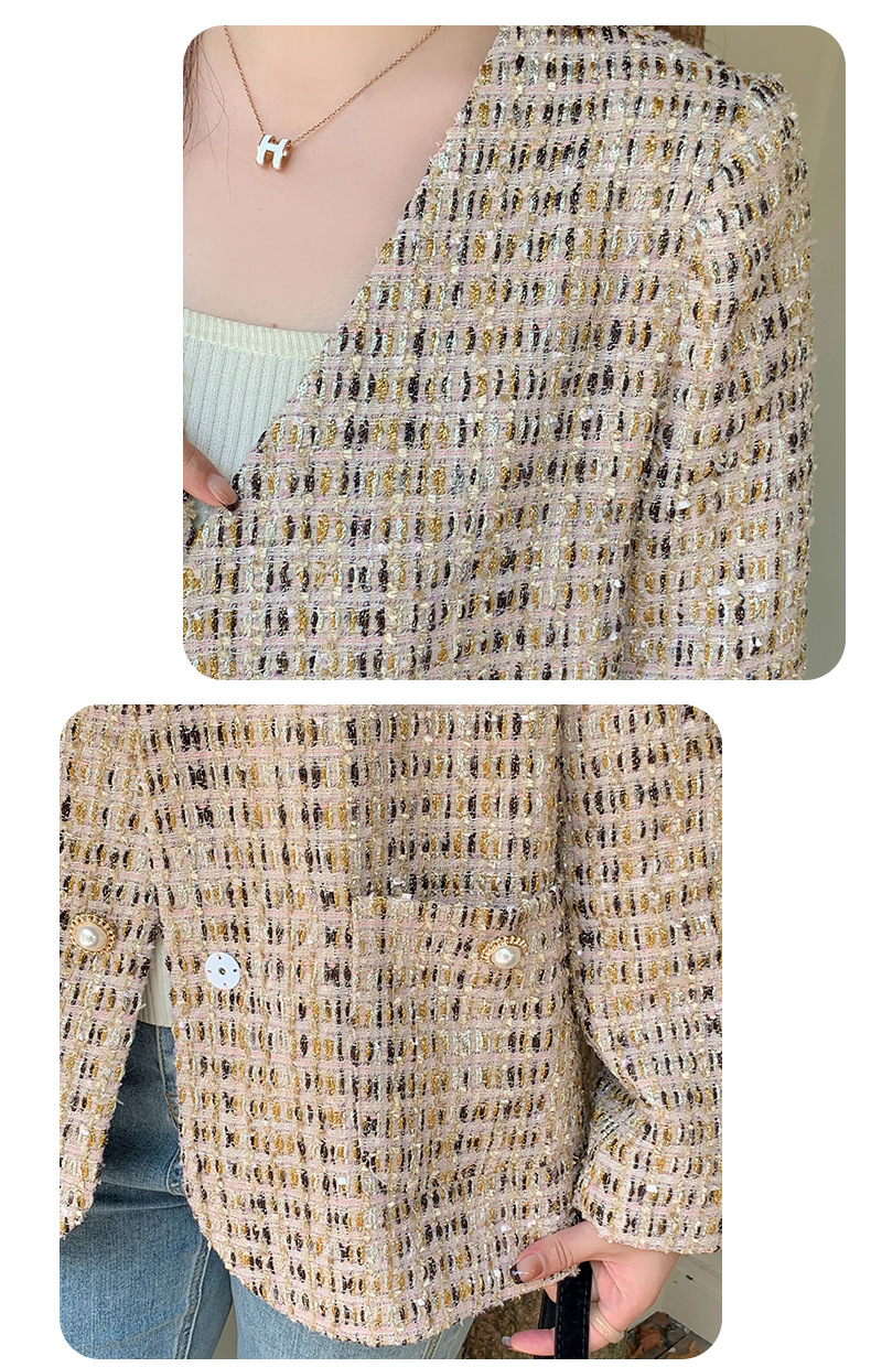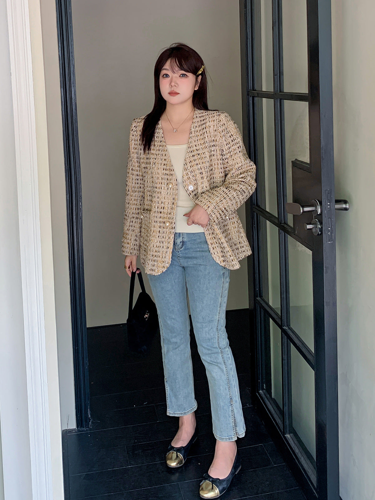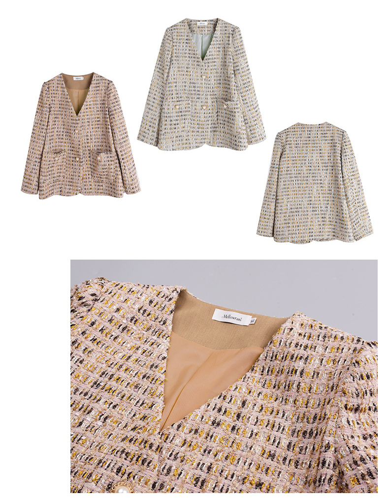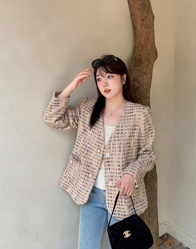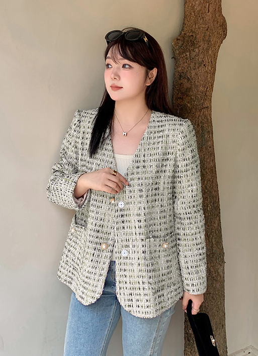 フレンチシンプルなスタイルのVネックツイードジャケットが登場。複数色の金糸が織り込まれたツイード生地で作られています。肩パッドが付いていて、ショルダーラインを綺麗に見せます。フロントにはセンターボタン、両サイドにはスナップボタン付きのパッチポケットがあります。ゆったりとしたスタイルで、コーデのポイントになるようなアウターです。