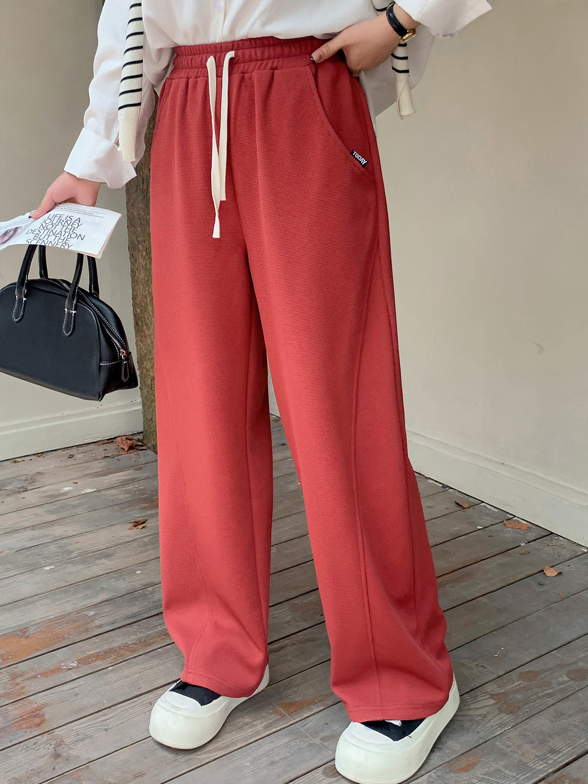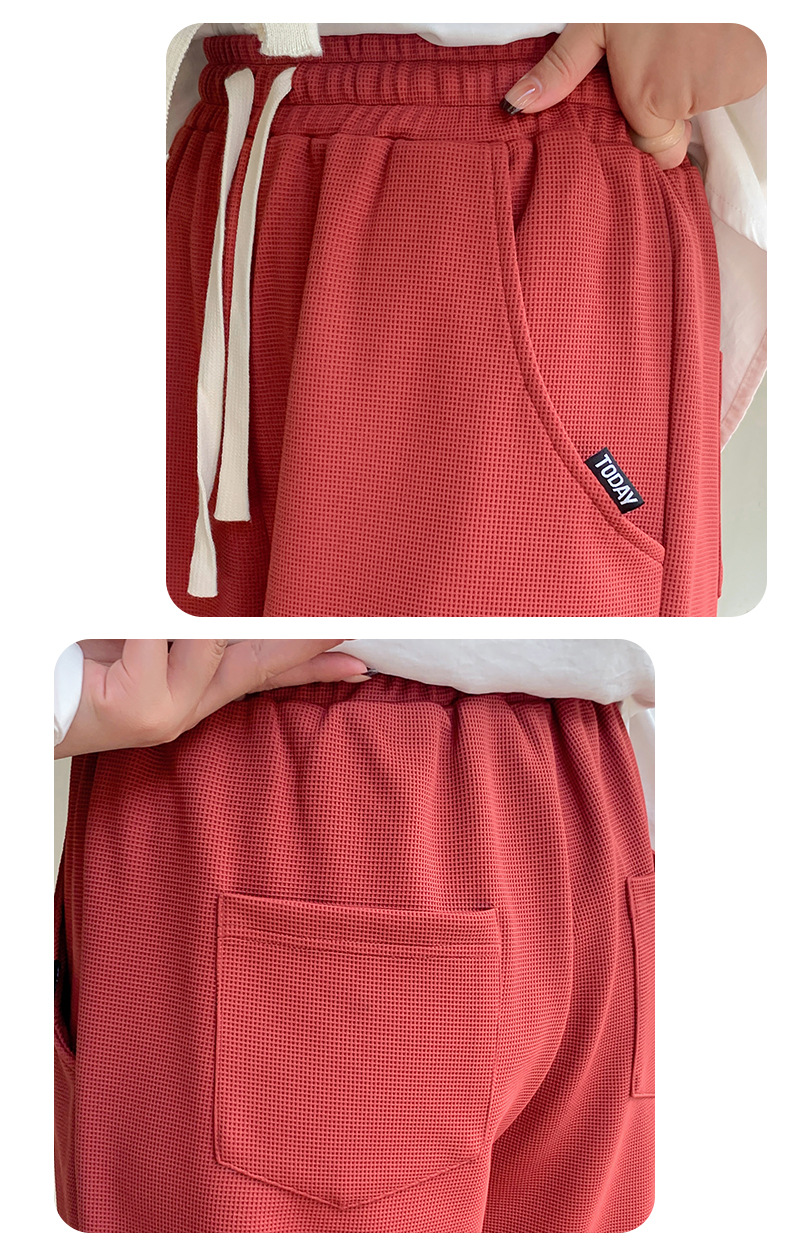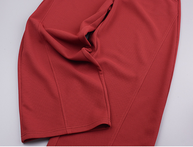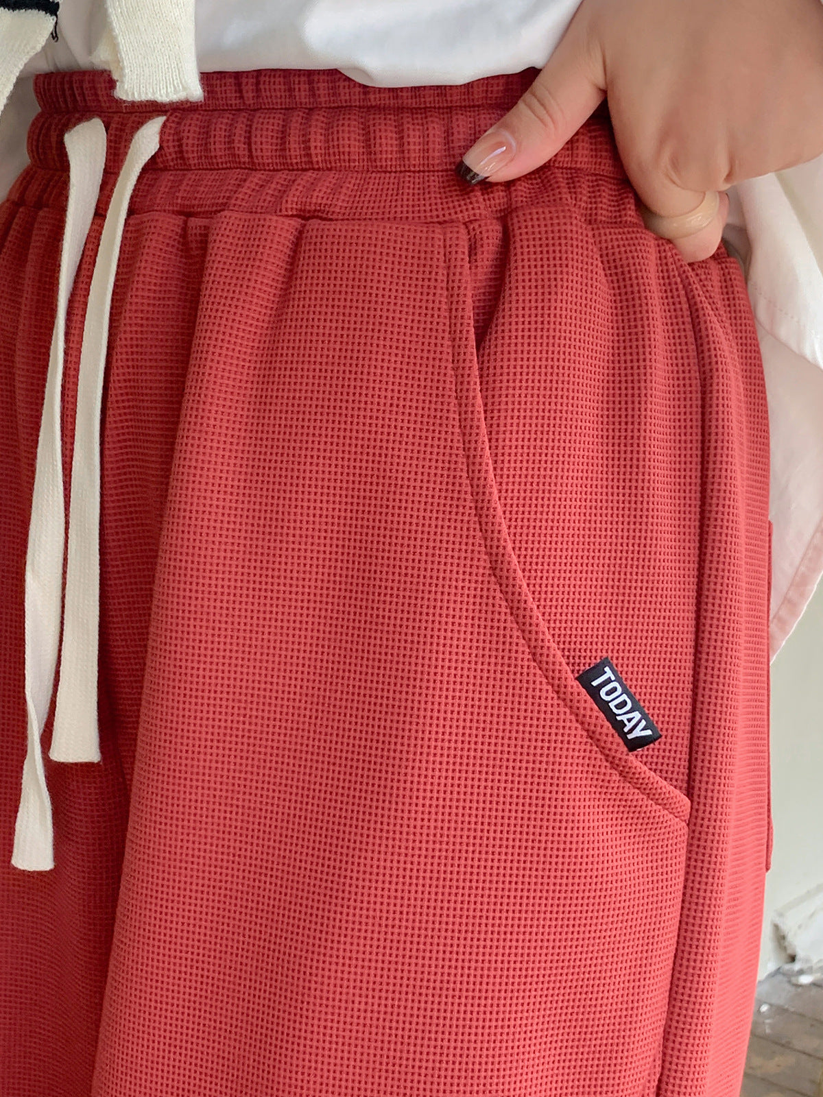 カジュアルでスリムフィットなシルエットが綺麗なニット生地パンツ。表面に細かいチェック柄の凹凸があり、伸縮性と通気性があります。ハイウエストタイプなので脚長効果も期待できます。また、ウエストゴムなので、お腹を締め付けない快適な着用感をお楽しみいただけます。両サイドにスリップポケットがあるのも便利で、左ポケットのラベルデザインがワンポイントの可愛さを引き立てます。