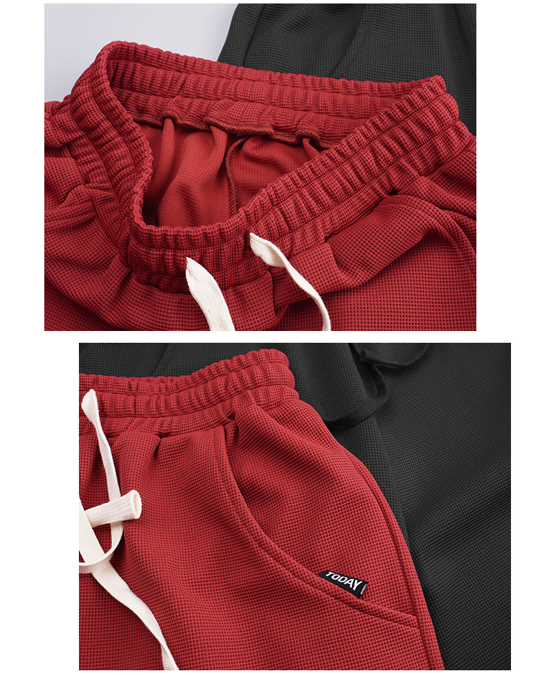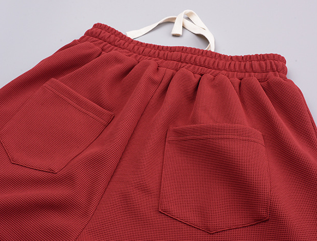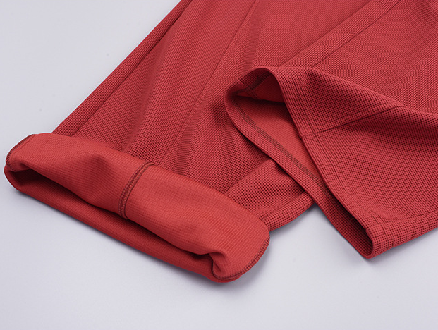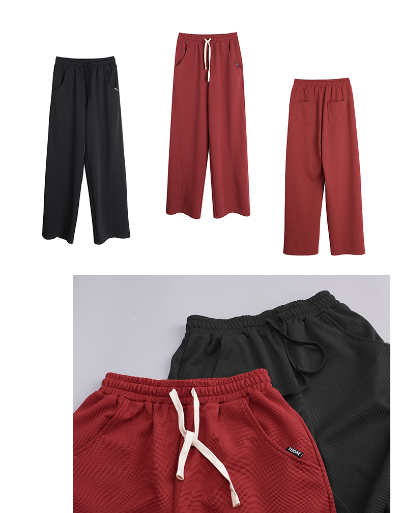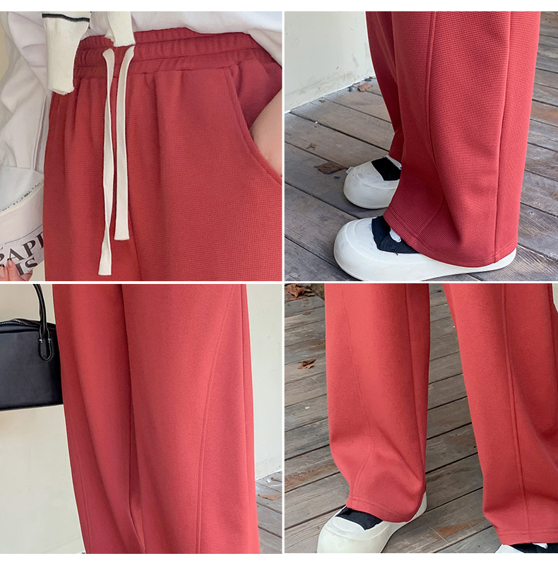 カジュアルでスリムフィットなシルエットが綺麗なニット生地パンツ。表面に細かいチェック柄の凹凸があり、伸縮性と通気性があります。ハイウエストタイプなので脚長効果も期待できます。また、ウエストゴムなので、お腹を締め付けない快適な着用感をお楽しみいただけます。両サイドにスリップポケットがあるのも便利で、左ポケットのラベルデザインがワンポイントの可愛さを引き立てます。