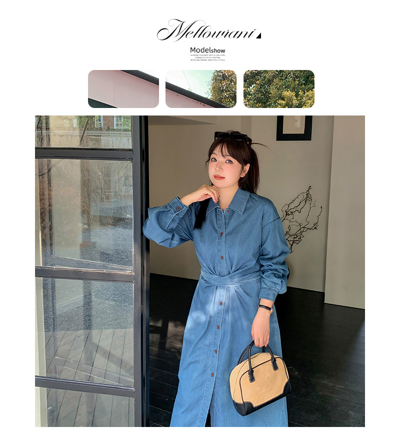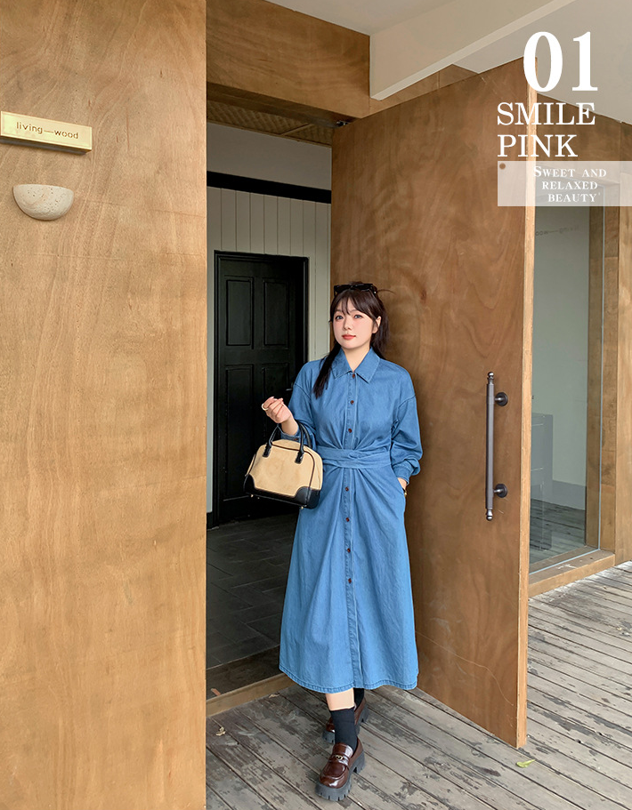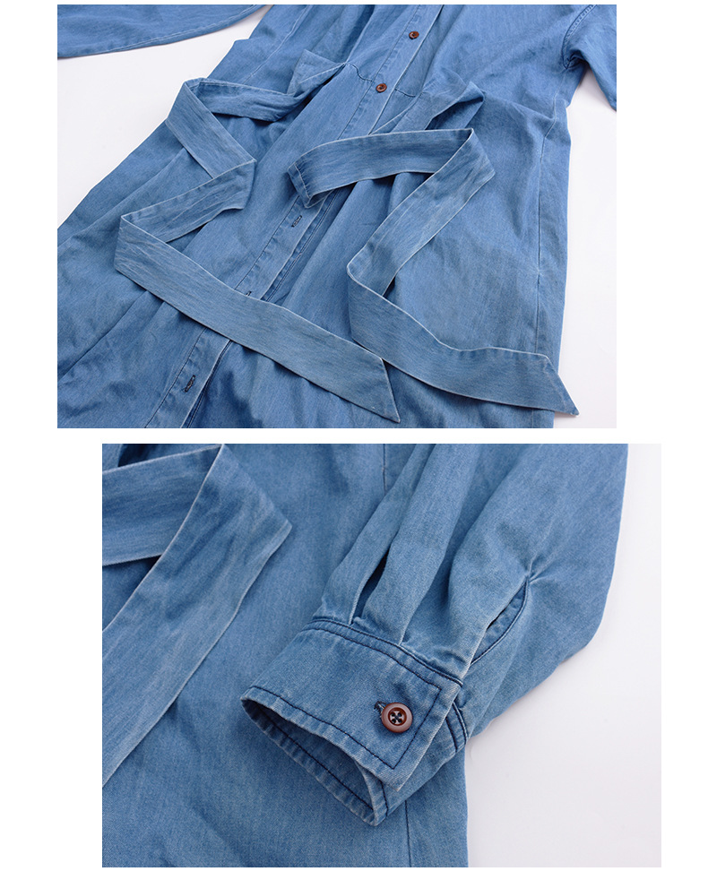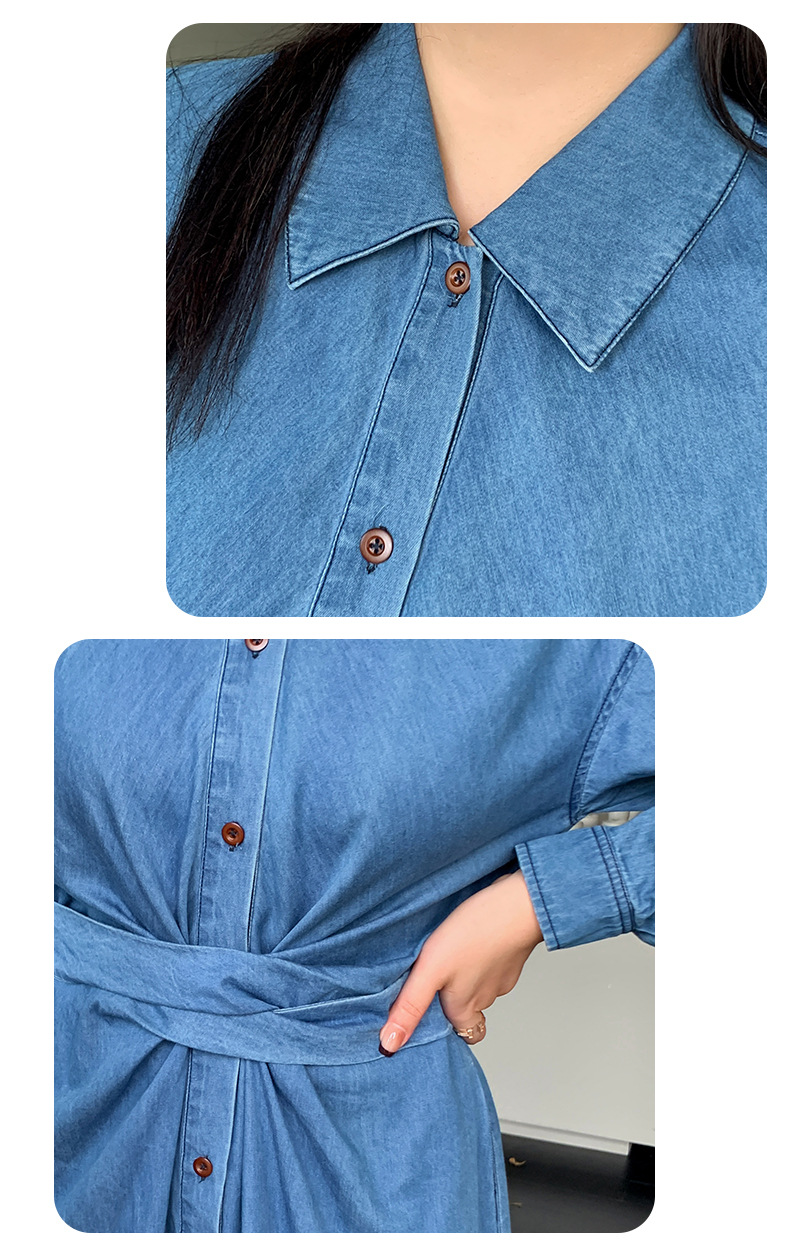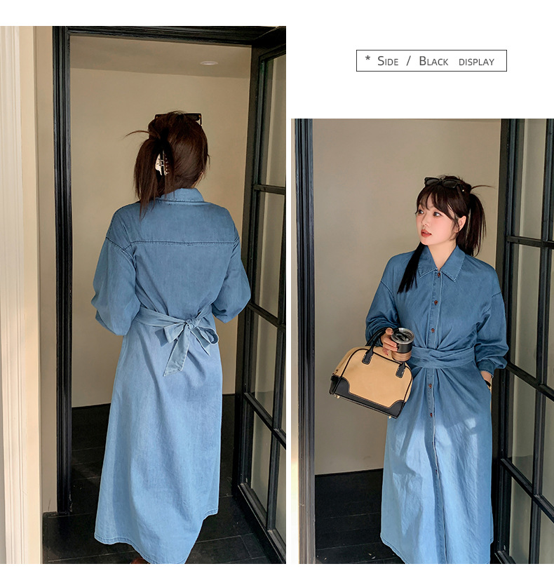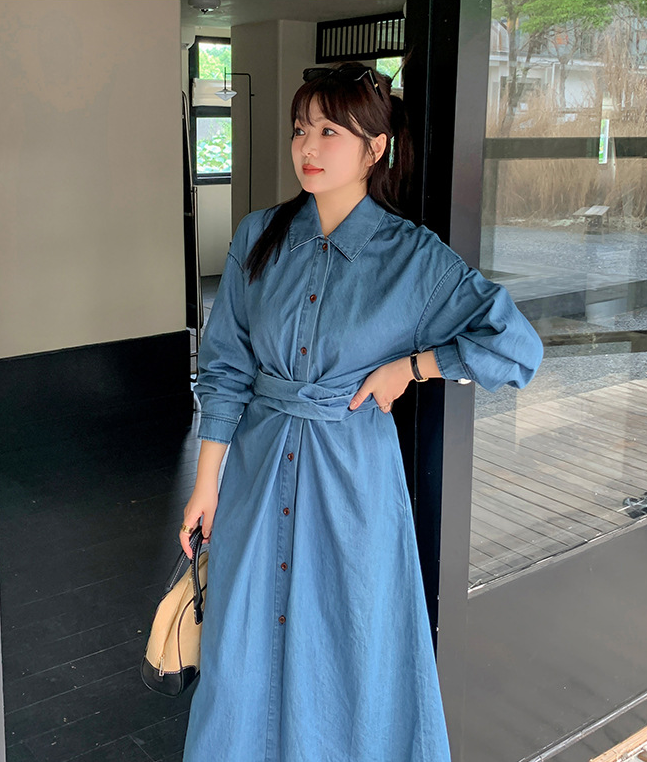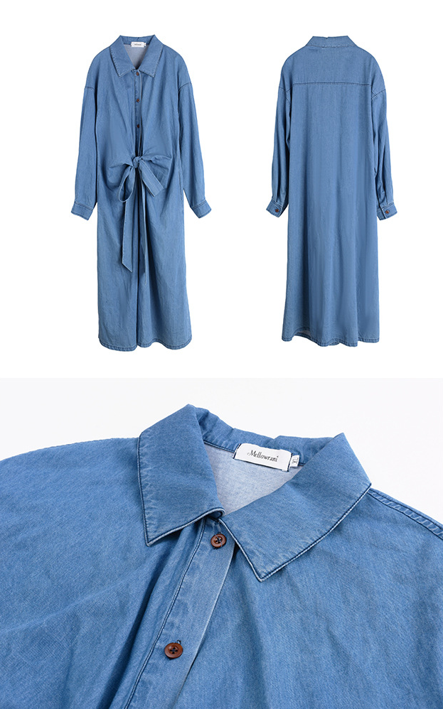 ラペルとベルト付きのデザイン性のあるロングワンピースです。柔らかく通気性の良いウォッシュドデニム生地を使用しています。ウエストはクロスデザインになっており、後ろで結ぶことで、ウエストを細く見せることができます。フロント中央のボタンは上から下まで外すことができます。カジュアルで快適なので、季節の変わり目にピッタリのアイテムです。