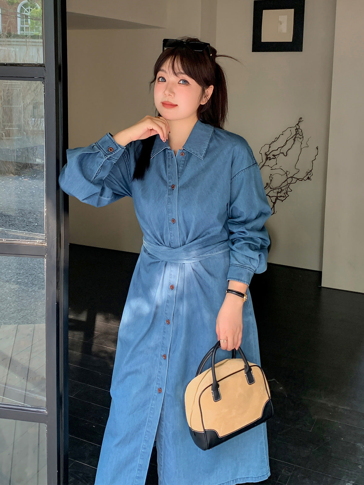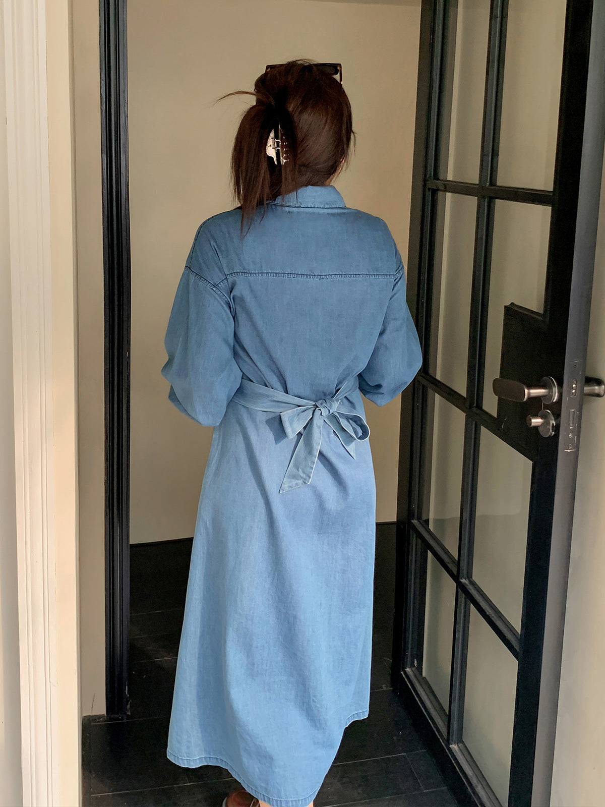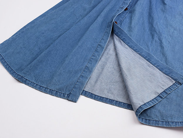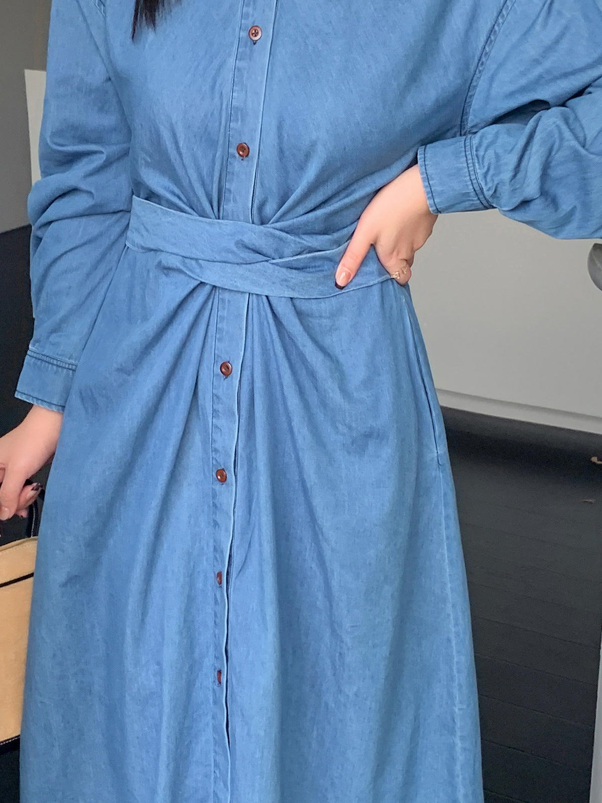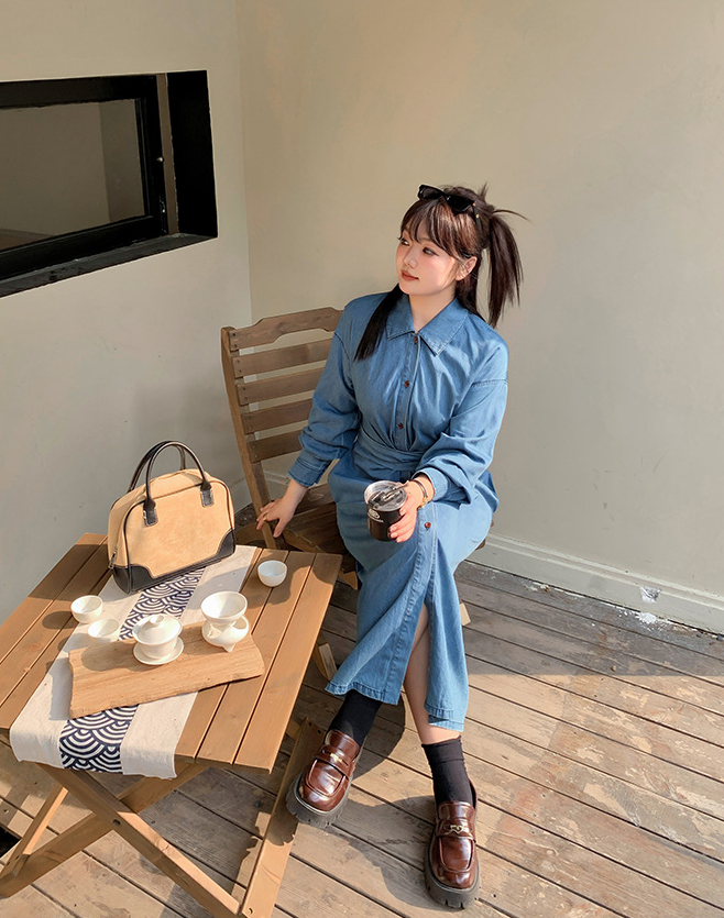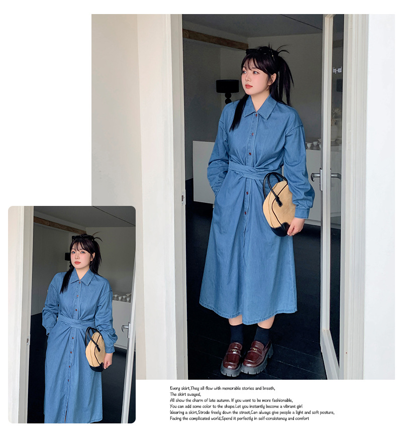 ラペルとベルト付きのデザイン性のあるロングワンピースです。柔らかく通気性の良いウォッシュドデニム生地を使用しています。ウエストはクロスデザインになっており、後ろで結ぶことで、ウエストを細く見せることができます。フロント中央のボタンは上から下まで外すことができます。カジュアルで快適なので、季節の変わり目にピッタリのアイテムです。