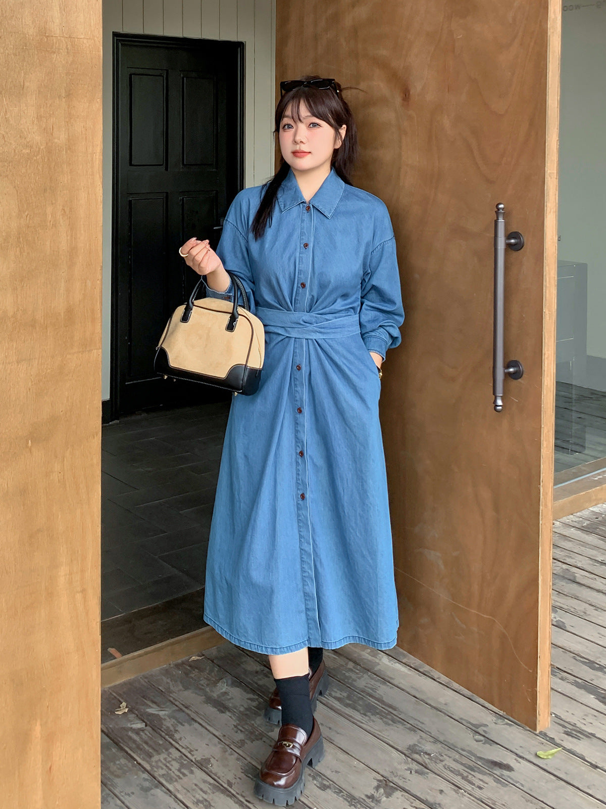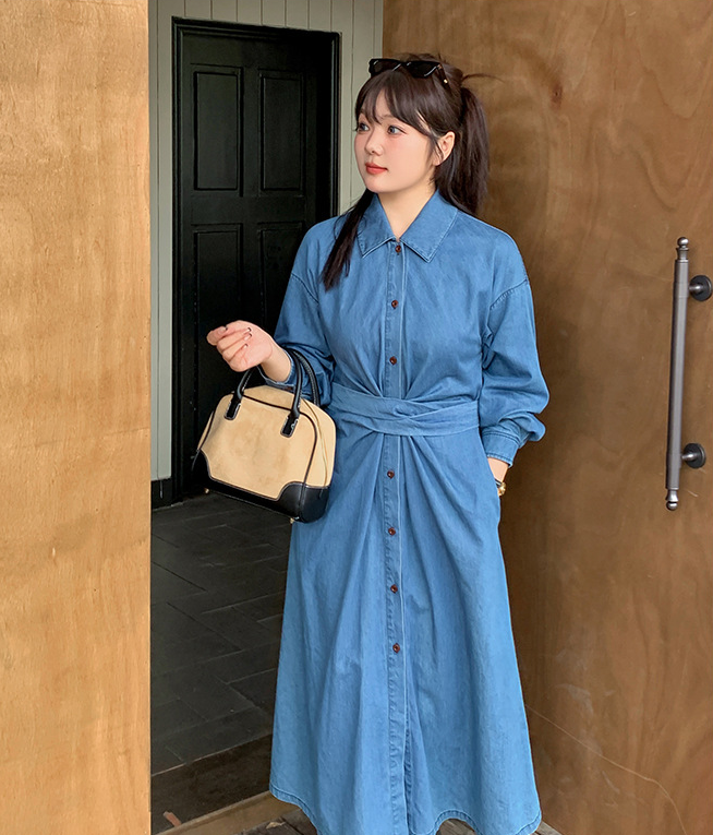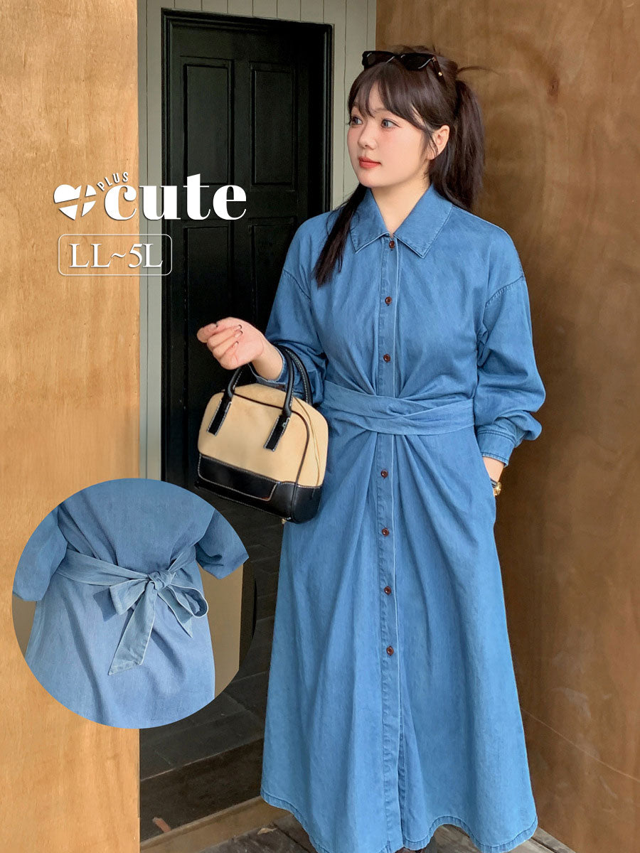 大きいサイズ レディース ウエストクロスデニム長袖ワンピース LL 3L 4L 5L
