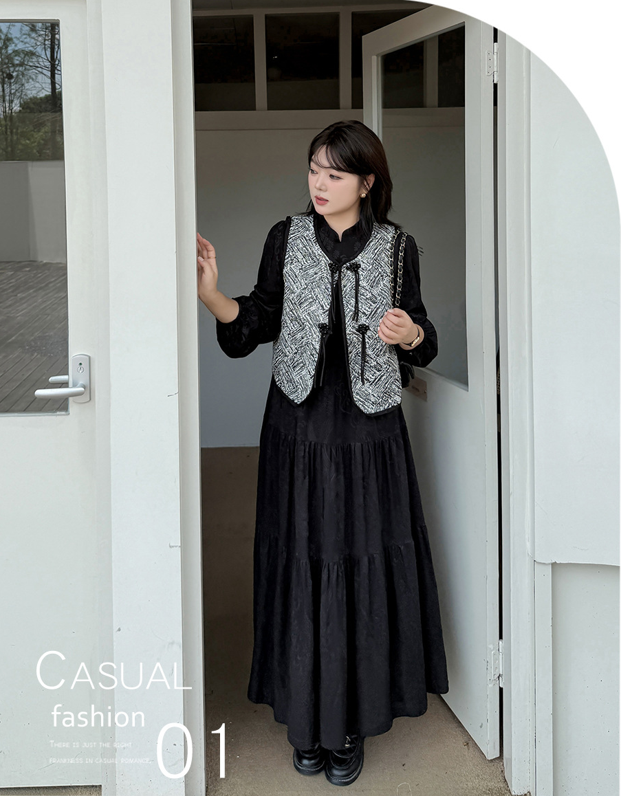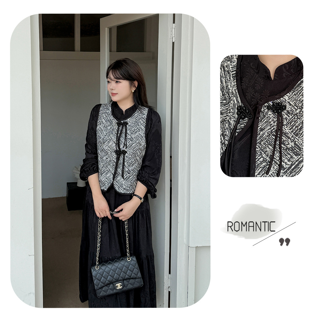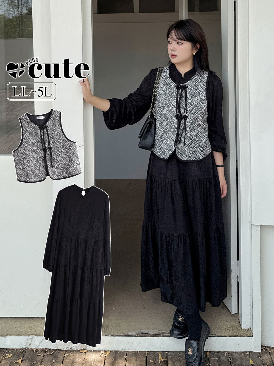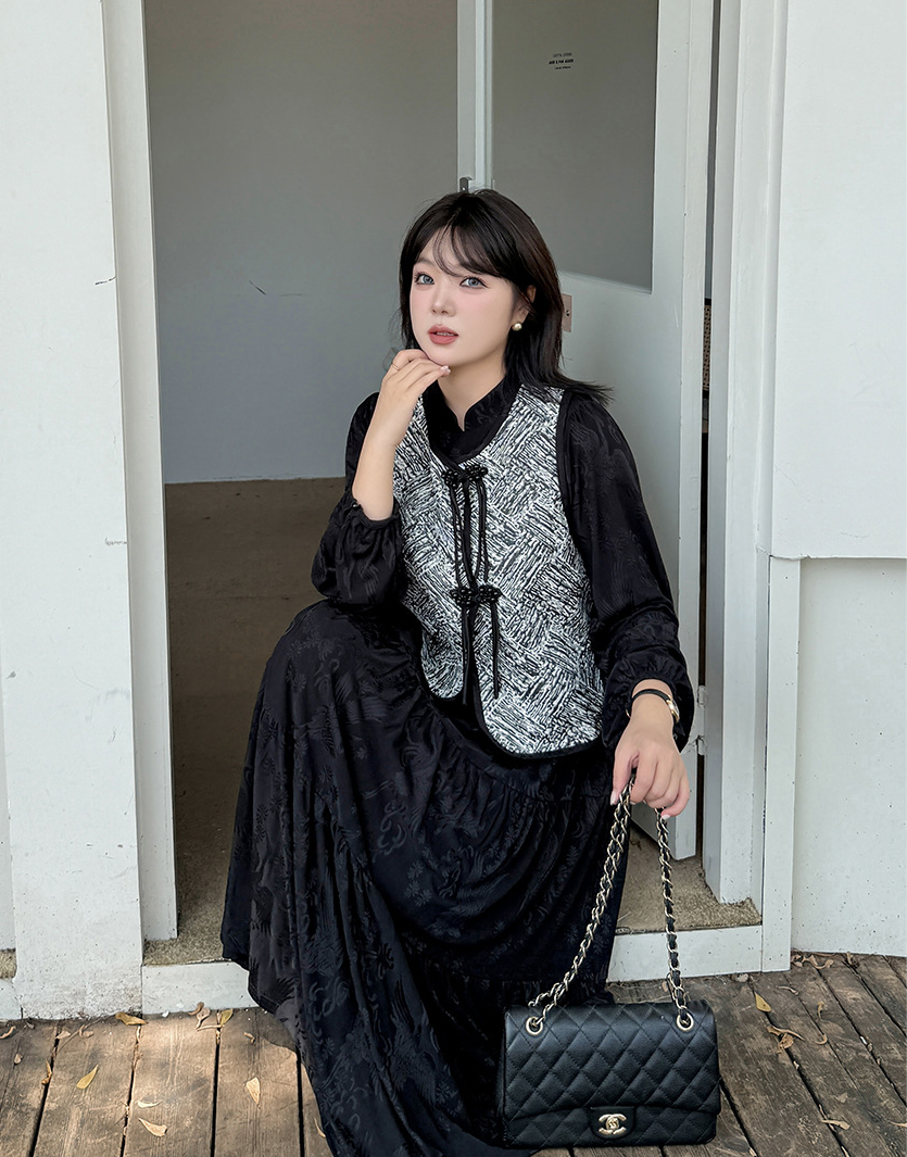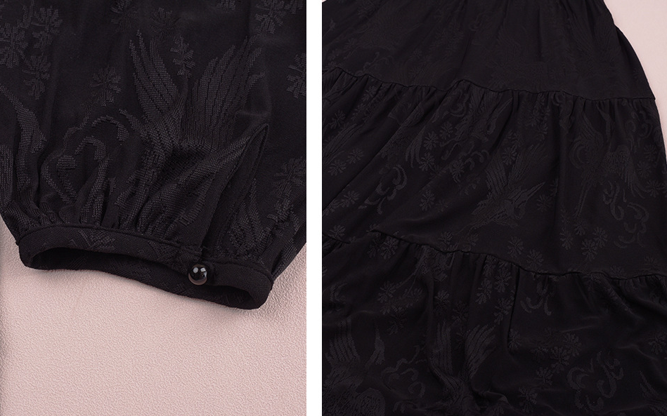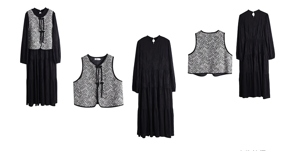 レトロスタイルのツーピース(ベスト+ニットワンピース)のベストは粗い花の織り素材で、織り柄はハリと厚みがあり、裏地付きです。黒のワンピースはストレッチニット素材を使用しています。ドレープ感があり、手に持った時の伸縮性も抜群です。内側には薄手のフリース裏地が付いています。ベストはレトロなタッセルボタンで飾られています。黒のワンピースは小さなスタンドカラーで、後ろの襟はボタンで留められ、後ろのウエストは伸縮性があります。裾はケーキスカートの形に作られ、シンプルですっきりとしたエレガントなスタイルです。