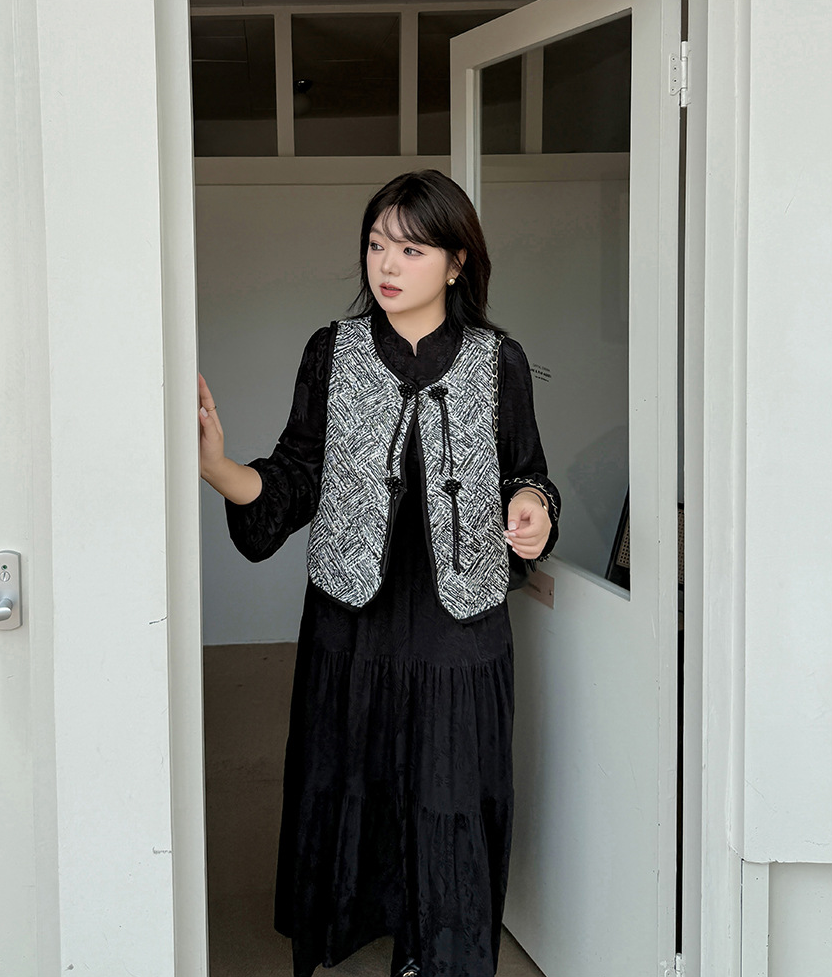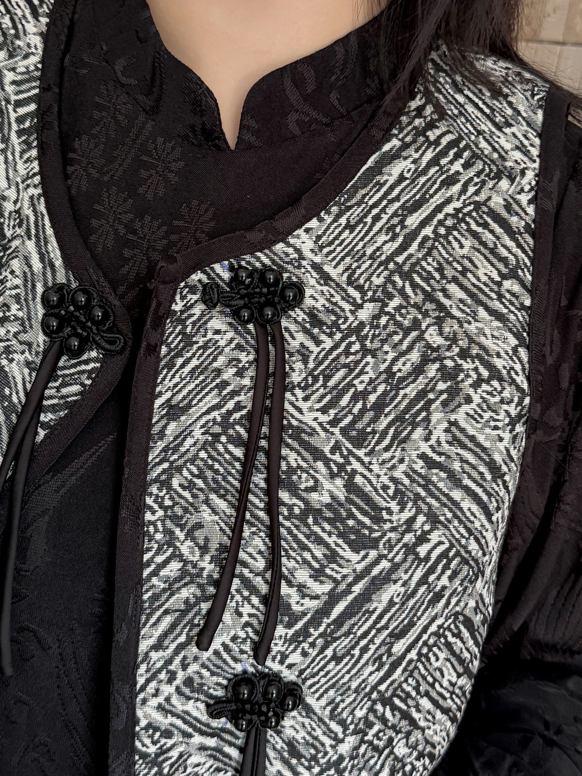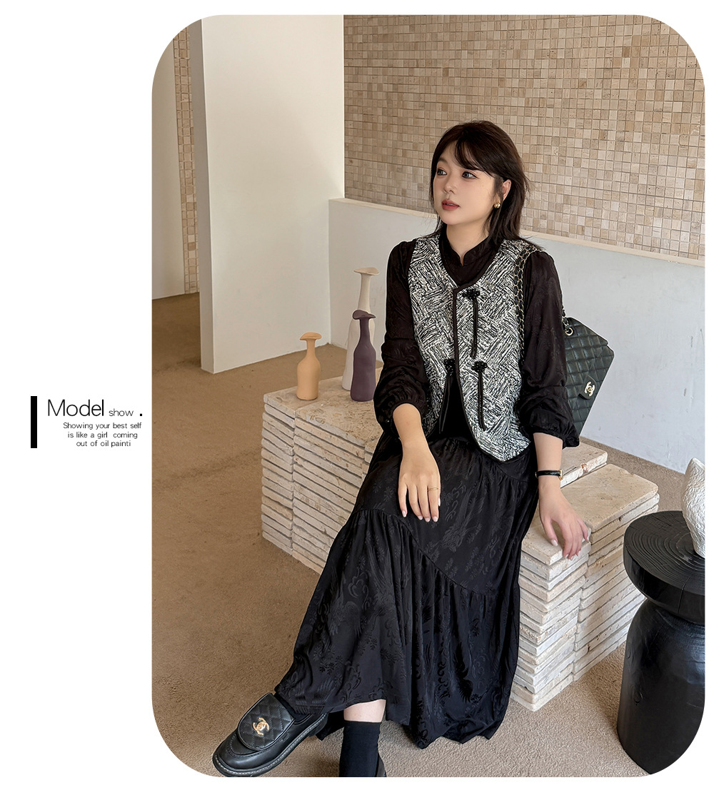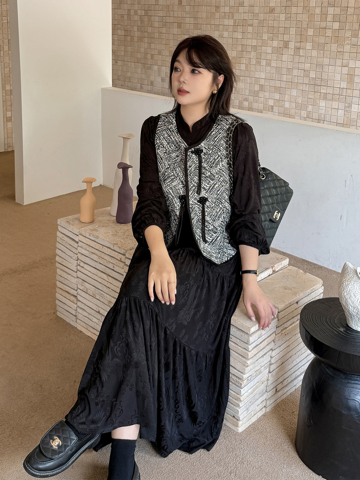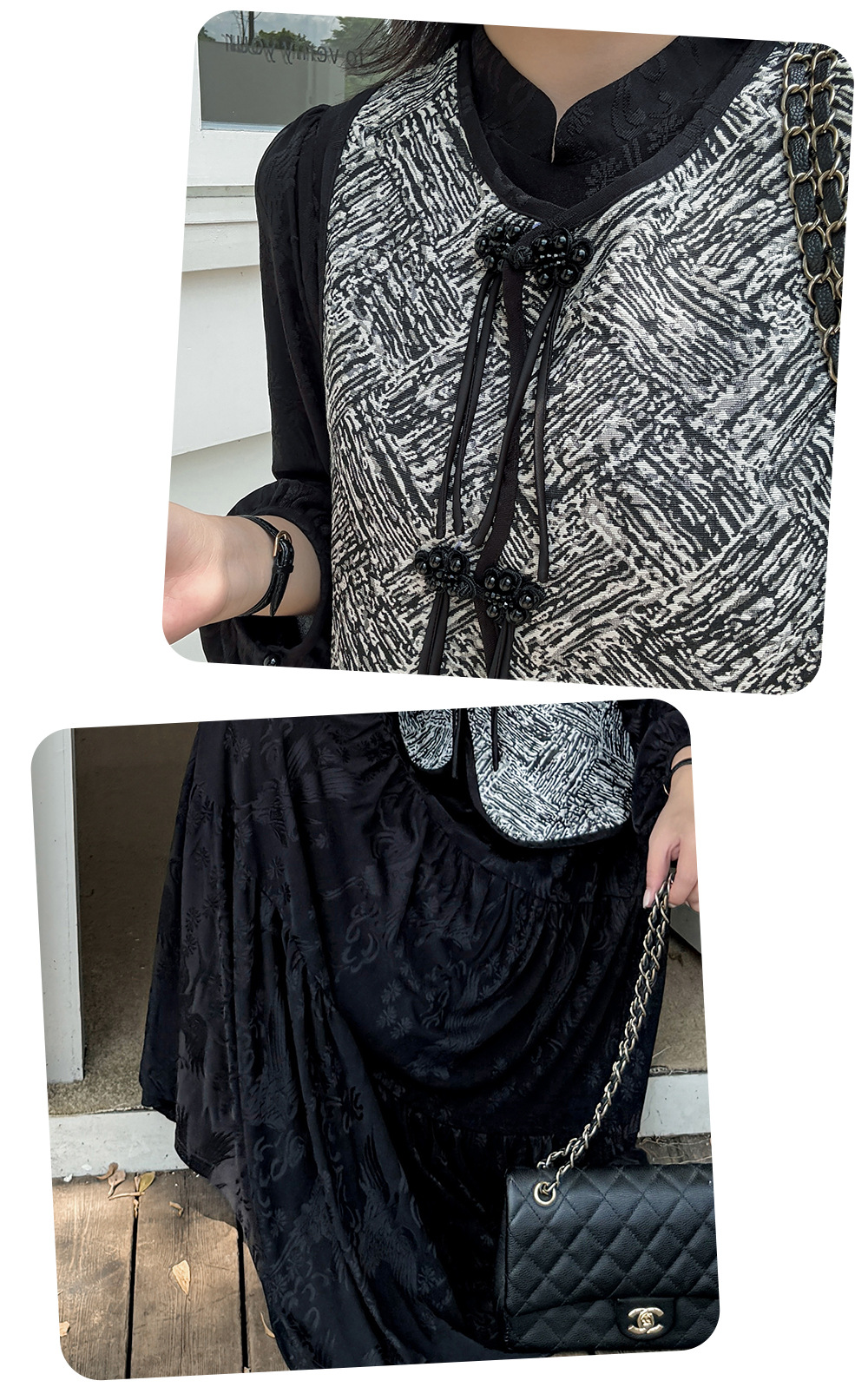 レトロスタイルのツーピース(ベスト+ニットワンピース)のベストは粗い花の織り素材で、織り柄はハリと厚みがあり、裏地付きです。黒のワンピースはストレッチニット素材を使用しています。ドレープ感があり、手に持った時の伸縮性も抜群です。内側には薄手のフリース裏地が付いています。ベストはレトロなタッセルボタンで飾られています。黒のワンピースは小さなスタンドカラーで、後ろの襟はボタンで留められ、後ろのウエストは伸縮性があります。裾はケーキスカートの形に作られ、シンプルですっきりとしたエレガントなスタイルです。