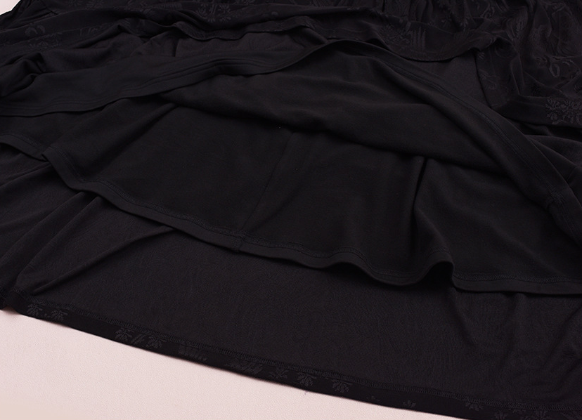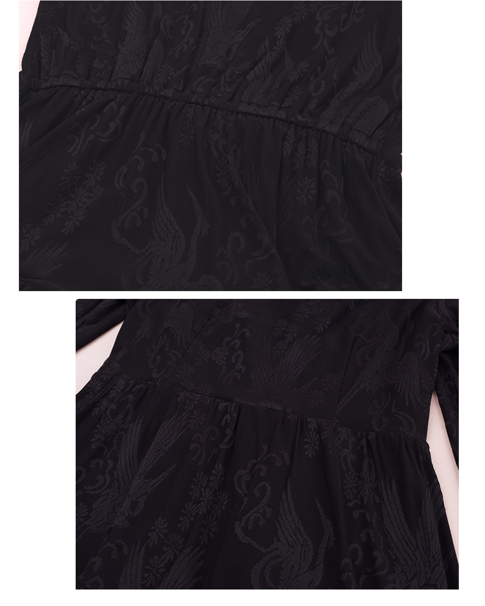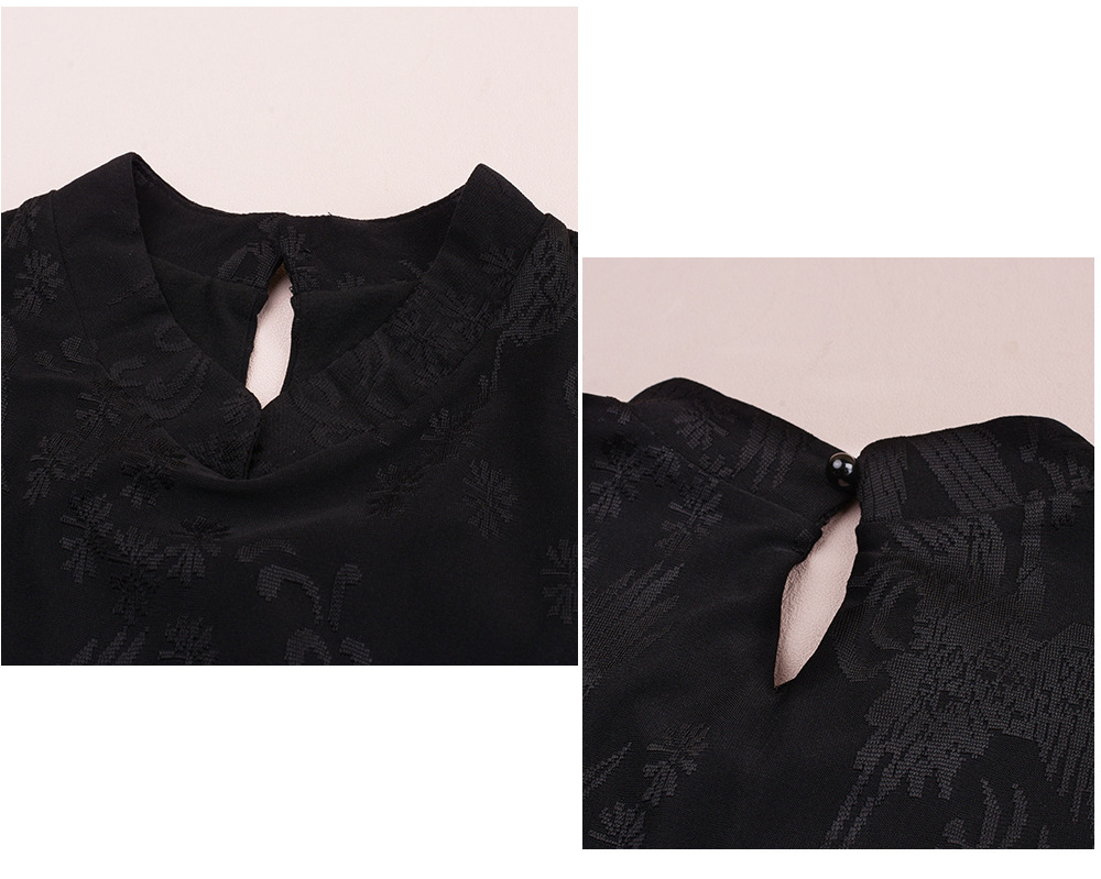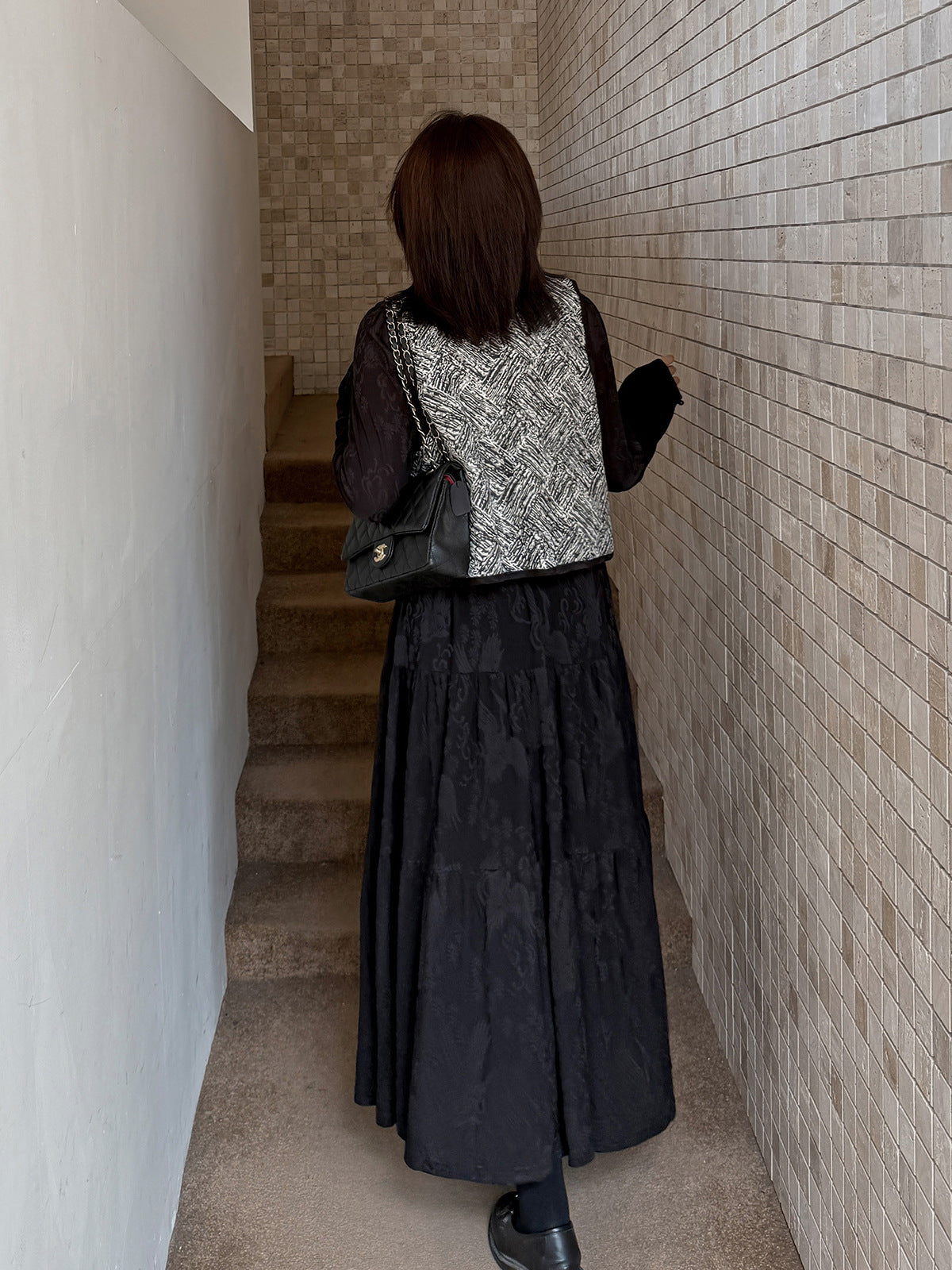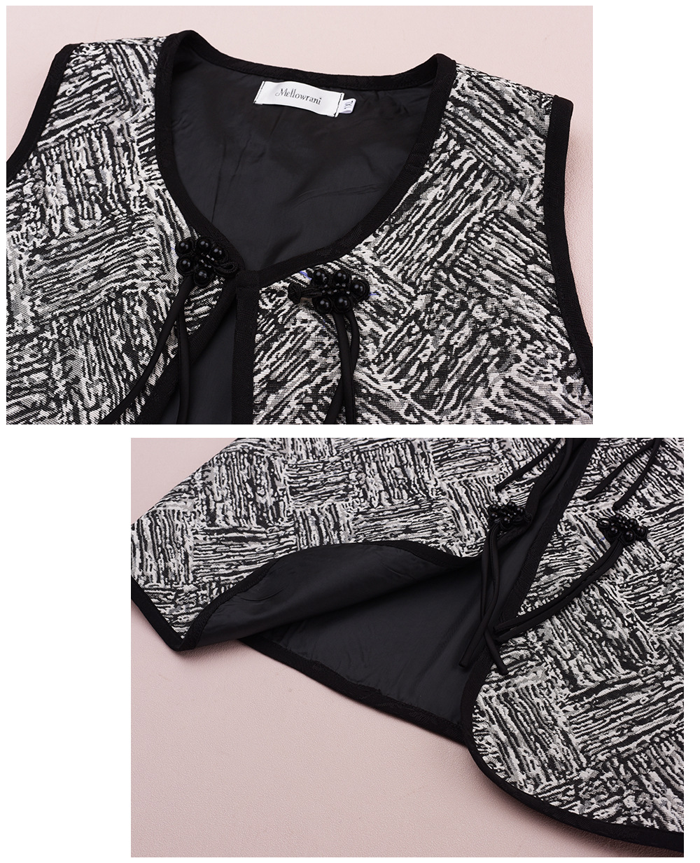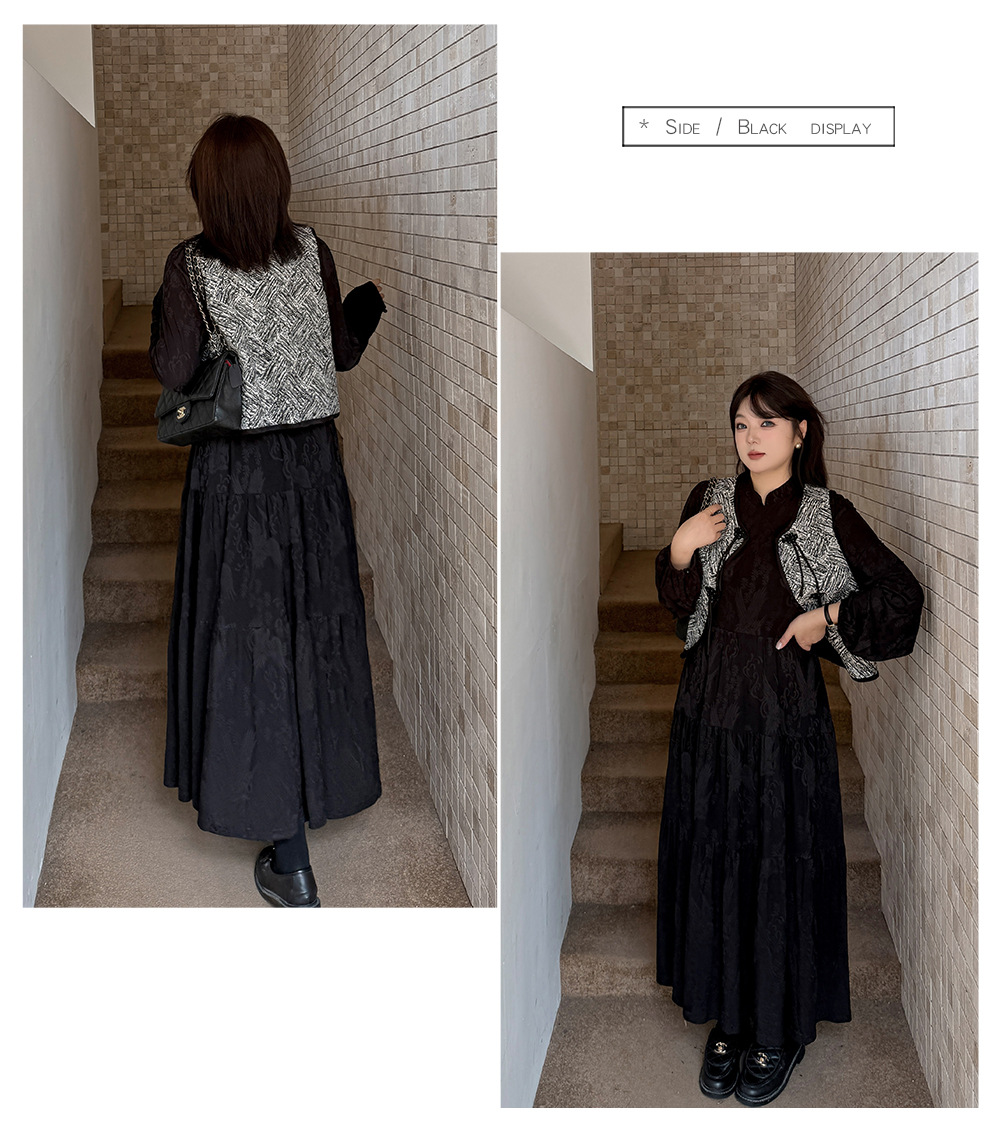 レトロスタイルのツーピース(ベスト+ニットワンピース)のベストは粗い花の織り素材で、織り柄はハリと厚みがあり、裏地付きです。黒のワンピースはストレッチニット素材を使用しています。ドレープ感があり、手に持った時の伸縮性も抜群です。内側には薄手のフリース裏地が付いています。ベストはレトロなタッセルボタンで飾られています。黒のワンピースは小さなスタンドカラーで、後ろの襟はボタンで留められ、後ろのウエストは伸縮性があります。裾はケーキスカートの形に作られ、シンプルですっきりとしたエレガントなスタイルです。