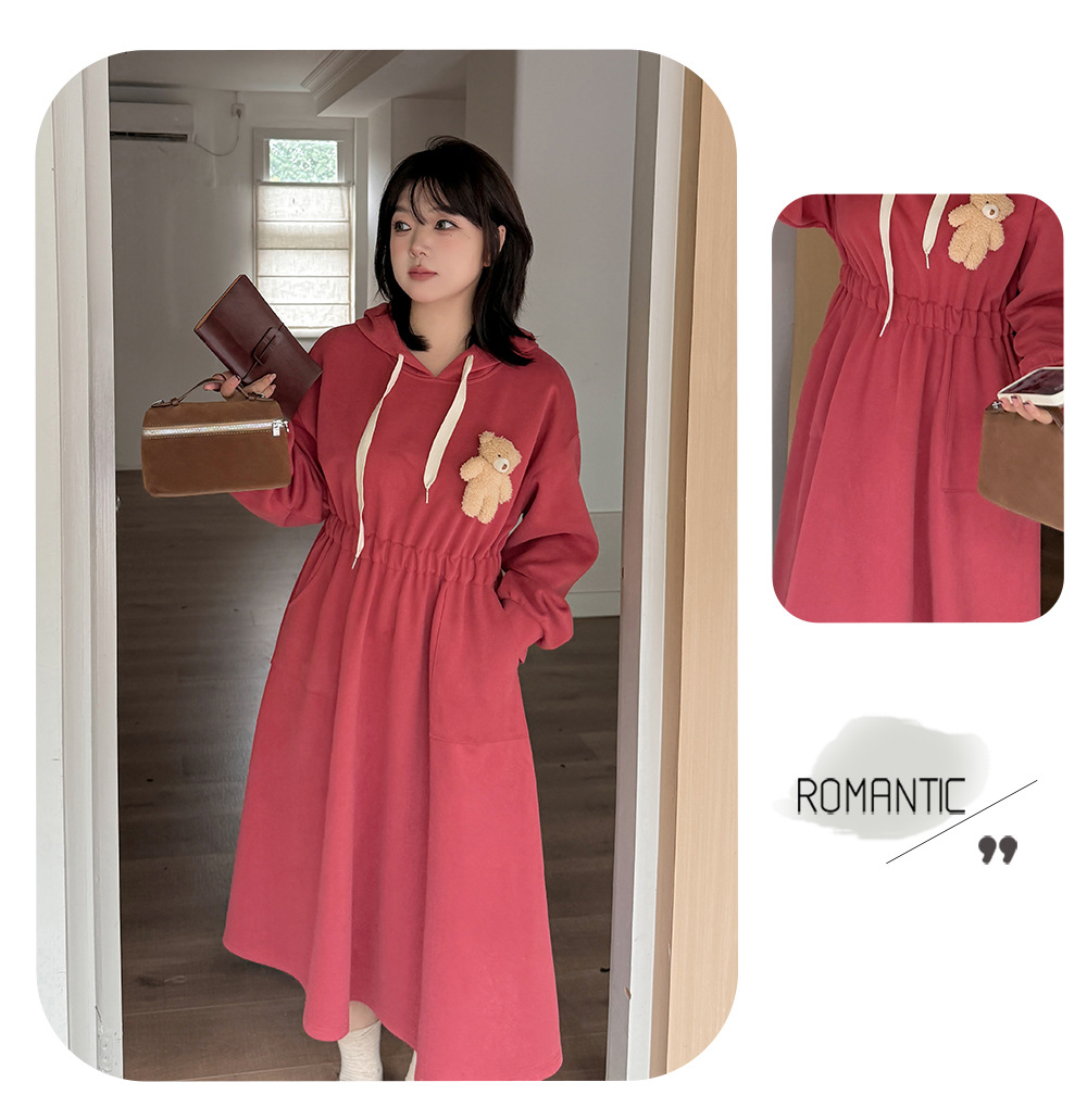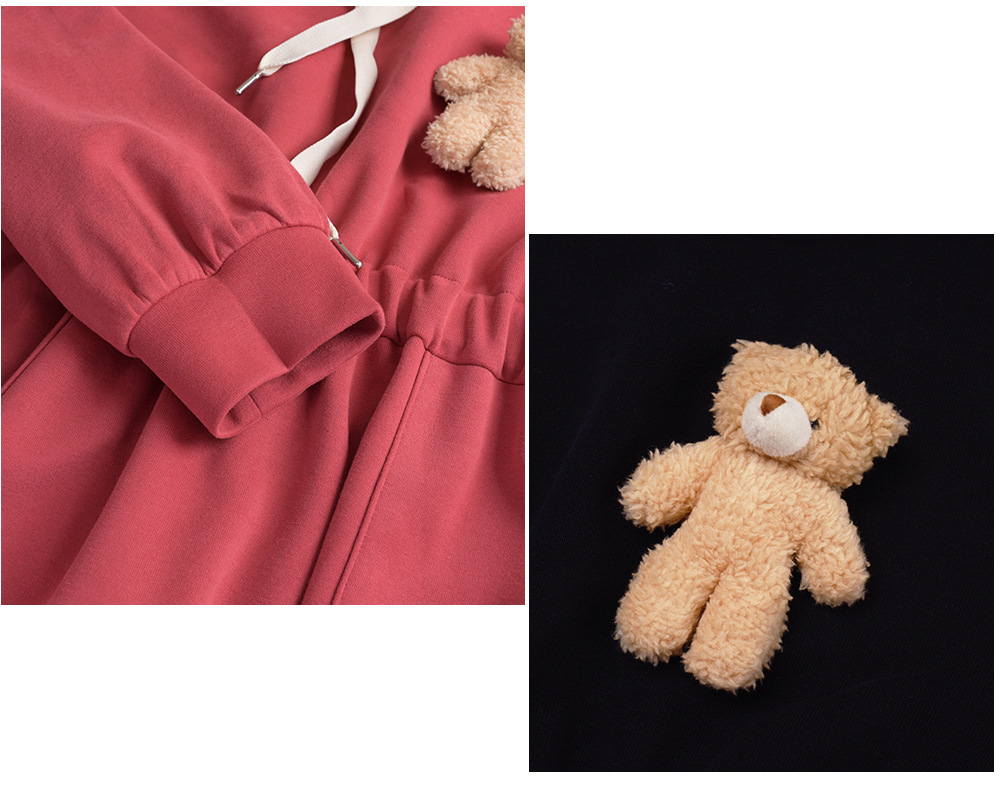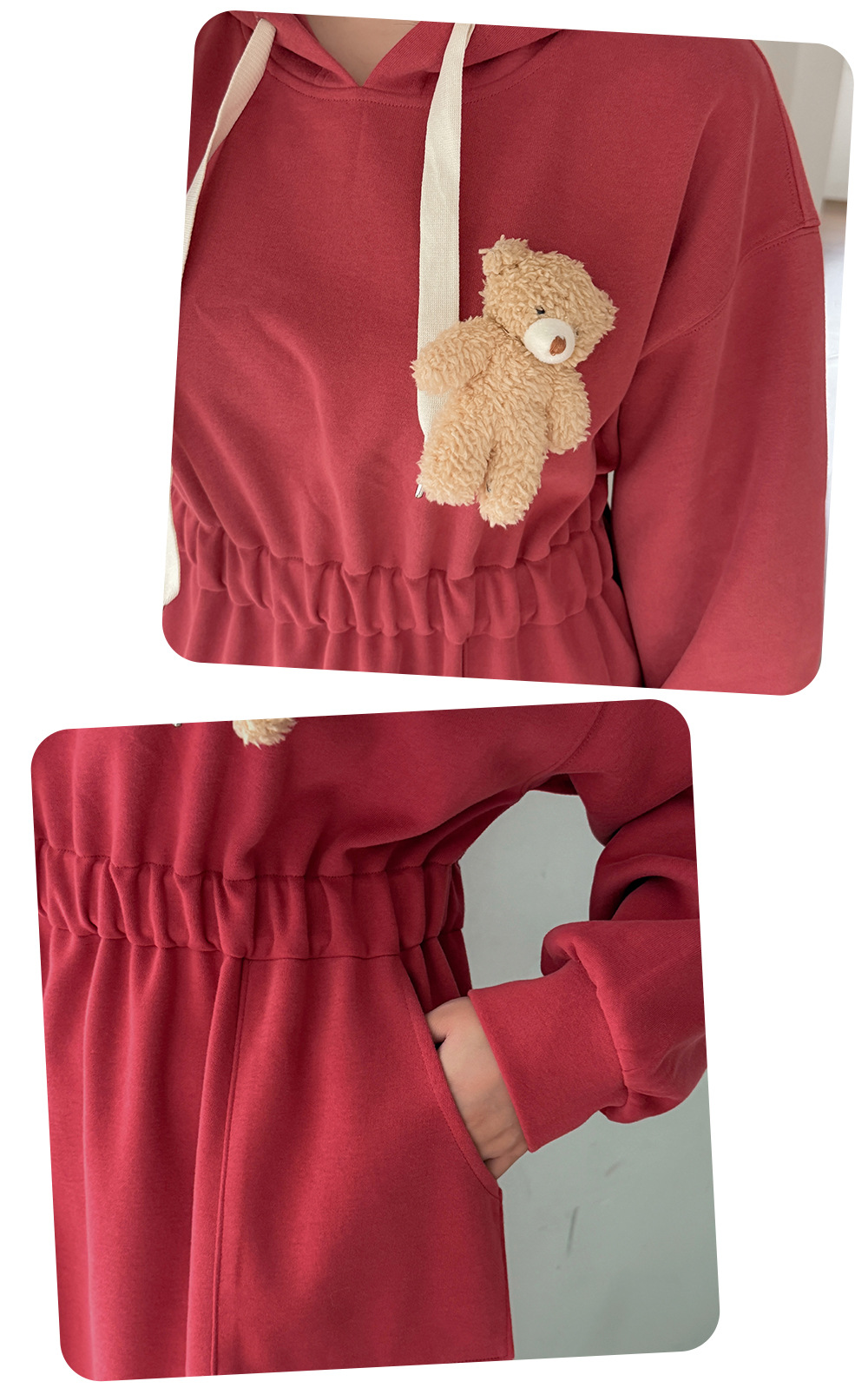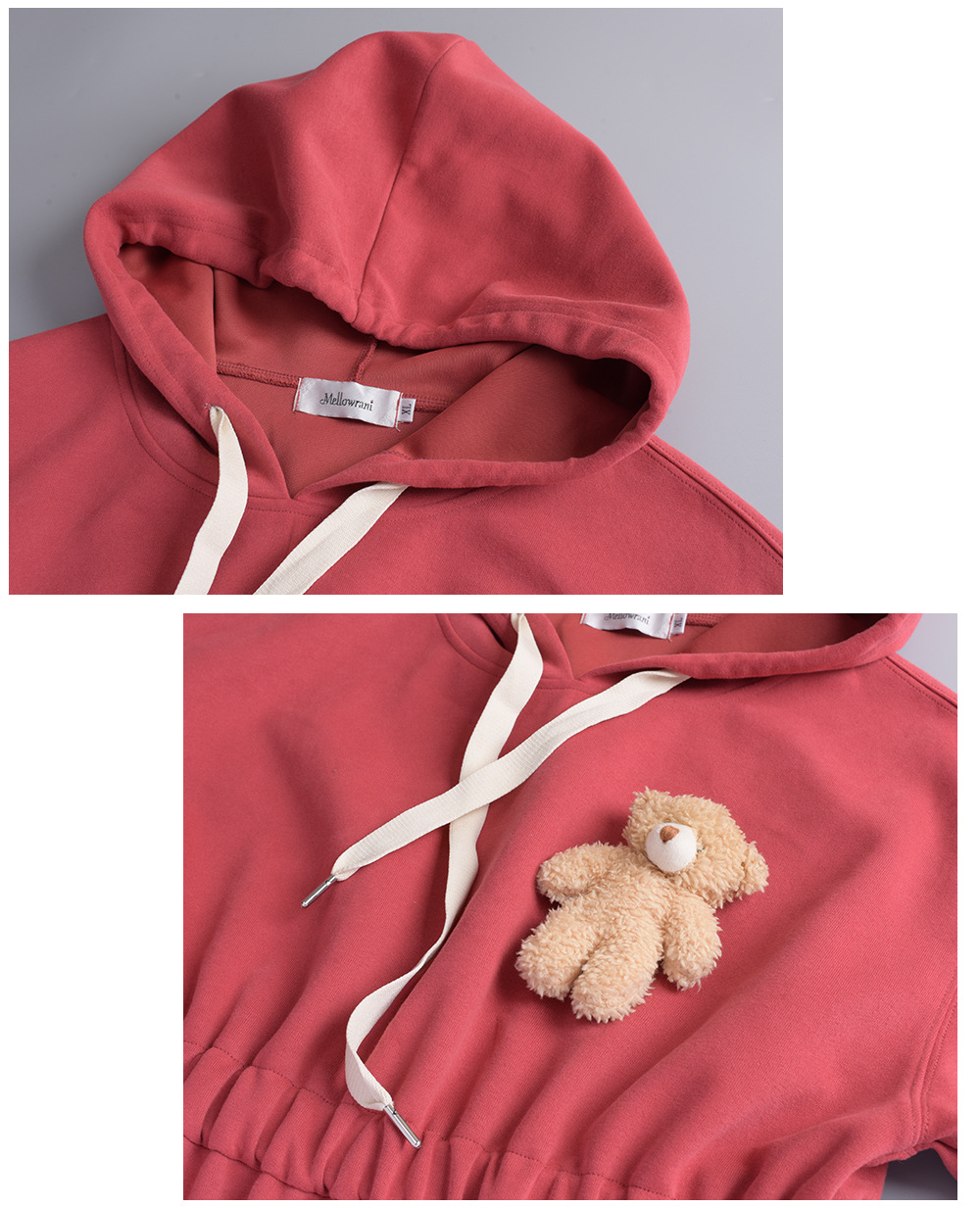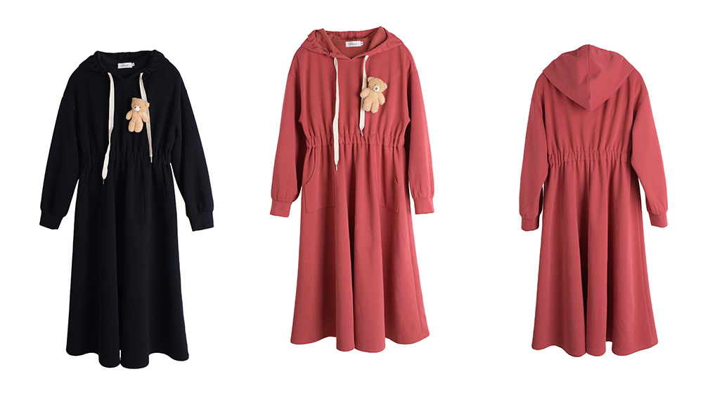 暖かくて厚みがあり、着心地の良いスウェットワンピース。ニット素材の合成コットン生地を使用し、密度が高く柔らかく、手に持つと重厚感があります。やや伸縮性のあるフードと、ネックラインに幅広のドローストリングが付いています。胸元には可愛いクマのマスコットが付いています。ゆったりとしたドロップショルダーです。ウエストはゴム仕様、フロントには大きなポケットが2つ付いています。大きなアンブレラ型の裾が可愛らしく、体型を補正し着痩せ効果も期待できます。カジュアルで年齢を感じさせないスタイルです。