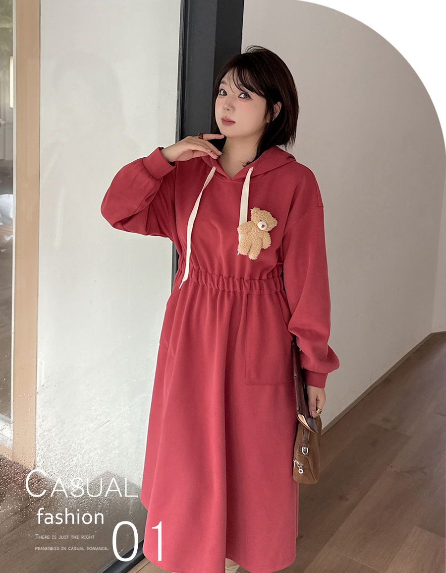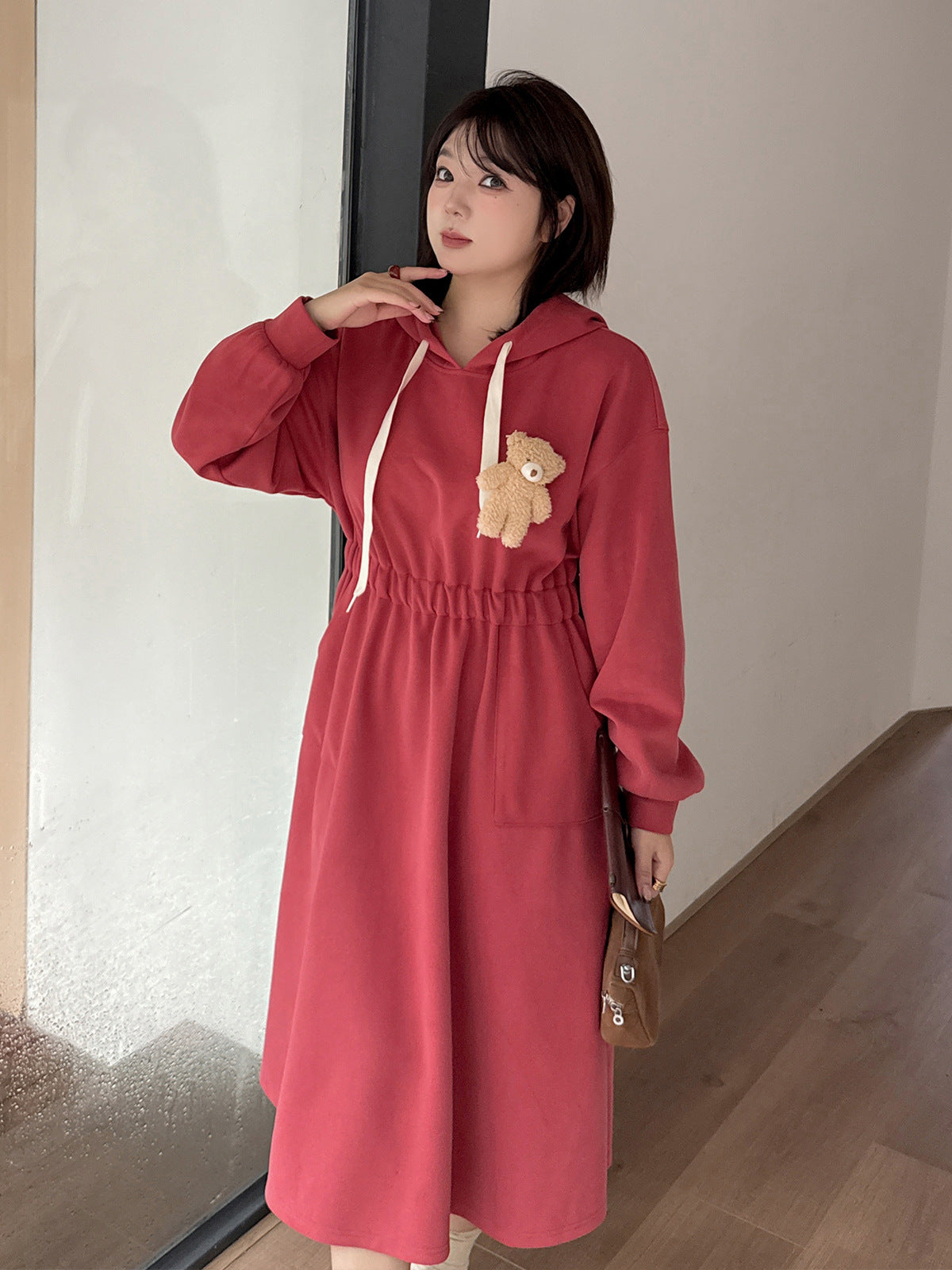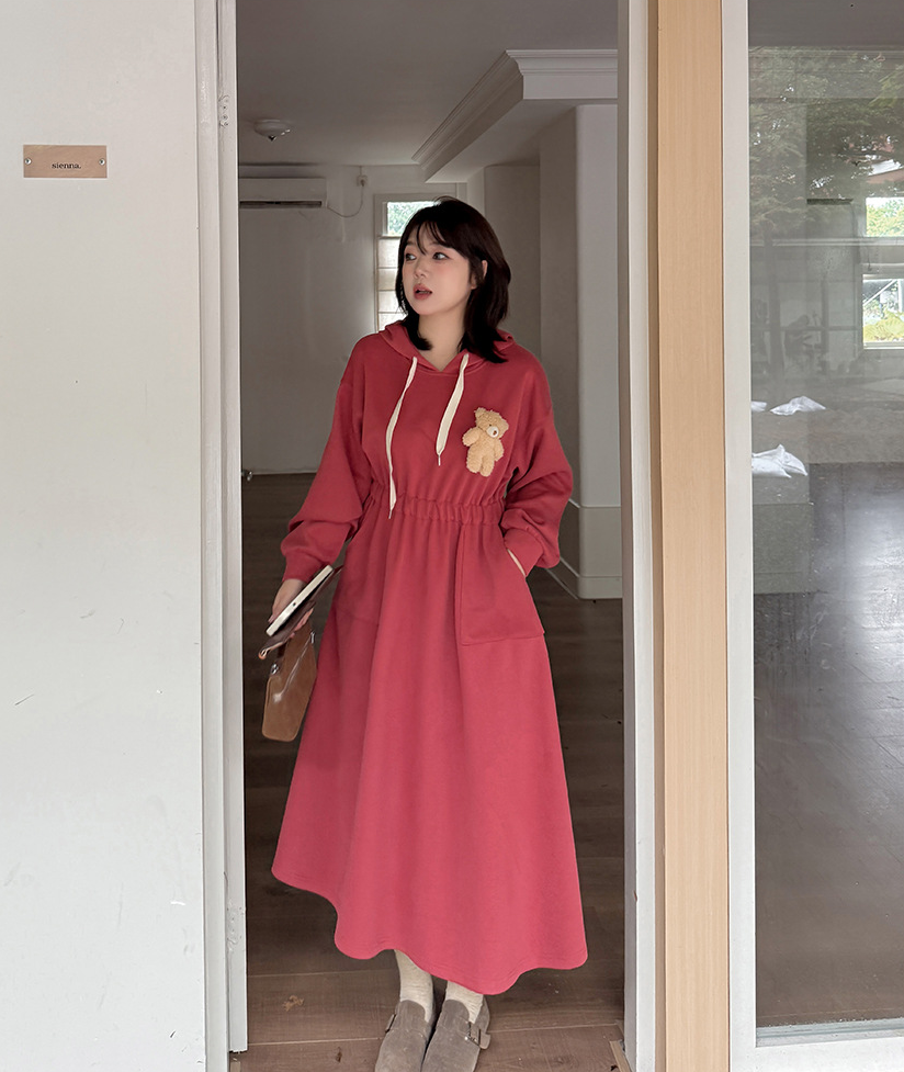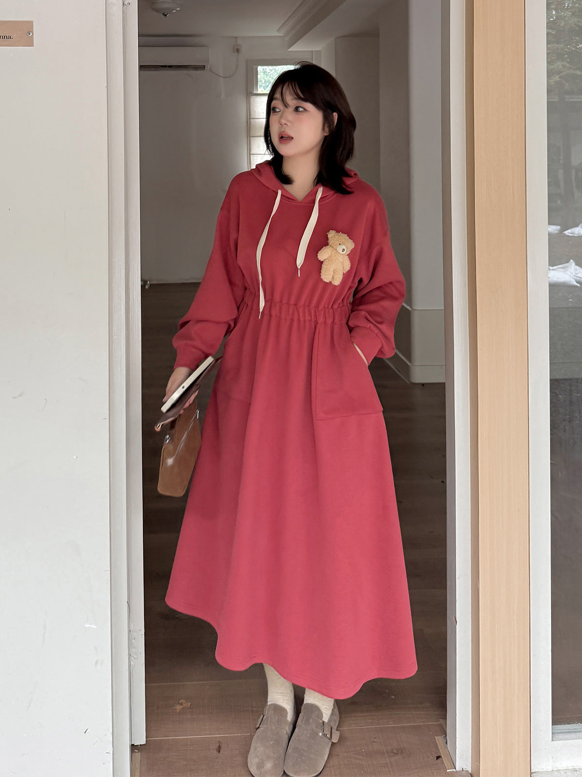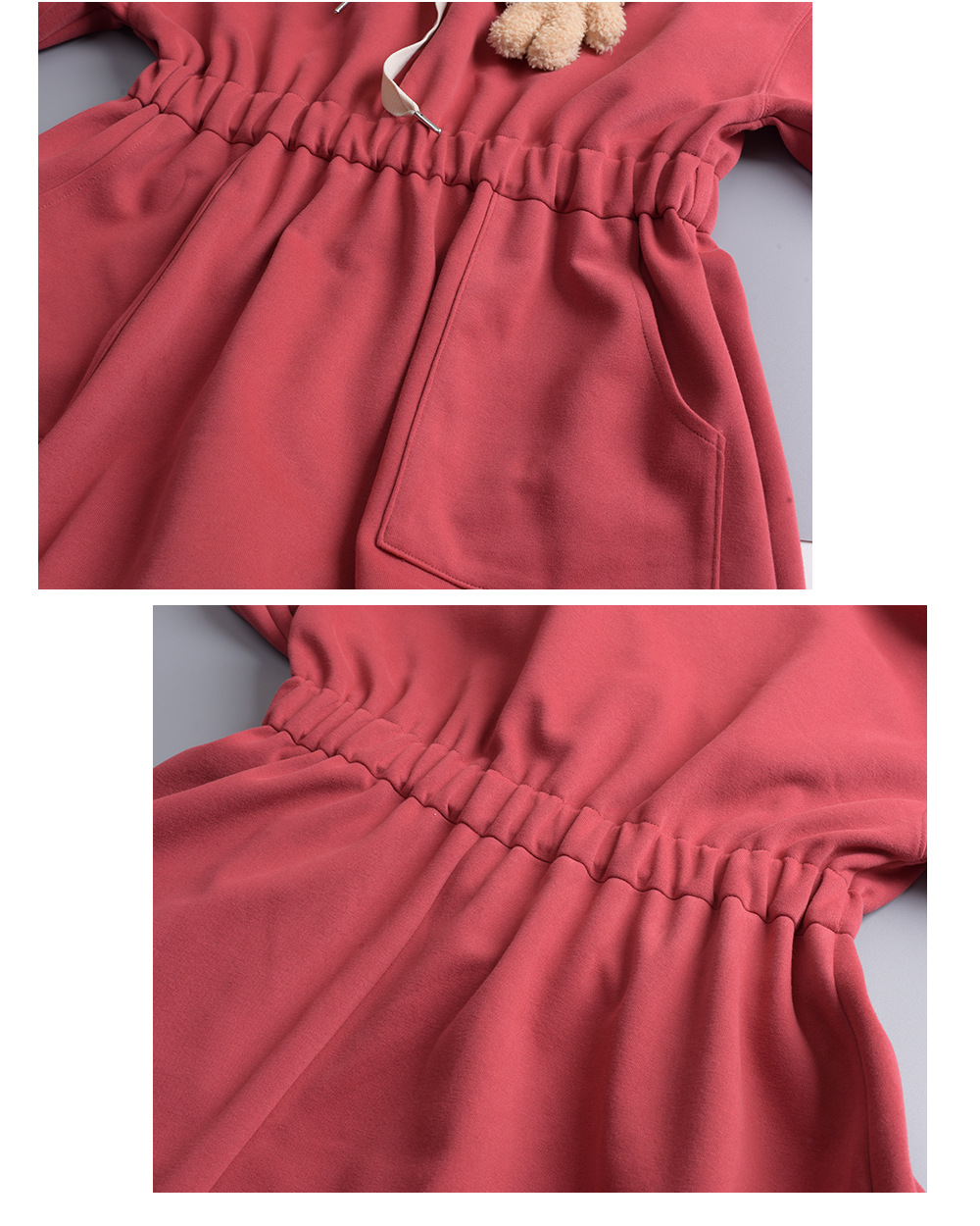 暖かくて厚みがあり、着心地の良いスウェットワンピース。ニット素材の合成コットン生地を使用し、密度が高く柔らかく、手に持つと重厚感があります。やや伸縮性のあるフードと、ネックラインに幅広のドローストリングが付いています。胸元には可愛いクマのマスコットが付いています。ゆったりとしたドロップショルダーです。ウエストはゴム仕様、フロントには大きなポケットが2つ付いています。大きなアンブレラ型の裾が可愛らしく、体型を補正し着痩せ効果も期待できます。カジュアルで年齢を感じさせないスタイルです。