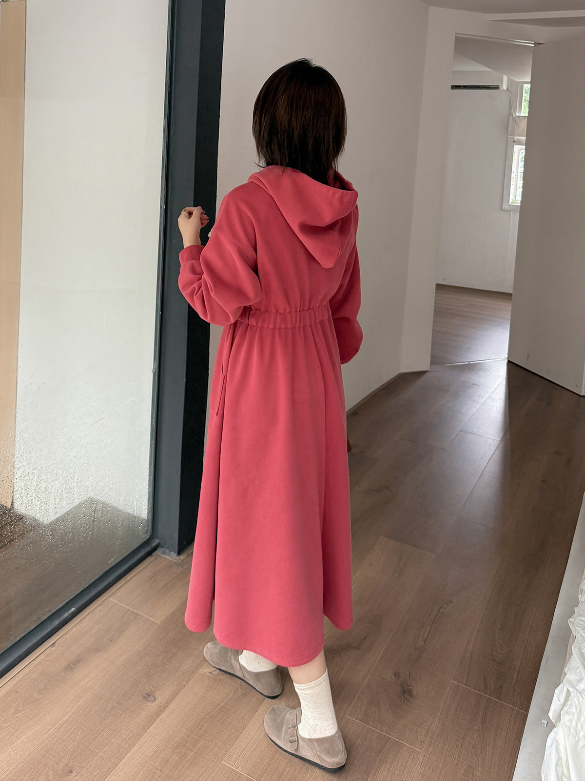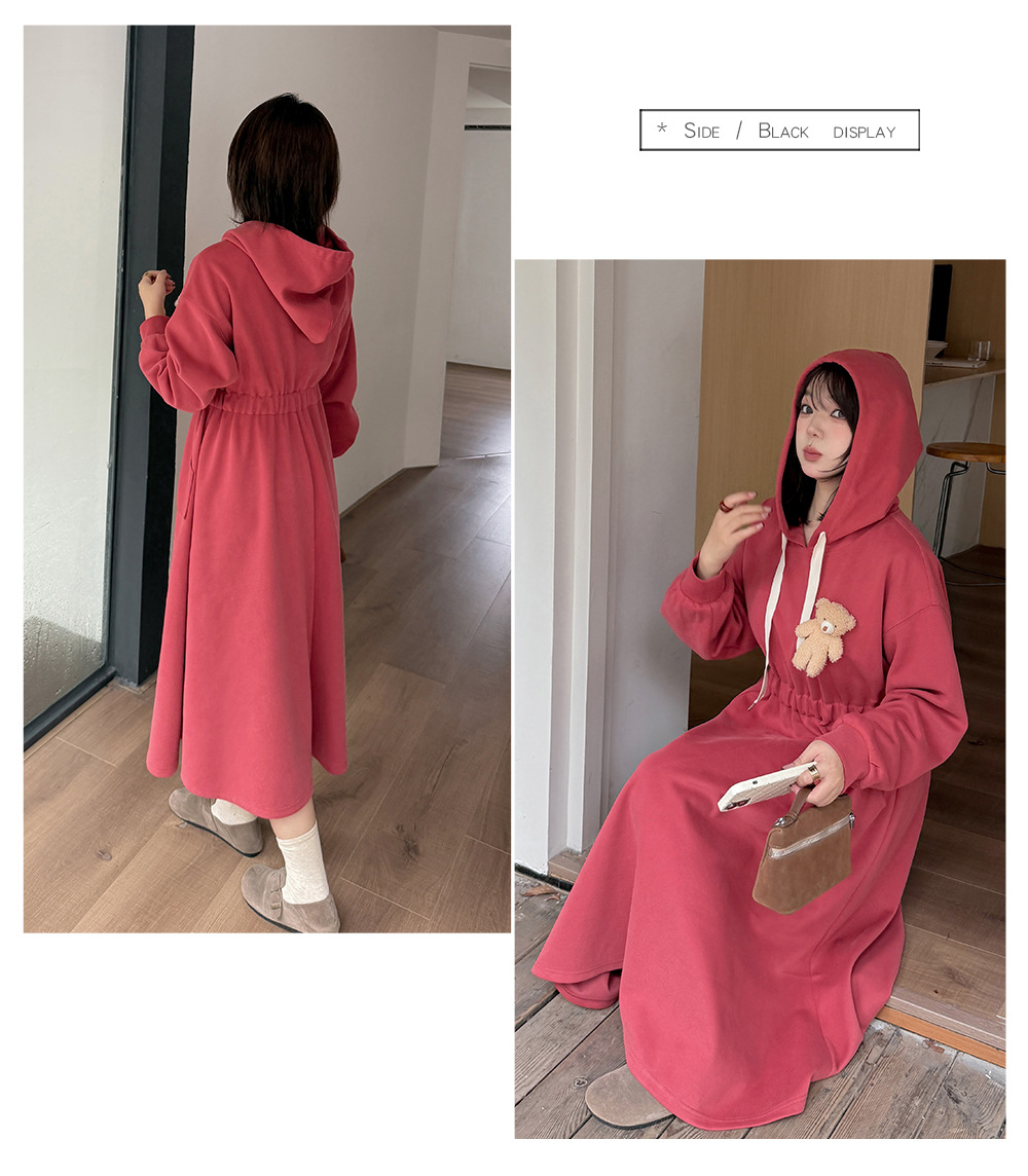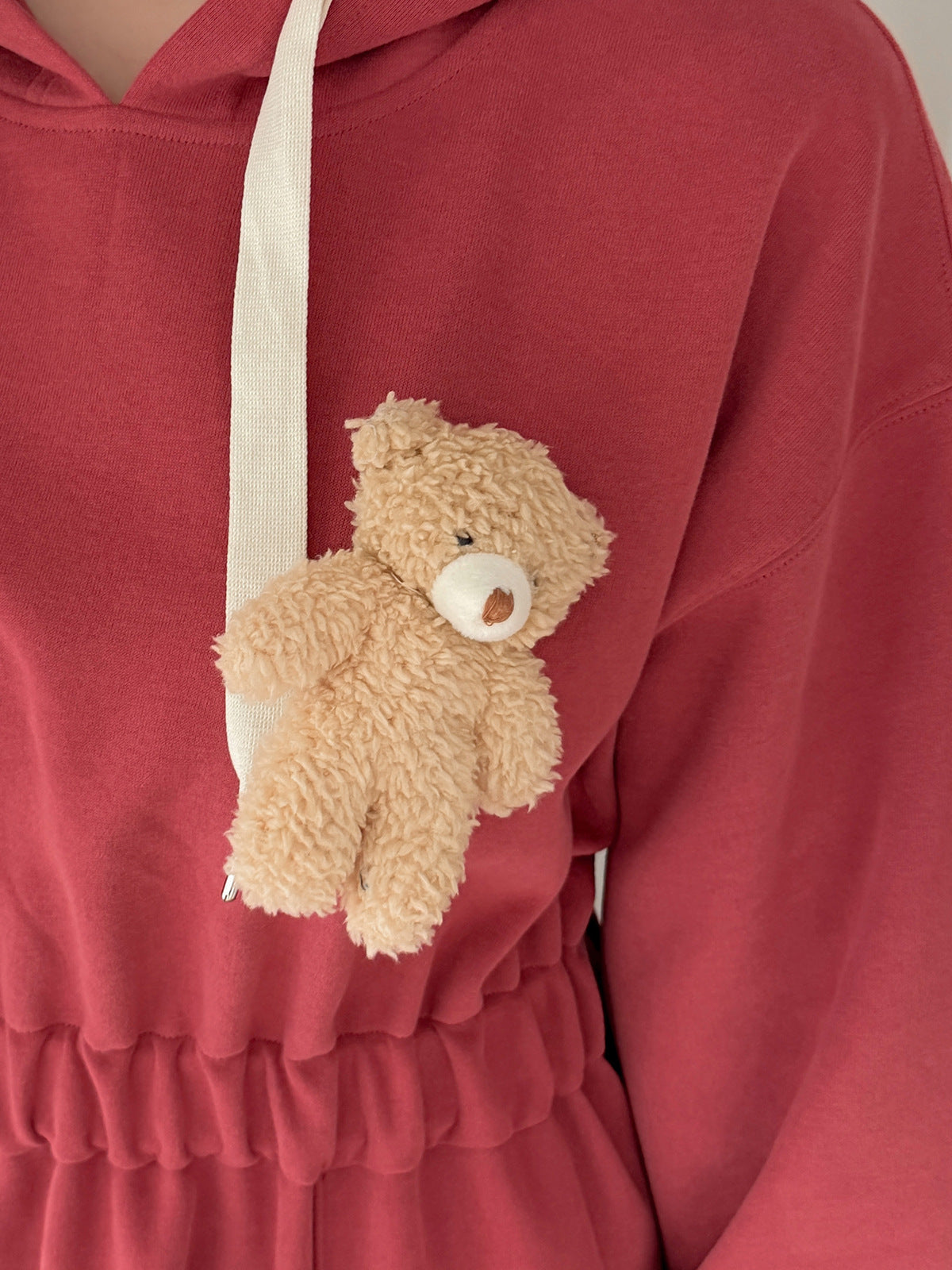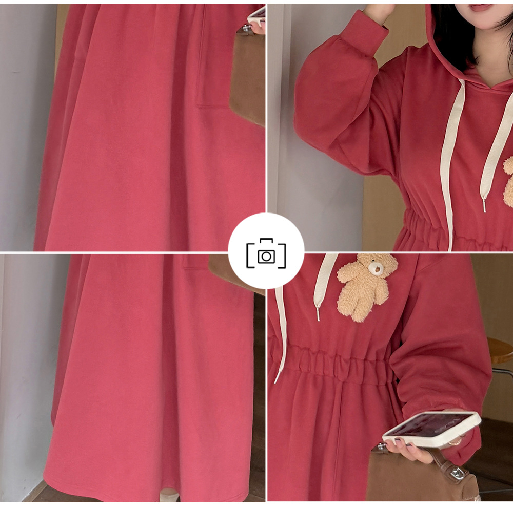 暖かくて厚みがあり、着心地の良いスウェットワンピース。ニット素材の合成コットン生地を使用し、密度が高く柔らかく、手に持つと重厚感があります。やや伸縮性のあるフードと、ネックラインに幅広のドローストリングが付いています。胸元には可愛いクマのマスコットが付いています。ゆったりとしたドロップショルダーです。ウエストはゴム仕様、フロントには大きなポケットが2つ付いています。大きなアンブレラ型の裾が可愛らしく、体型を補正し着痩せ効果も期待できます。カジュアルで年齢を感じさせないスタイルです。